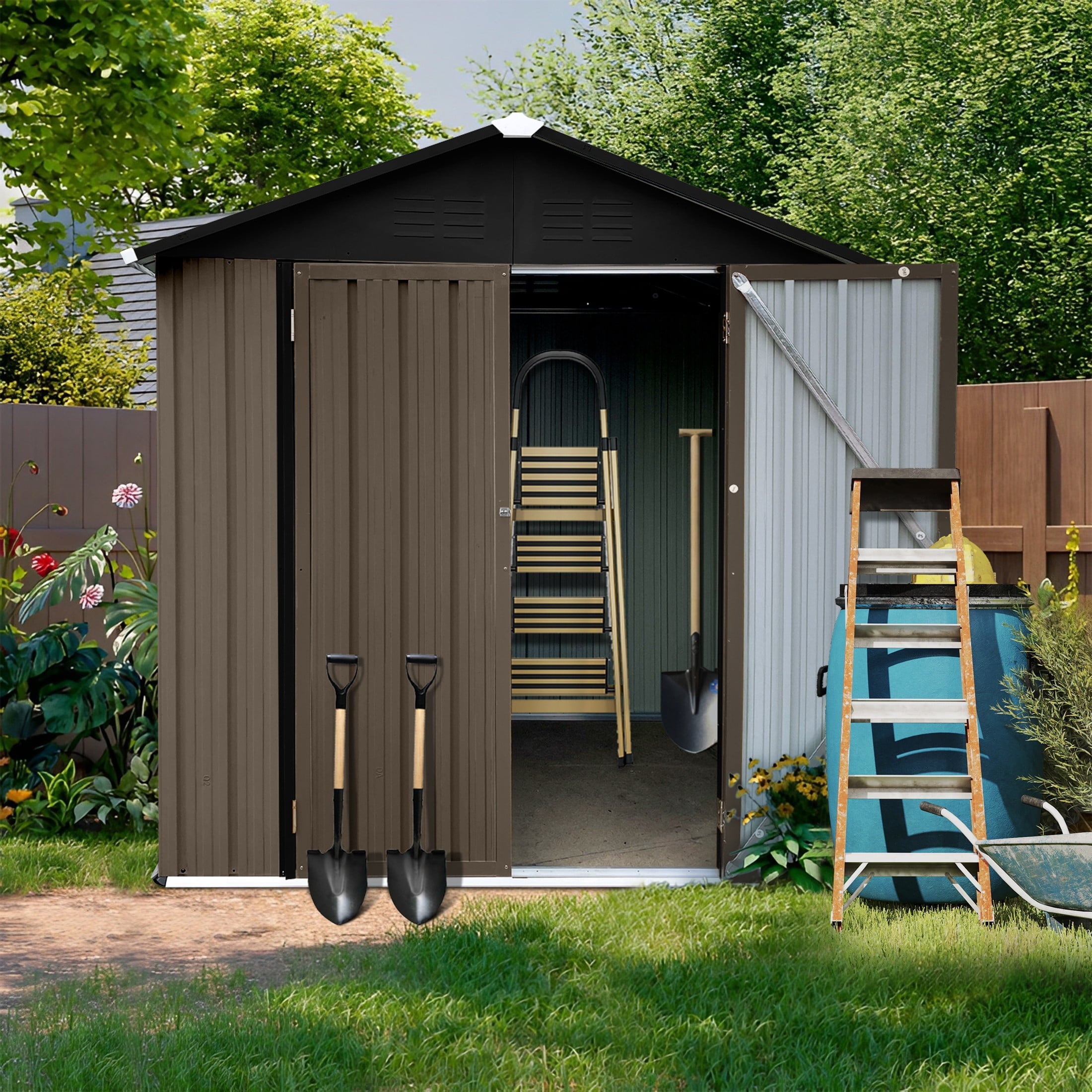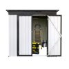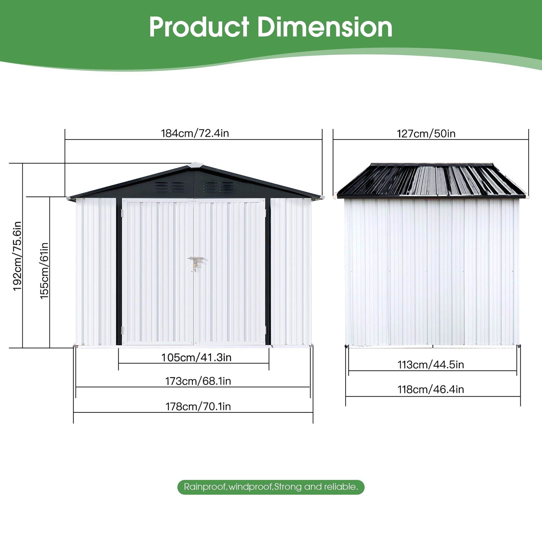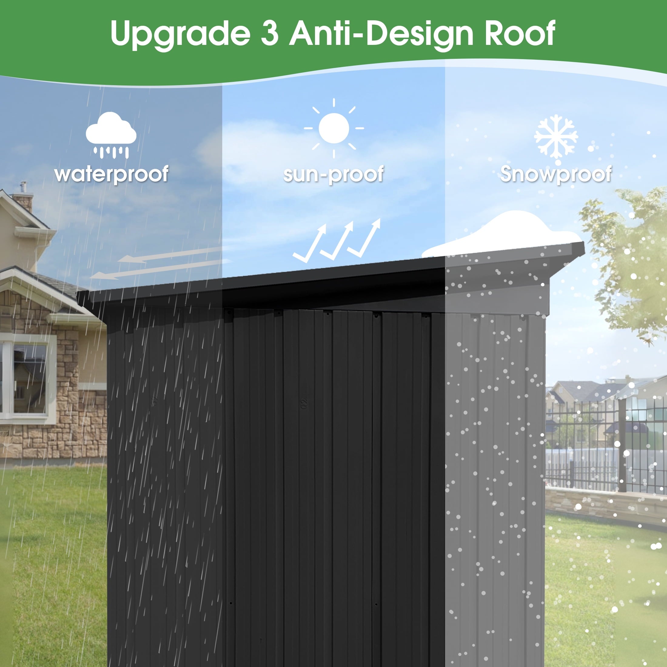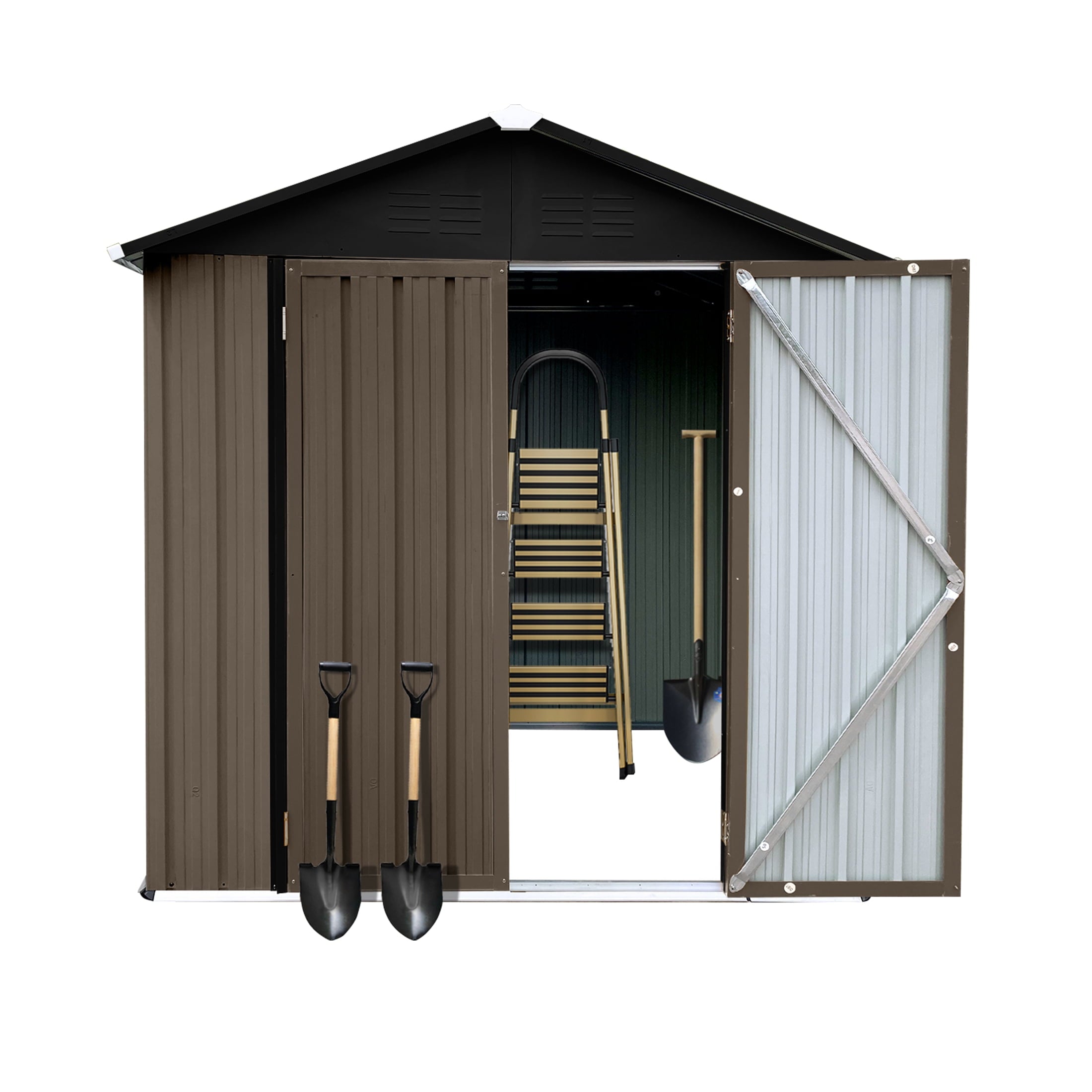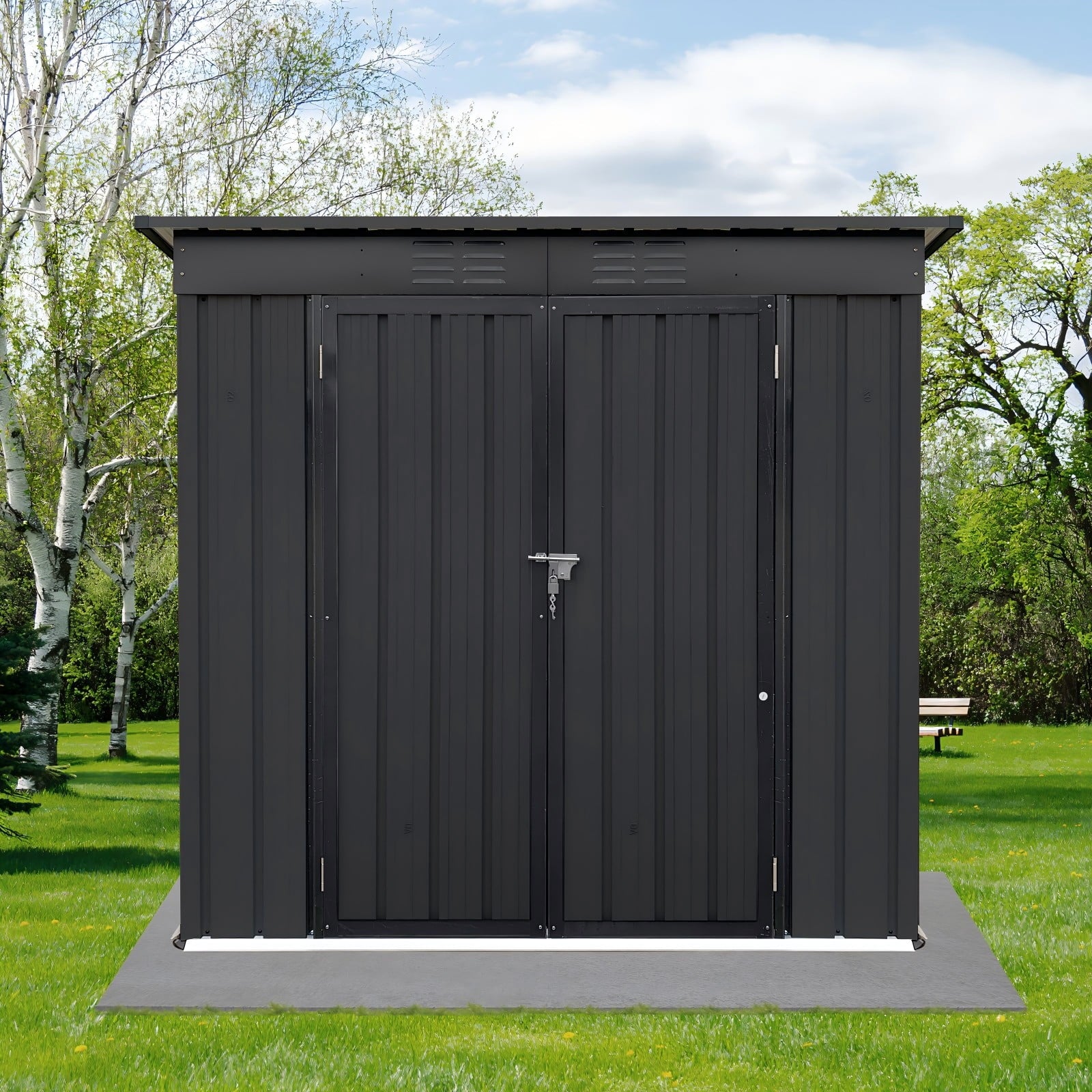 DURABLE AND WEATHER-RESISTANT – Unlike many sheds with plastic vents, this model features two integrated punched vents designed to resist sunlight degradation, ensuring optimal airflow. The galvanized steel panels are coated with an eco-friendly paint that can withstand harsh weather conditions for over 10 years, keeping your belongings safe and dry year-round.