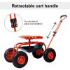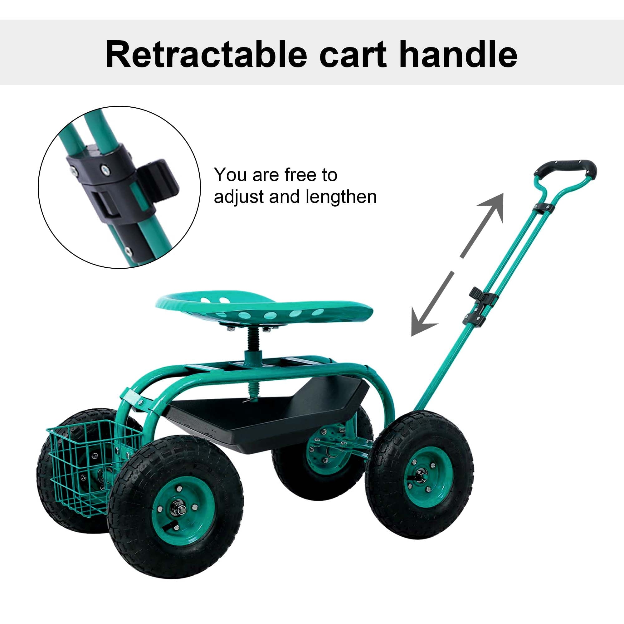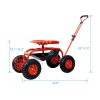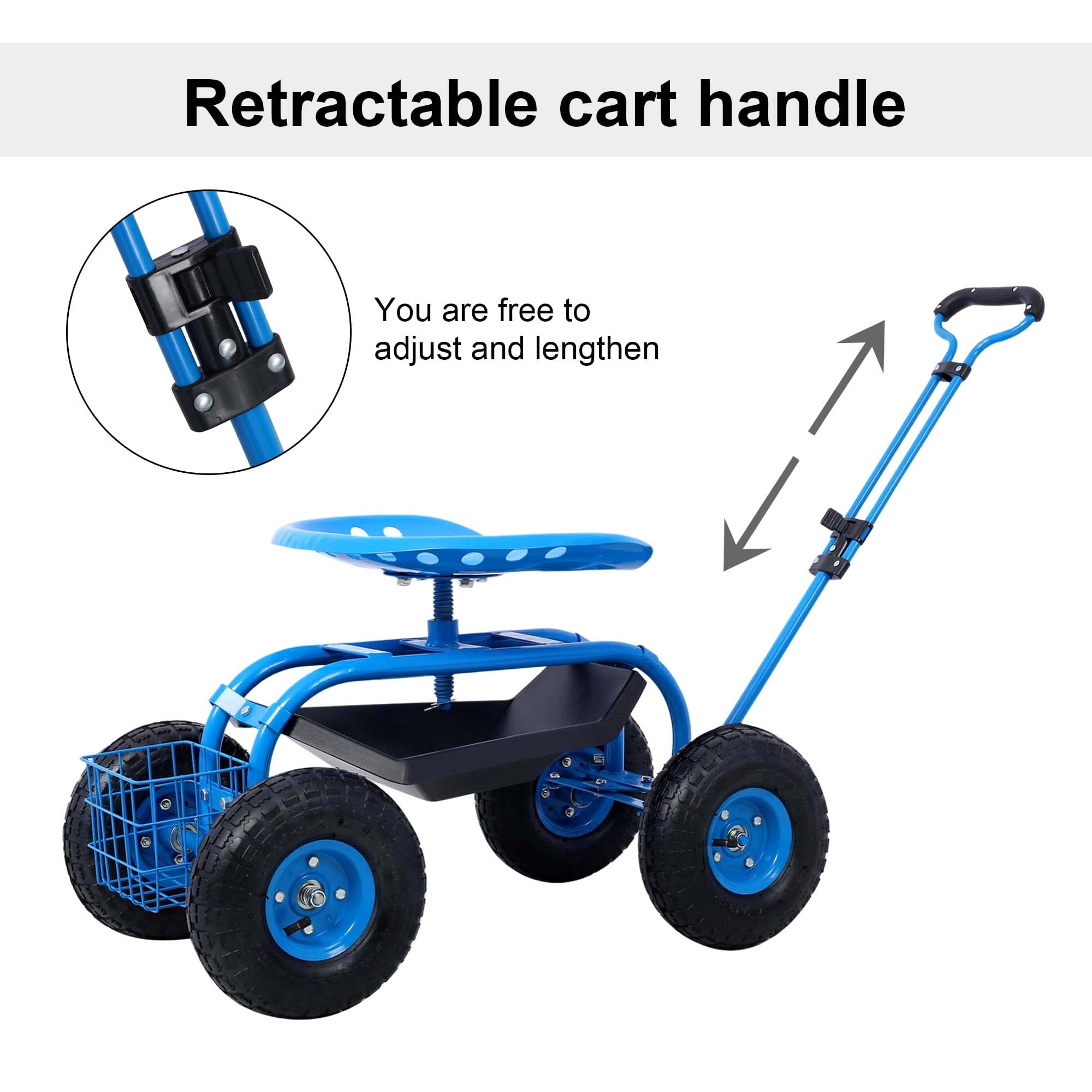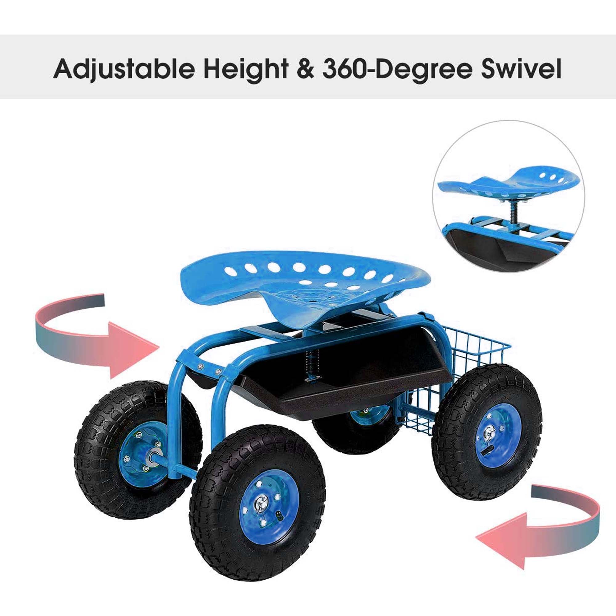 ERGONOMIC SWIVEL SEAT – The cart features a comfortable and ergonomic swivel seat, ideal for prolonged use. With its height adjustable and 360-degree swivel motion, you can effortlessly rotate the seat in any direction, improving efficiency while reducing physical strain during gardening tasks.