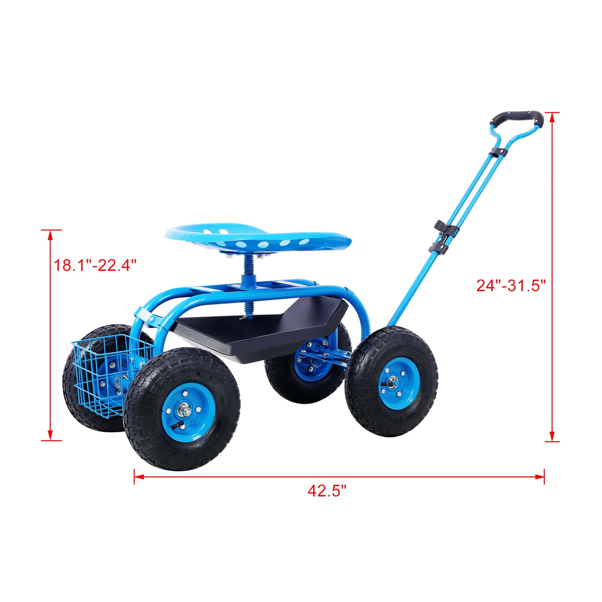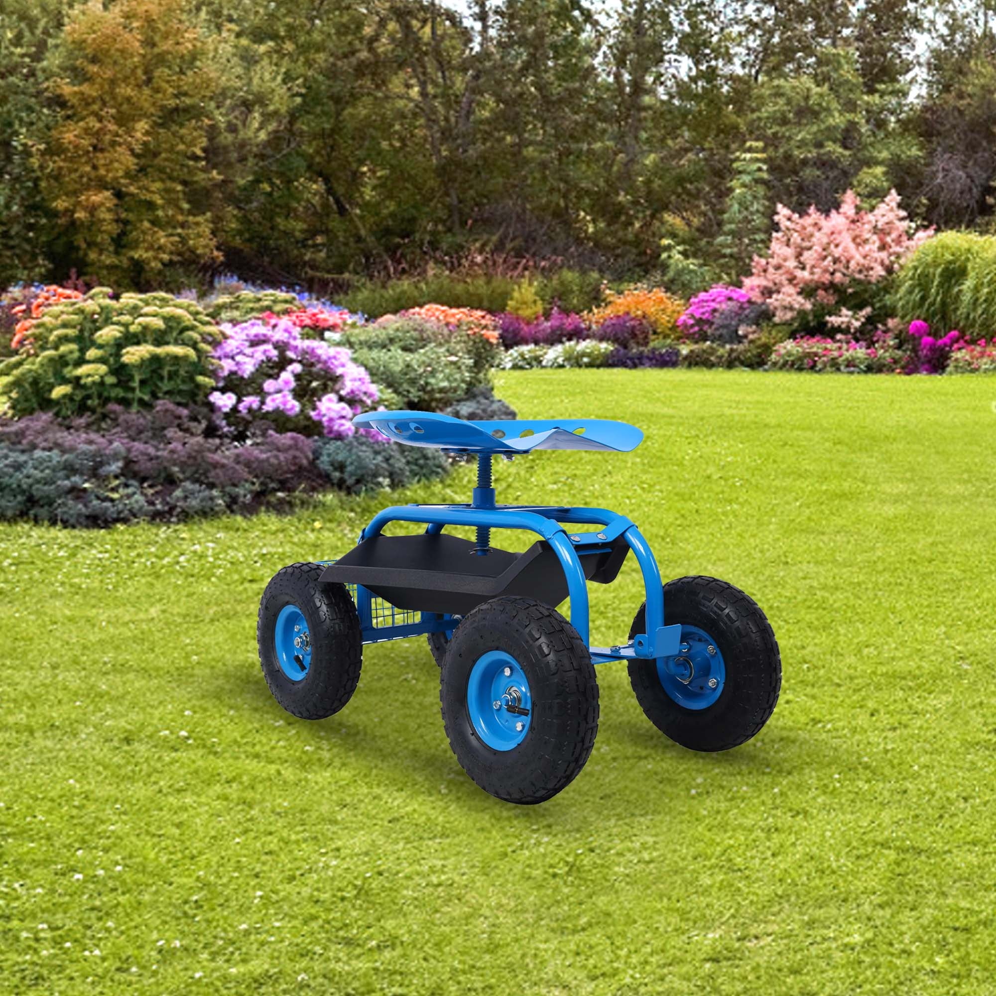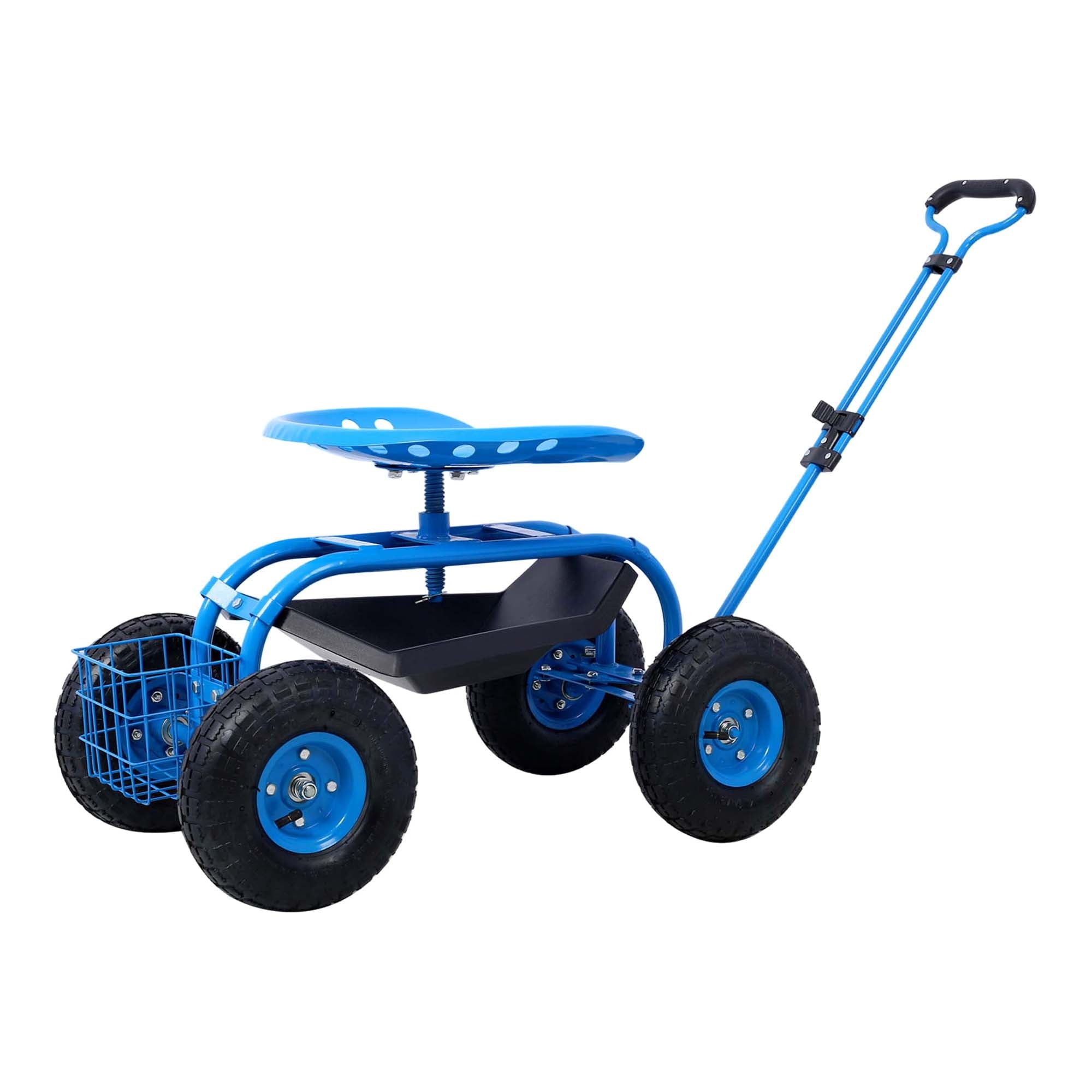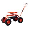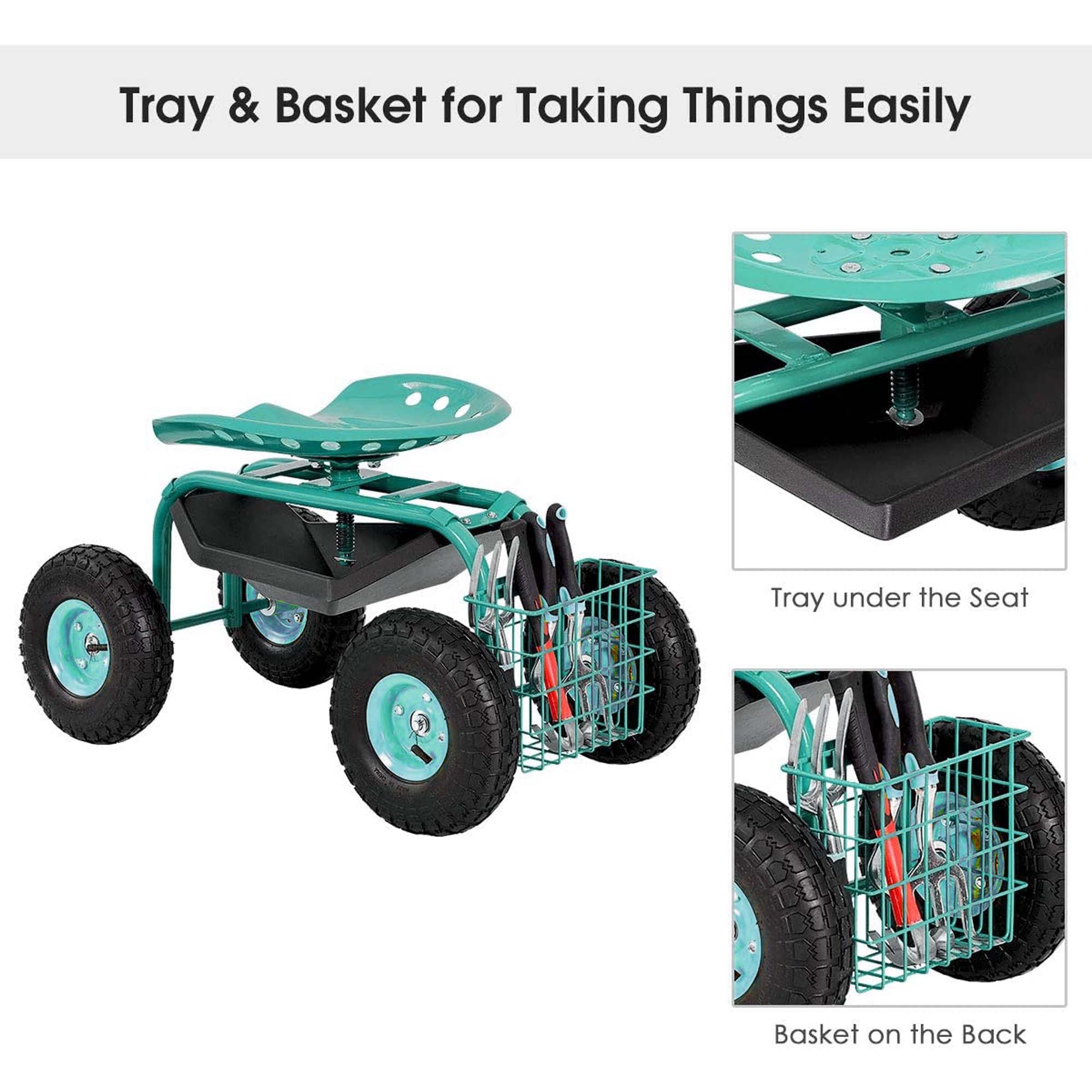 Aukfa AK-PGC1-001 this durable, heavy-duty Rolling Garden Scooter Cart, perfect for all your gardening tasks, is a must-have for your outdoor tool collection. Ideal for planting vegetable seeds, transplanting young plants, or any other garden work, this garden cart is designed with a large, comfortable steel seat, a 360-degree swivel motion feature, and an extendable handle for easy maneuverability. The robust, powder-coated steel frame, reinforced steel axles, and pneumatic tires with coated rims ensure longevity and reliability. It also includes a matching steel wire basket and a black plastic tool tray for convenient storage and accessibility of your essential gardening tools. With the added convenience of an extendable steering handle, moving this cart around your yard or garden becomes effortless. Enhance your gardening experience with this versatile, easy-to-use Garden Scooter Cart.