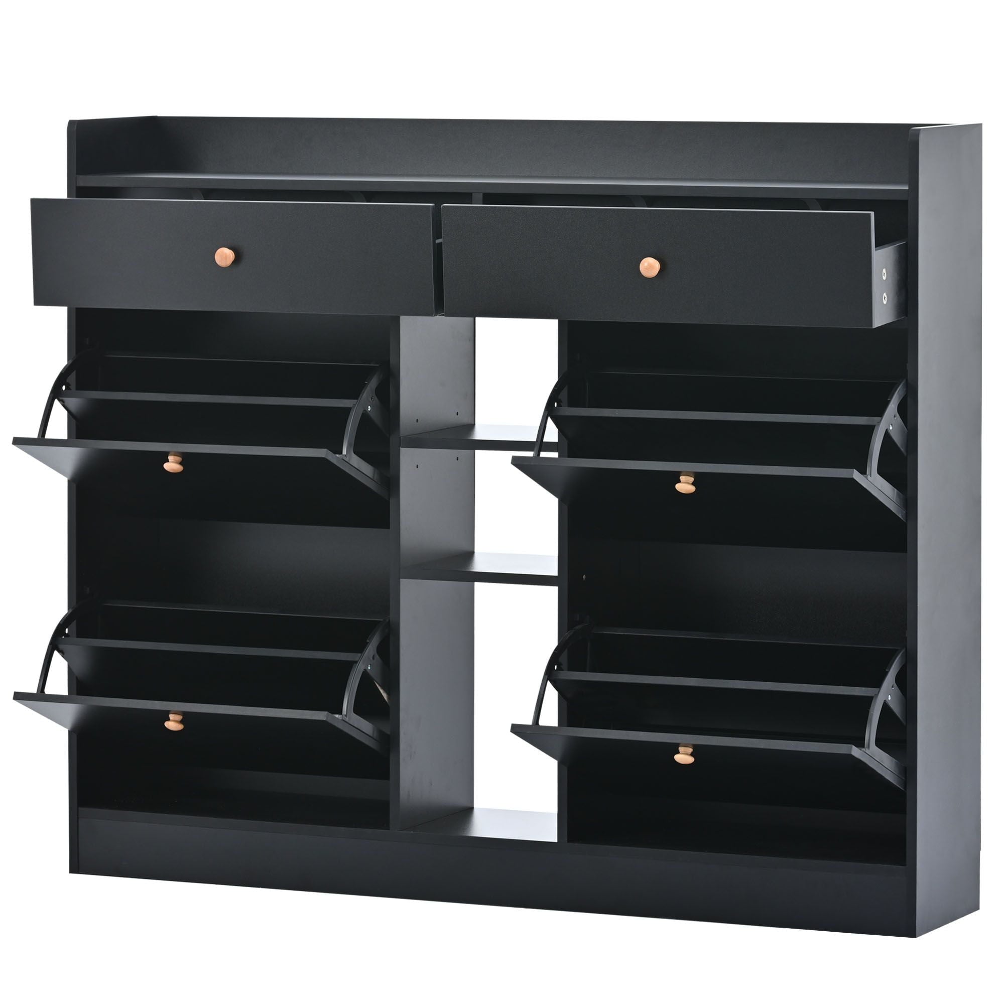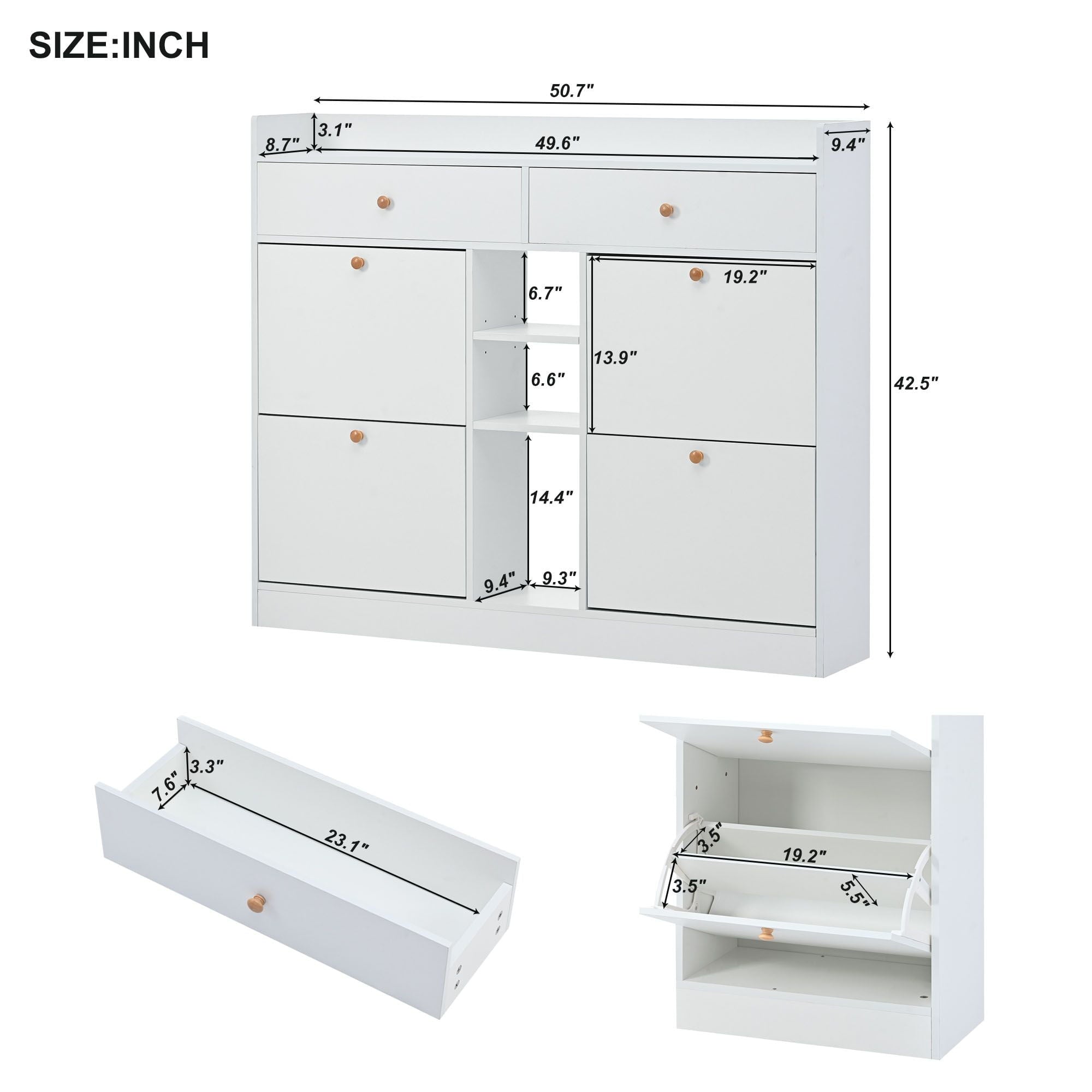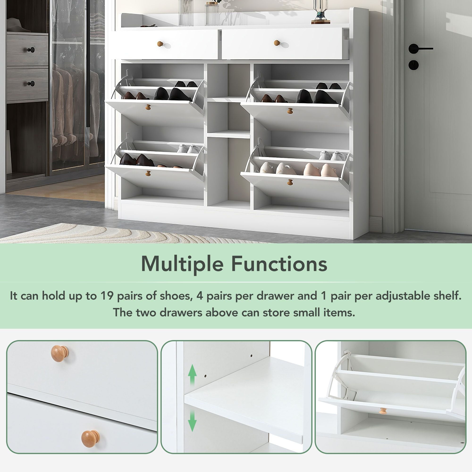 - MULTIPLE FUNCTIONS – It can hold up to 19-24 pairs of shoes, 4 pairs per drawer and 1 pair per adjustable shelf. The two drawers above can store small items. The table top can be a wonderful place to support decorations or items.