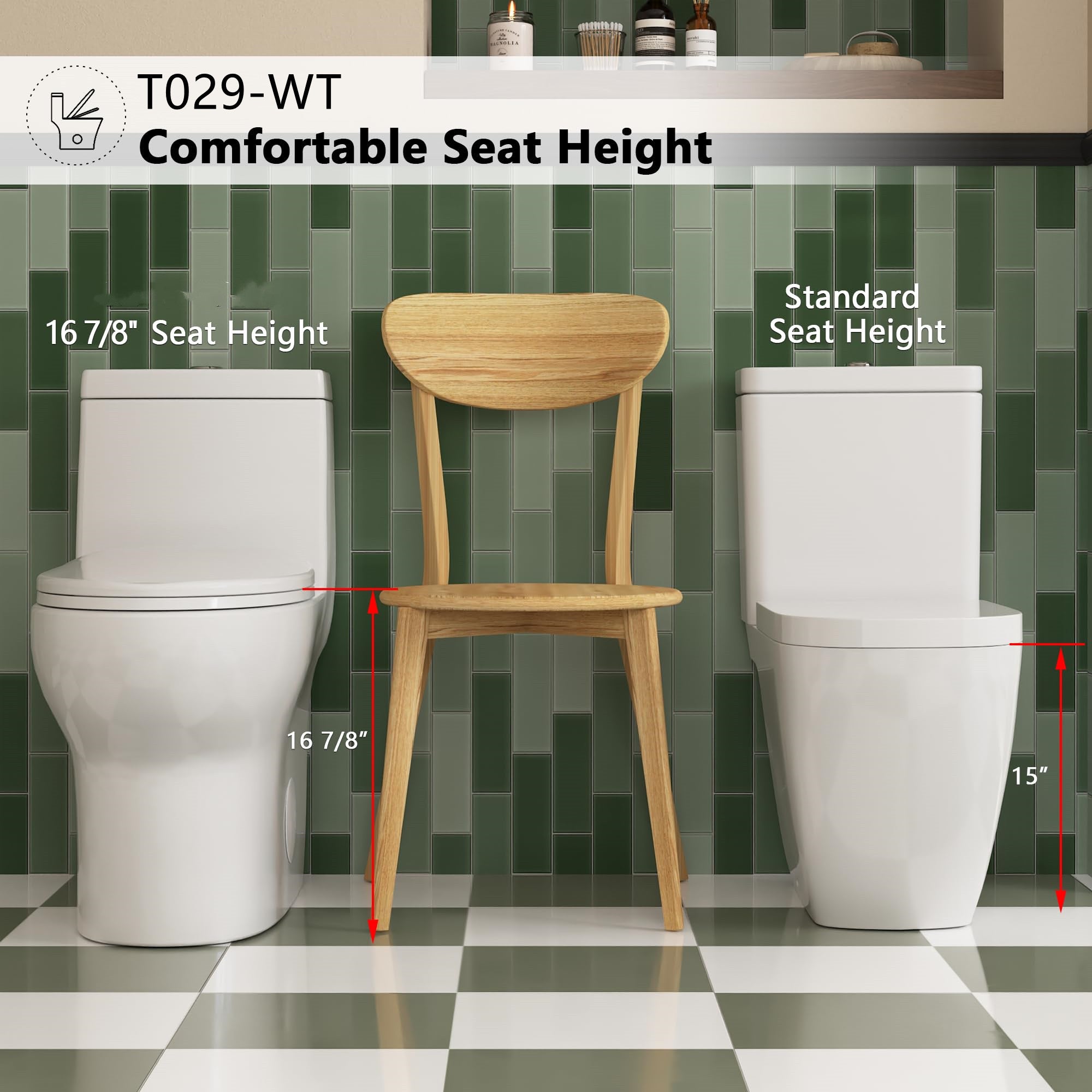 • CHAIR HEIGHT TOILET – ADA Compliant. Features 16.8 seat height from floor to seat. Comfortable height seating, ideal for the elderly and individuals with disabilities which makes sitting down and standing up easier.