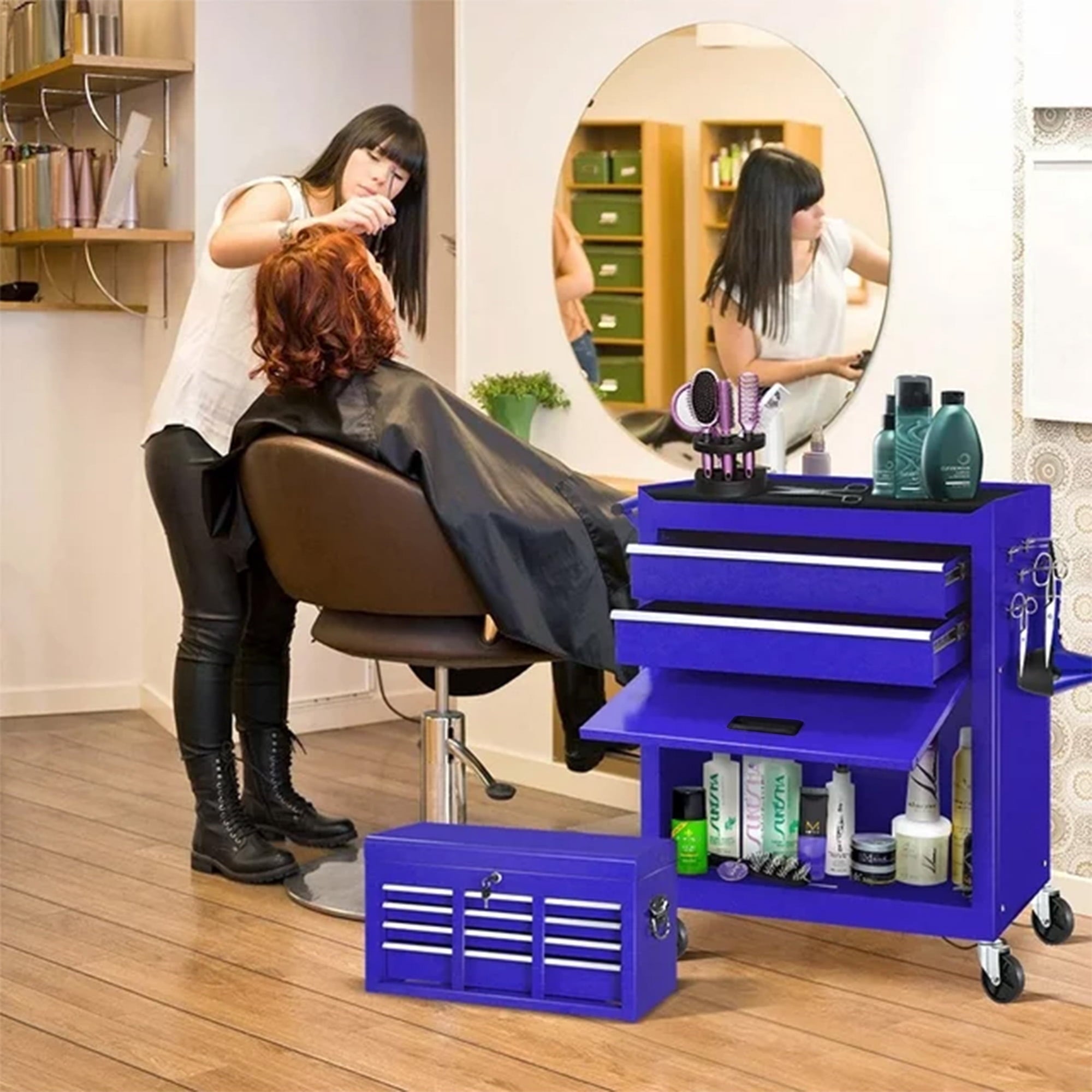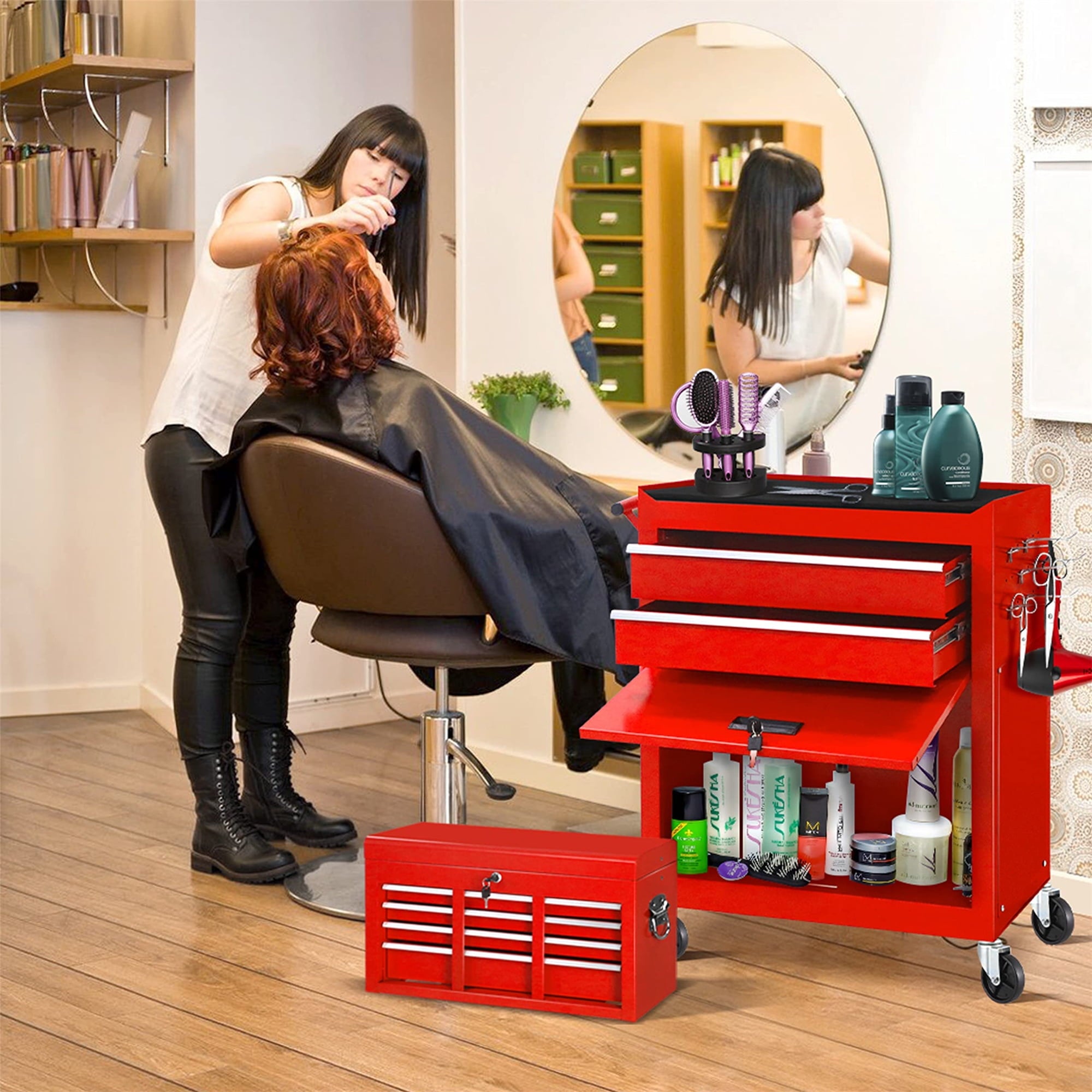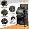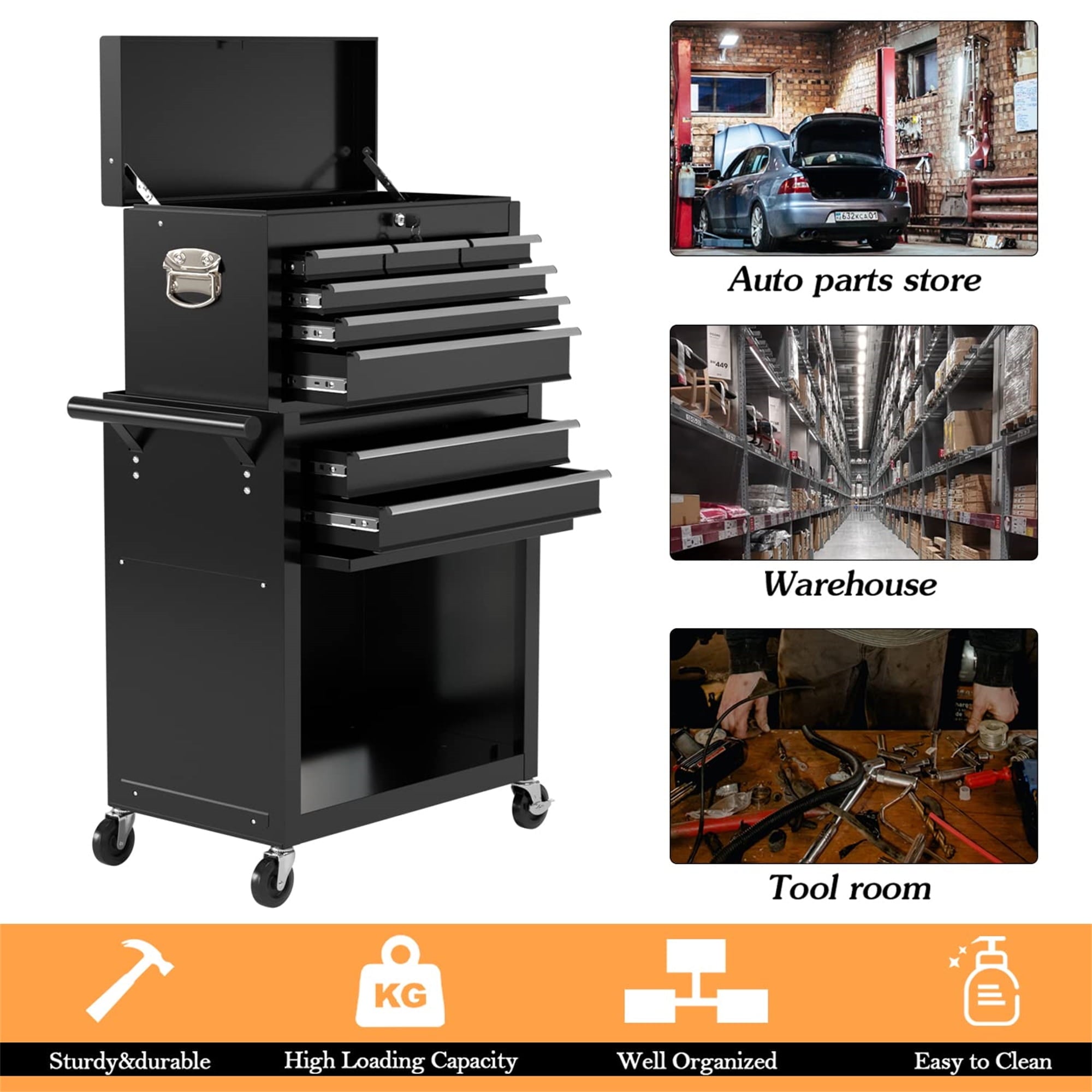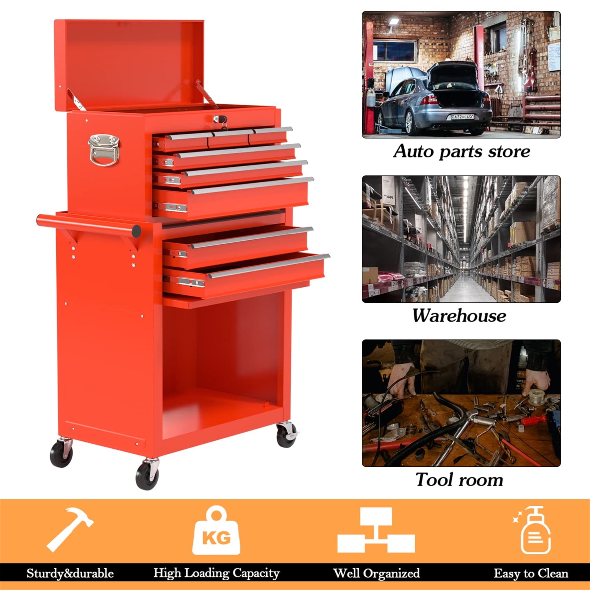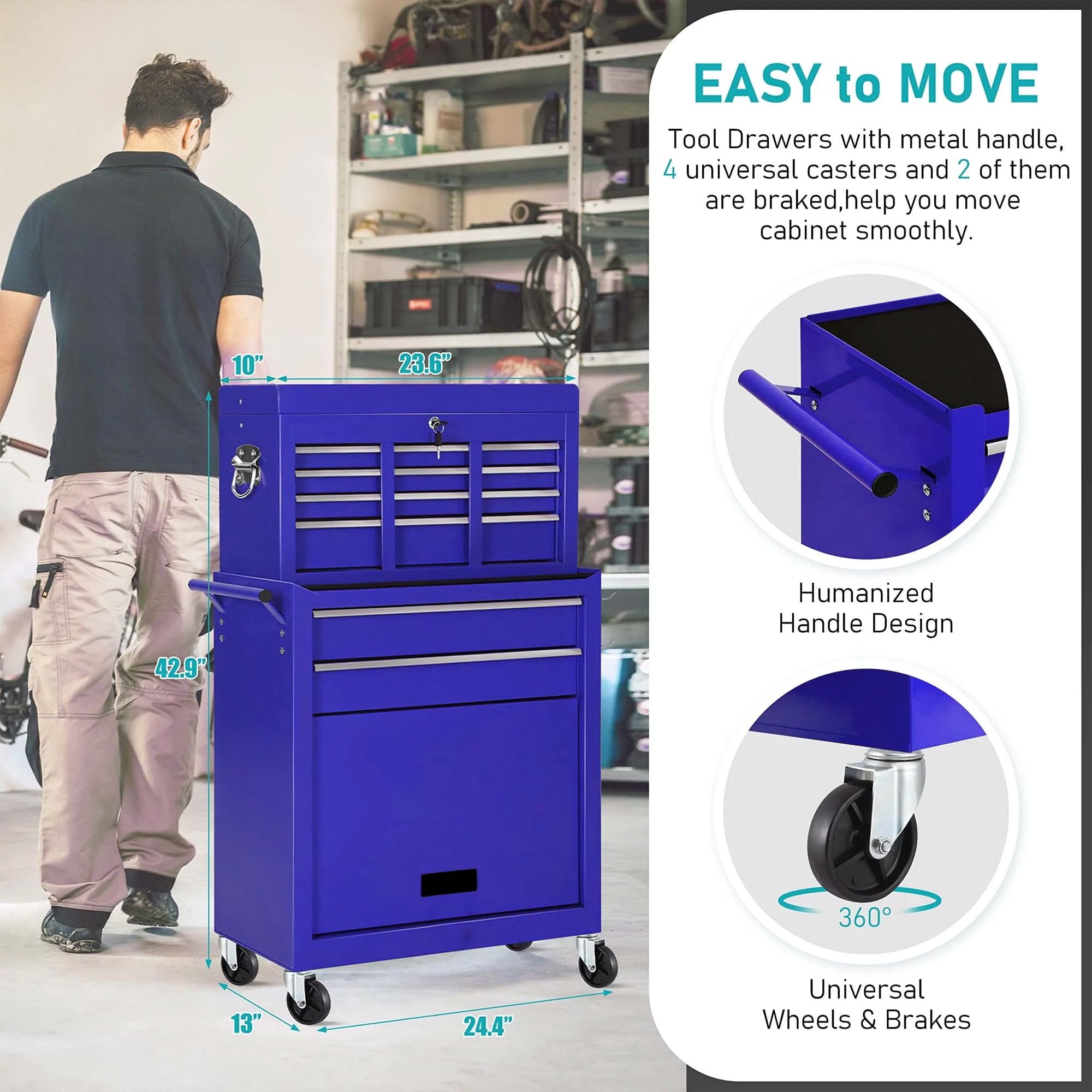 - EASY MOVING & SECURE STORING – locking our general tool cart can be easily moved and stored, because there are 4 universal casters, 2 of which are braked. Also, the top box with 2 handles, easy to take and lift, and the bottom tool cabinet with hand bars, which help you to move forward. More amazing, the top box can be stored in the bottom cabinet, saving your space.