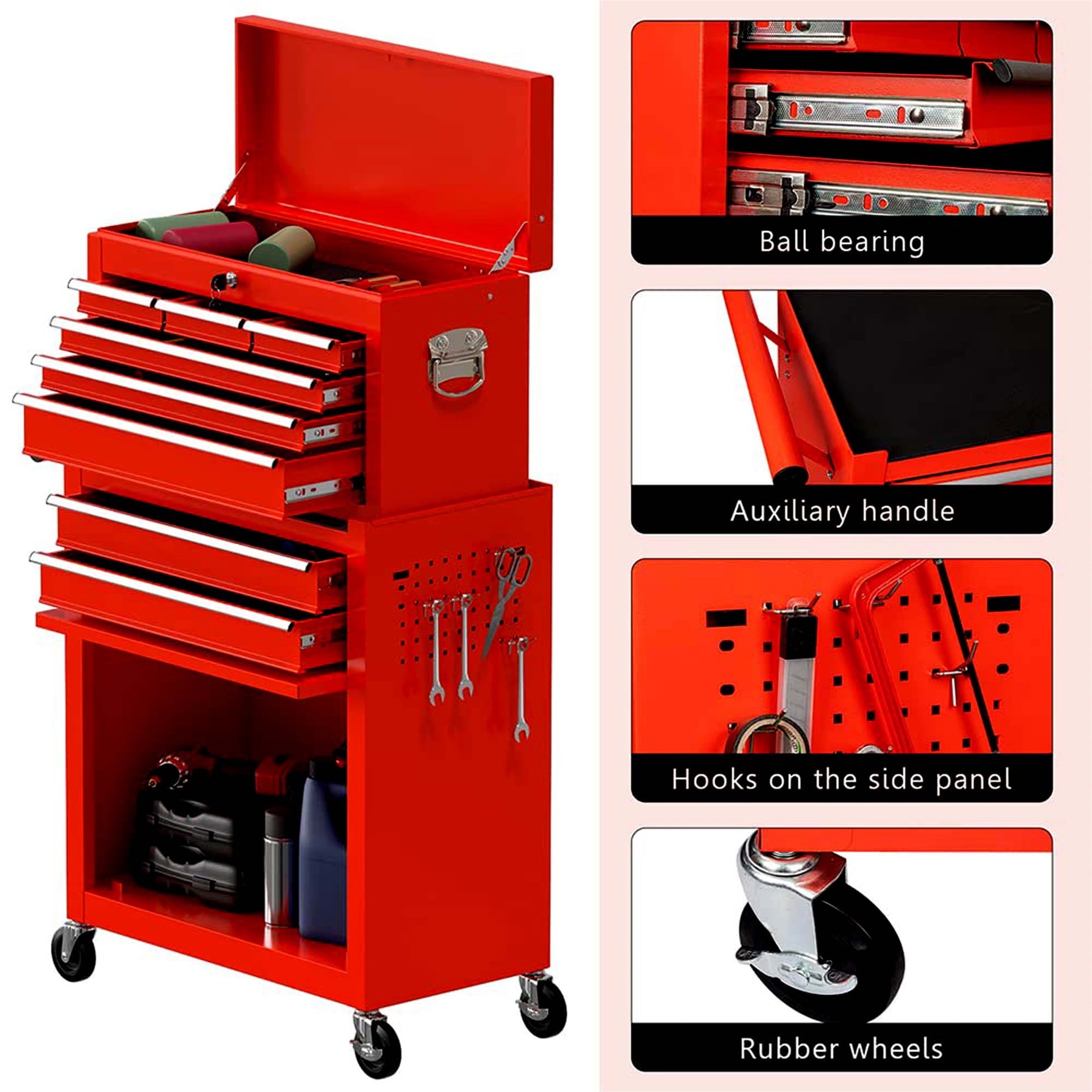 - LARGE HIGH CAPACITY – Compared with other tool chests, there are 6 hooks beside of cabinet and hanging items. Also, the rolling toolbox is equipped with 8 sliding drawers: 2 large, 3 medium & 3 small, 1 top layer, and 1 bottom cabinet, to store different size tools and meet your needs. Each drawer is designed with a liner to prevent scratches.