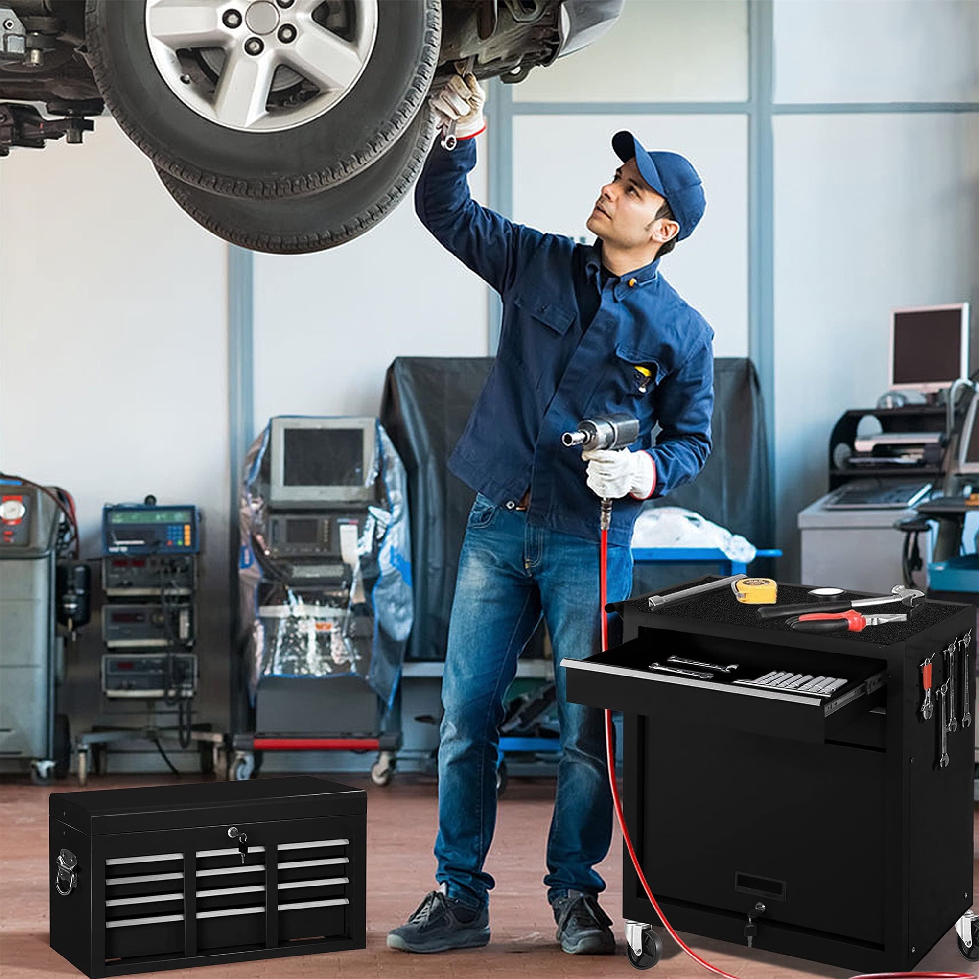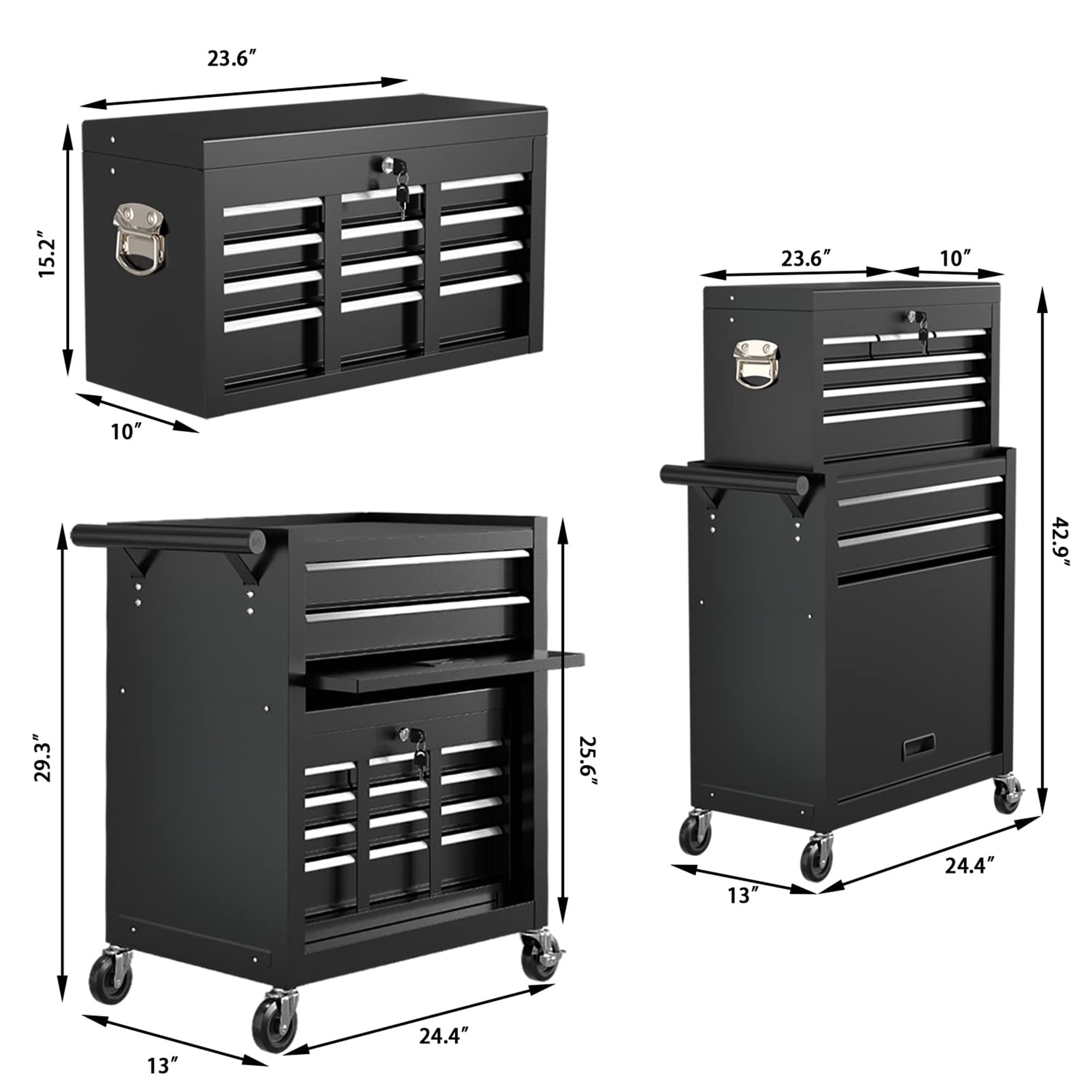 - ANTI-RUST MATERIAL – Big tool chest combo is detachable, and can be divided into the top toolbox and bottom tool cart, with an independent locking system. And the tool chest is made of high quality metal steel material, has a stable construction, prevents scratching, denting, and chipping, more durable; adopts a powder coat, classic black color, beautiful and anti-rust.