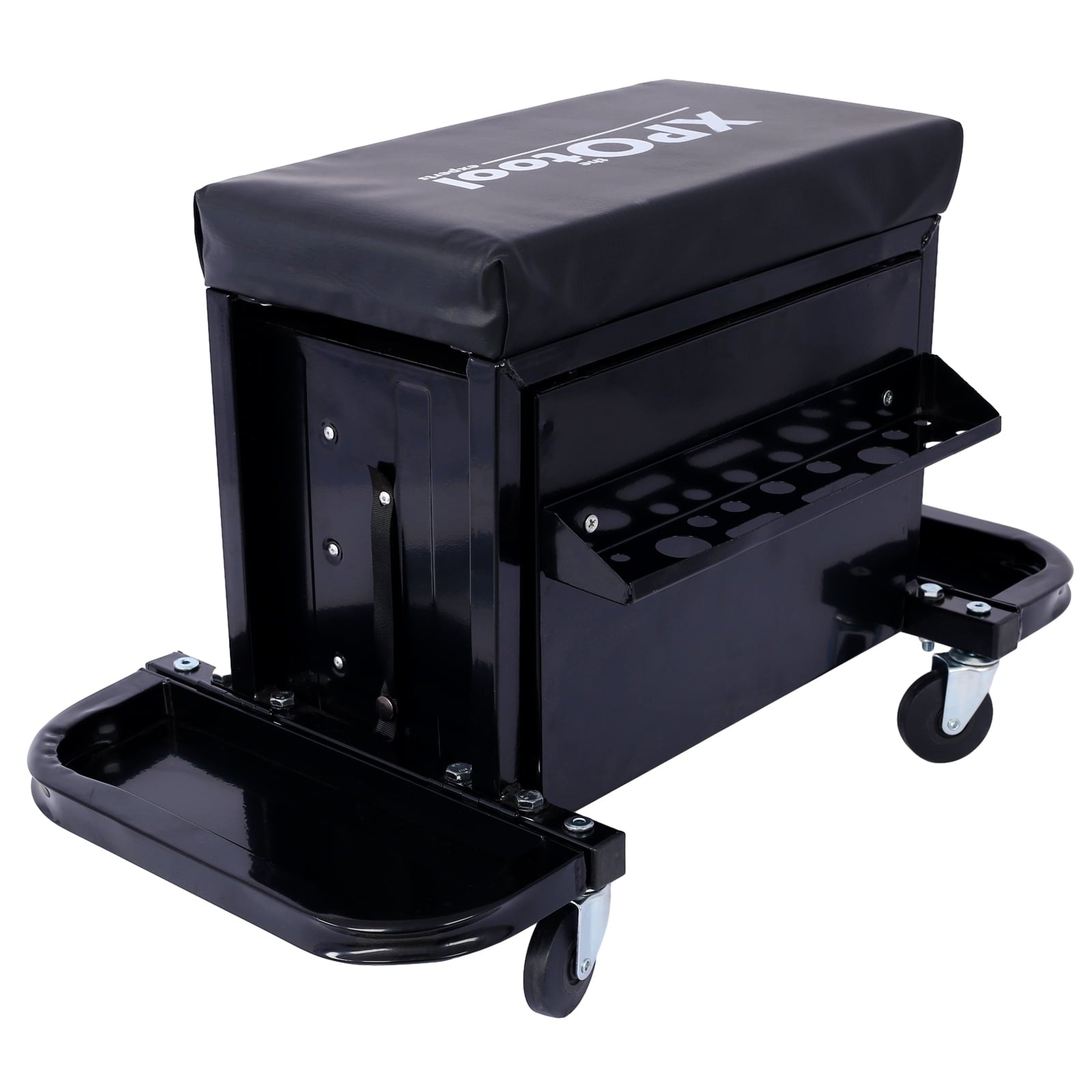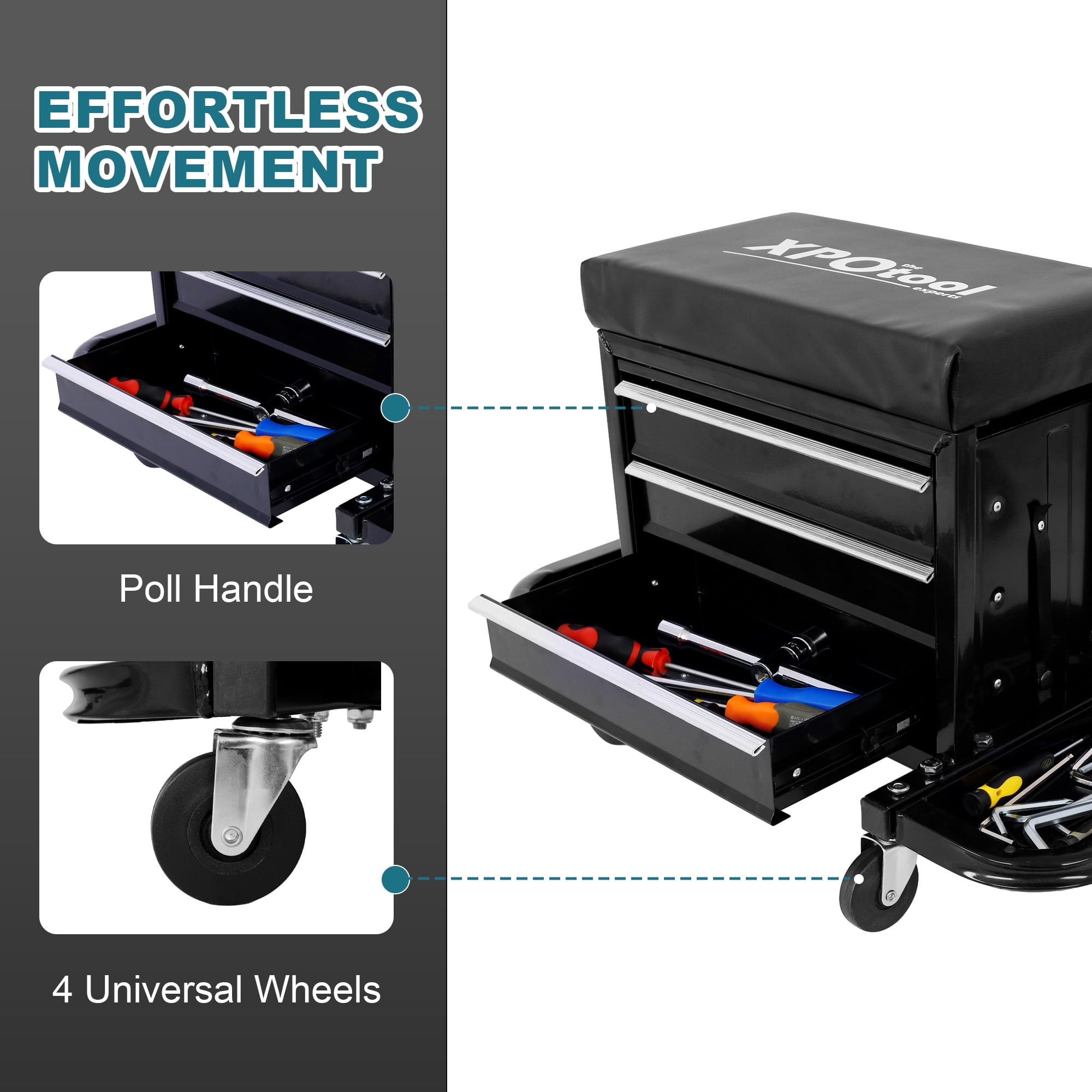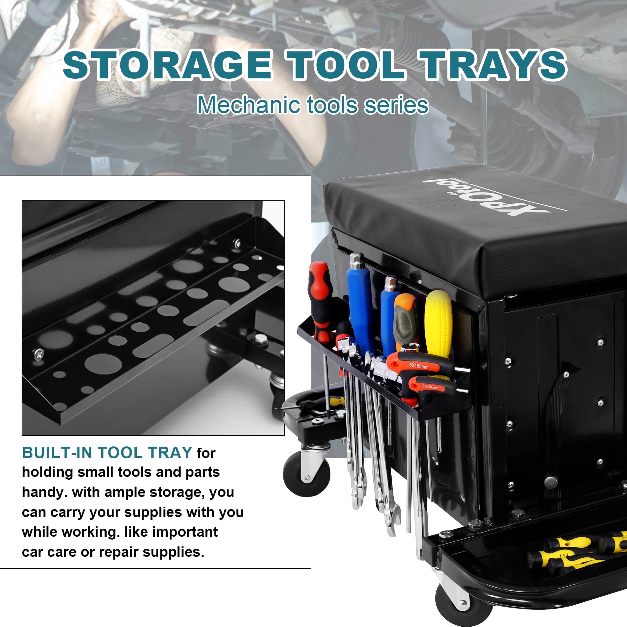 The Aukfa Garage Glider combines the functionality of a mechanic stool and a tool box. With a comfortable vinyl-protected cushion, swiveling casters, and foldable magnetic trays can organize screws and bolts, it offers a smooth and convenient experience in the garage/workshop. The Aukfa Rolling Tool Chest Seat provides organized storage with three drawers and foldable magnetic trays. Crafted from high-quality cold-rolled steel and coated with an anti-corrosion paint surface, this tool chest seat is both waterproof and rustproof. With four swivel casters, it ensures easy maneuverability, providing an ideal solution for keeping tools secure and easily accessible.