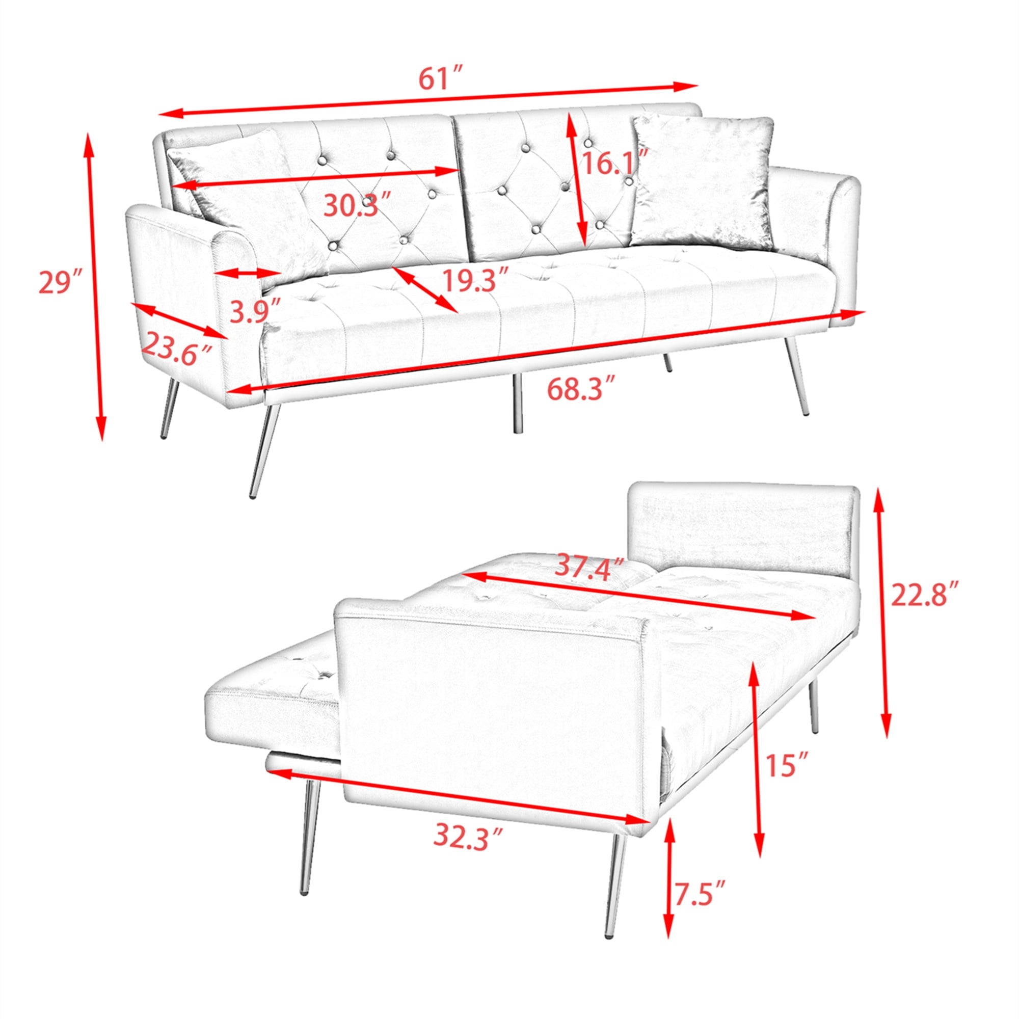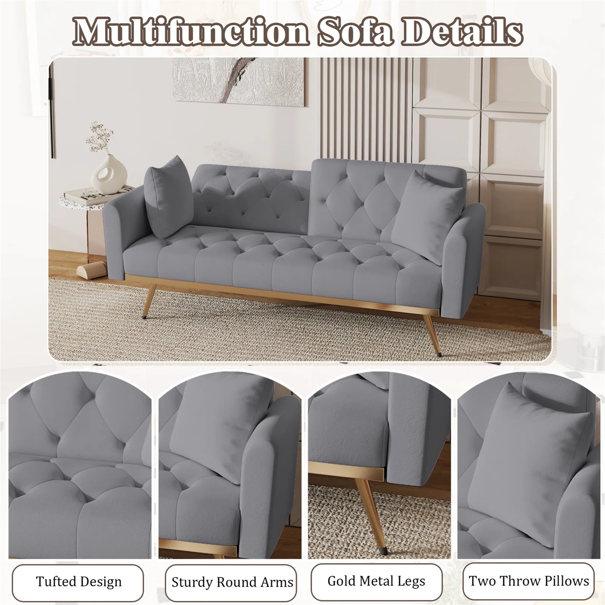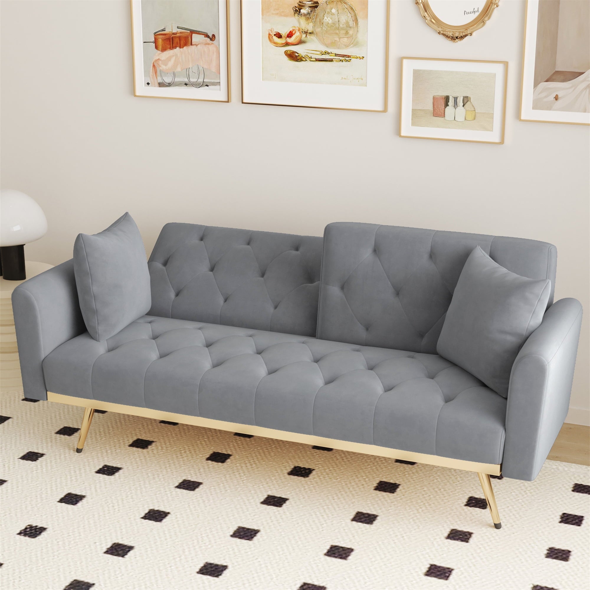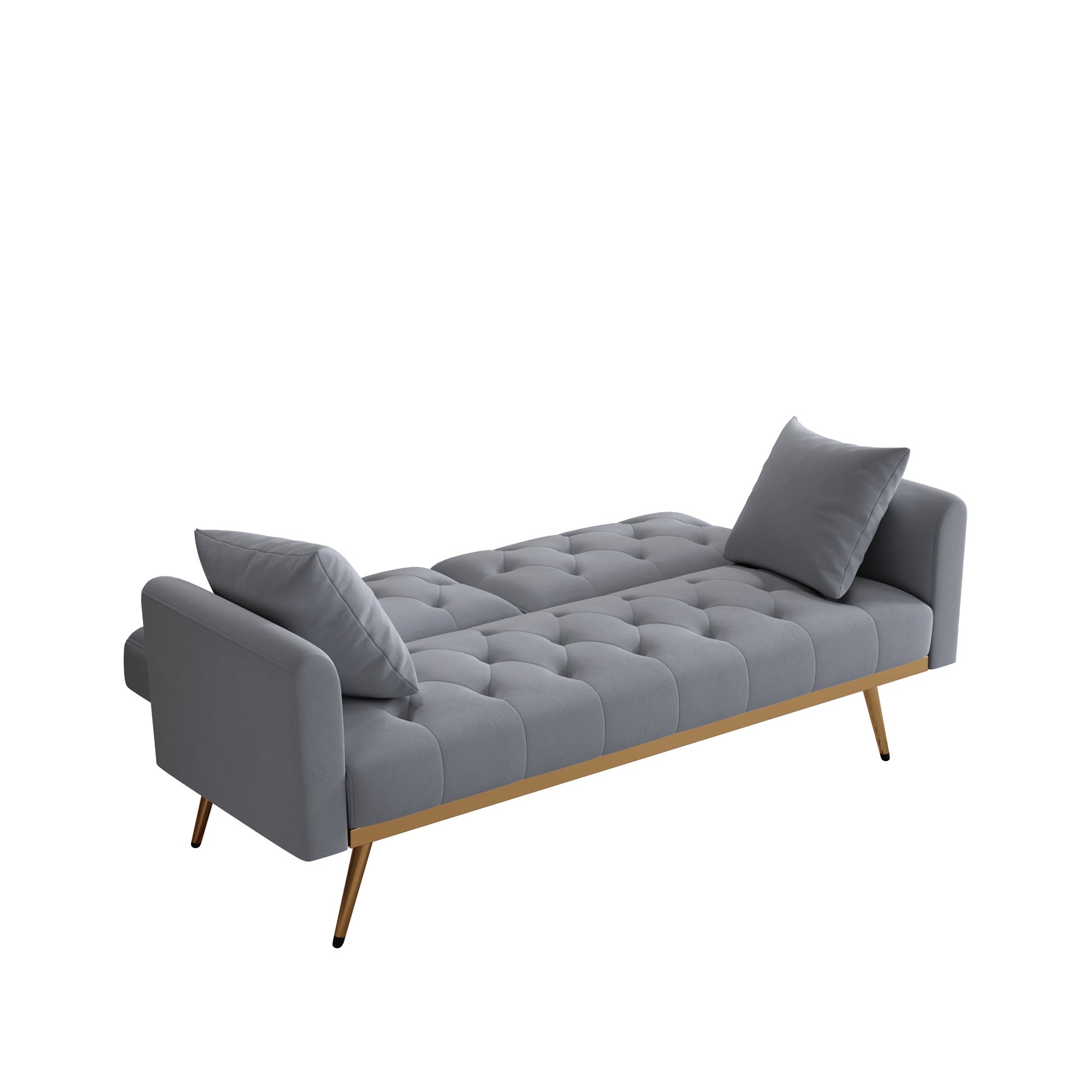 in one. The plush velvet upholstery offers a luxurious feel, while the deep tufting adds a touch of sophistication to any room. Crafted with a metal-reinforced base, this sofa bed ensures reliable support and stability. This convertible futon