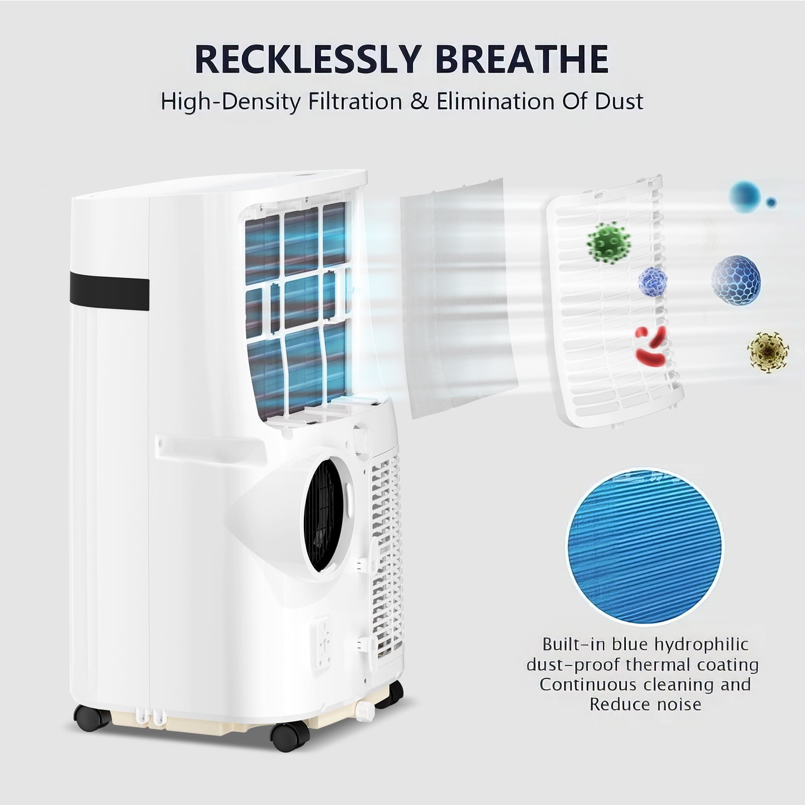 - 【Portable】 This portable air conditioner is only 13.39*11.81*27.32 inches, which is small and doesn’t take up much space. It also comes with a carrying handle and four universal wheels so you can easily move it anywhere!