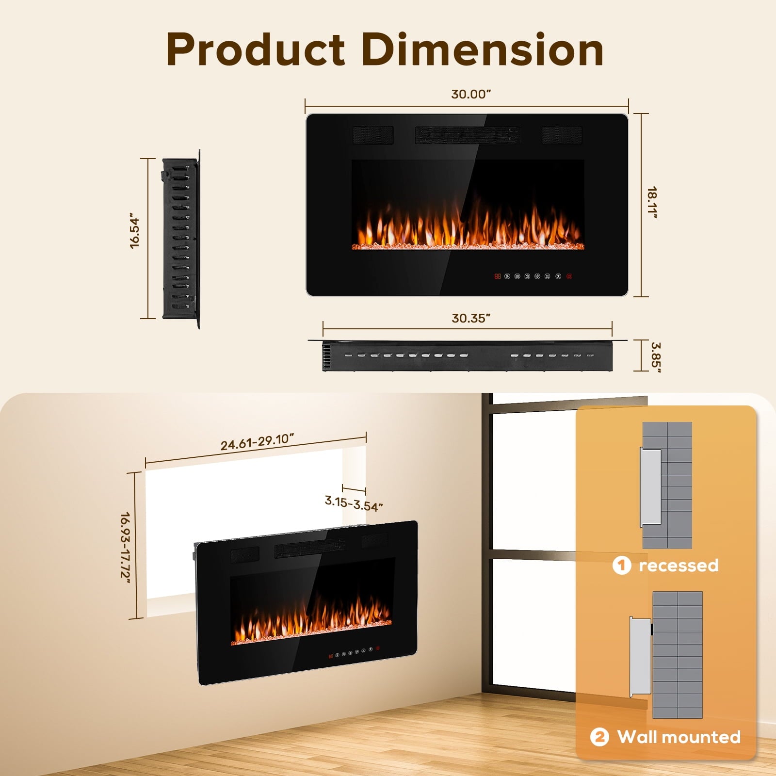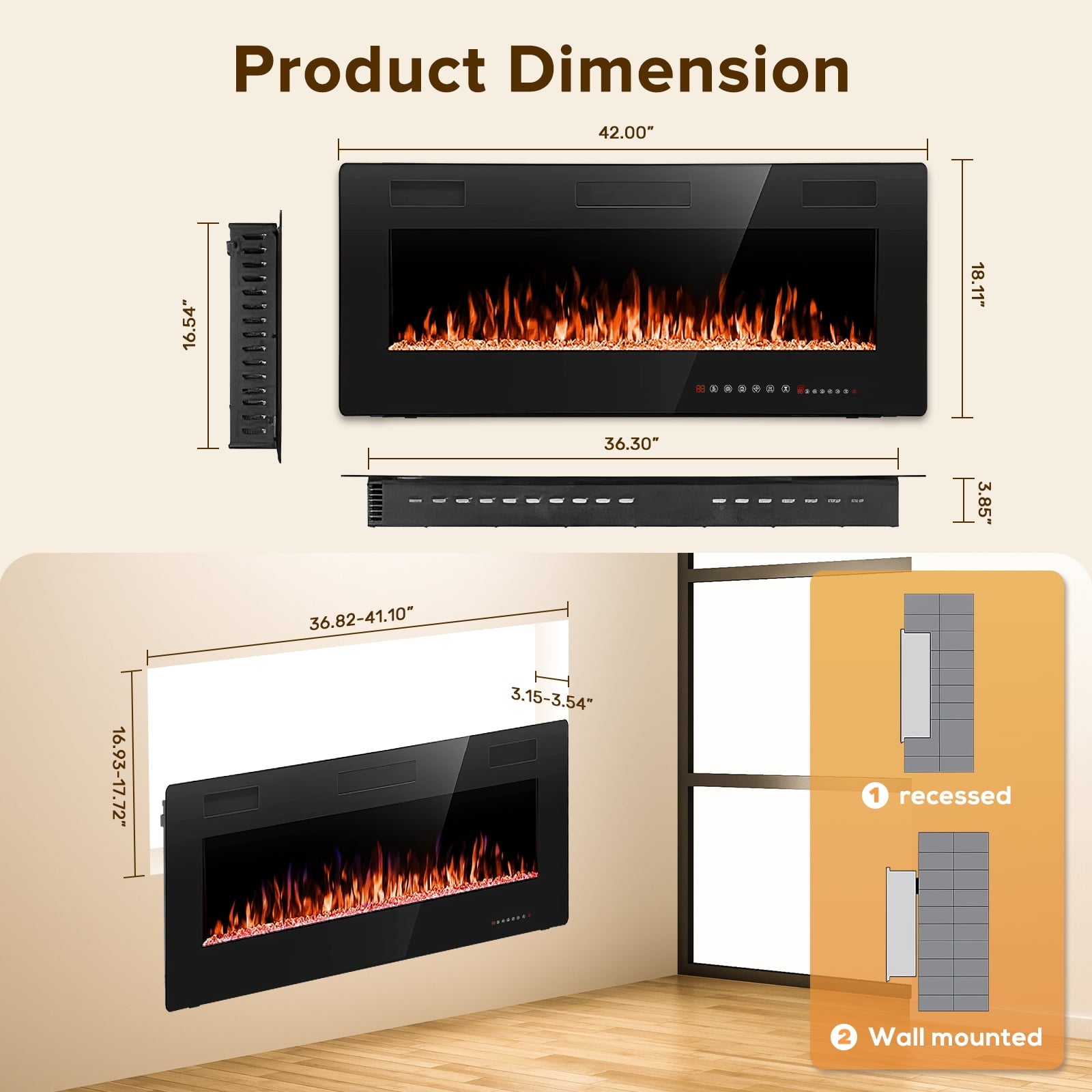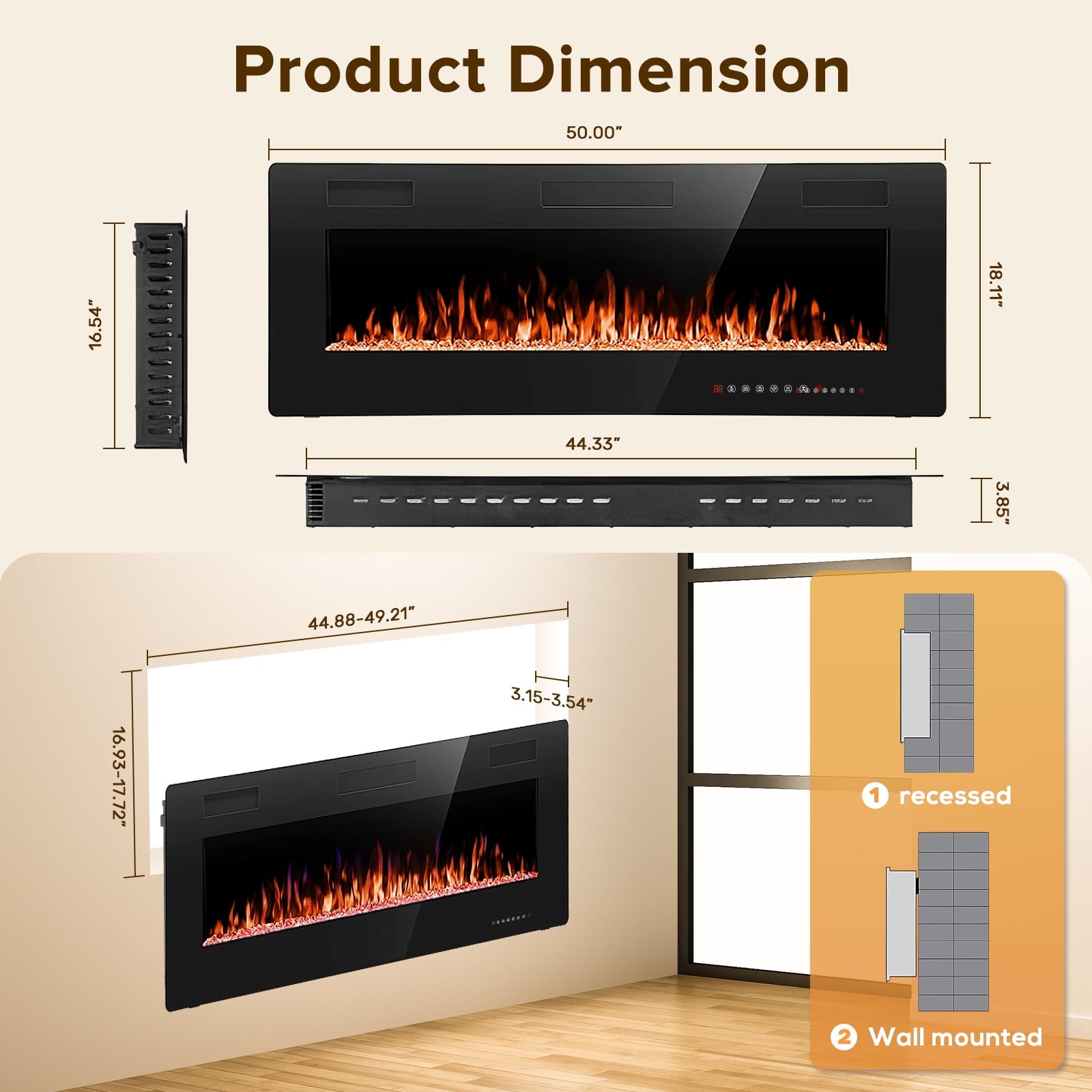 - Our electric fireplaces can be not only embedded or semi-embedded, but also wall-mounted. Size: 50*18.11*3.86 in. The ultra-thin thickness, only 3.85in, makes the overall style more beautiful, integrated into your decoration style.