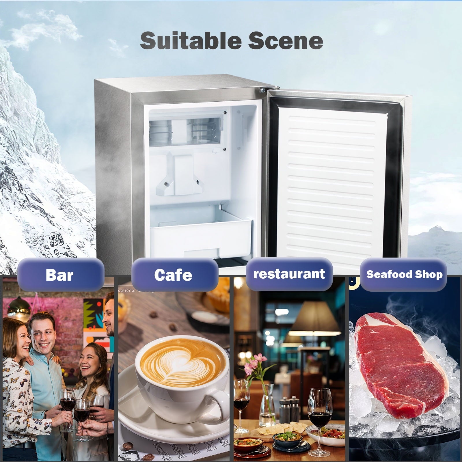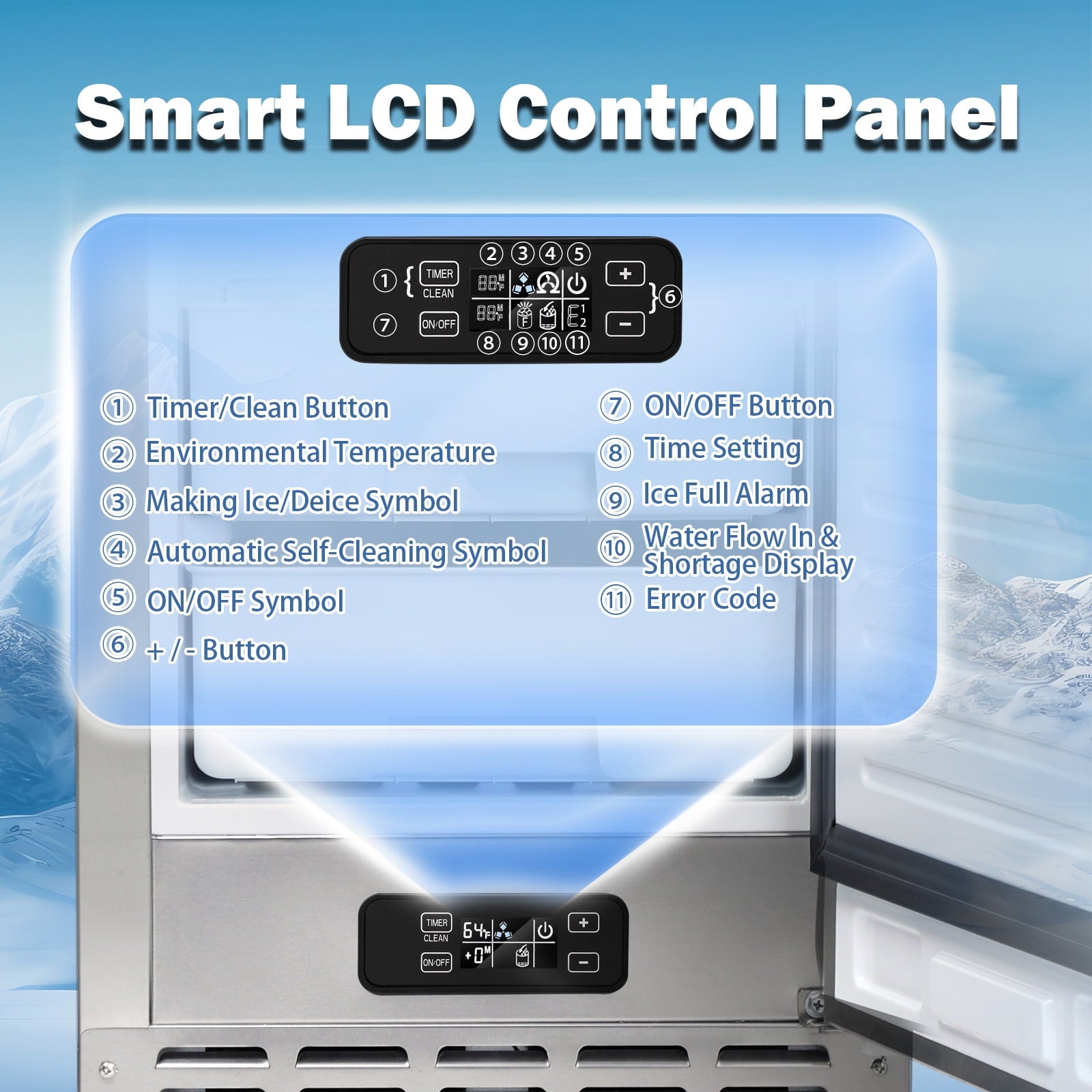 - [Multi-function keys] Auseo commercial ice maker is equipped with four mechanical buttons for easy adjustment, self-cleaning function and 24-hour timer, which is more convenient to use.