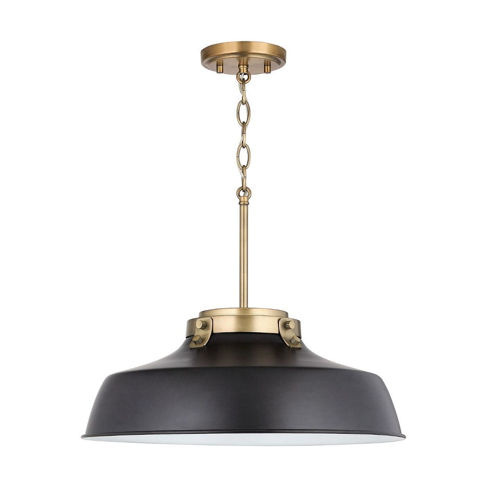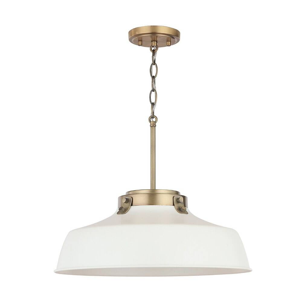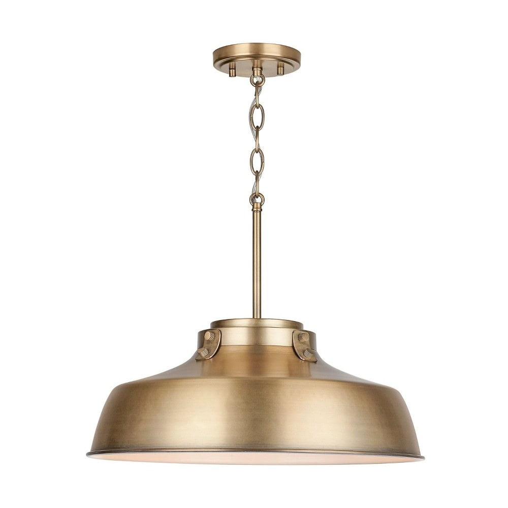 Austin Allen-9D328A-Collection: Oakwood, Material: Metal, Finish Color: Aged Brass, Width: 18″, Height: 7.25″, Depth: 18″, Chain Length: 12″, Lamping Type: Incandescent, Number Of Bulbs: 1, Wattage: 100 Watts, Moisture Rating: Dry Rated, Desc: Introducing the Oakwood – 1 Light Pendant, a striking addition to any urban or industrial-themed space. Measuring 7.25 inches tall and 18 inches wide, this pendant is crafted from durable metal, ensuring both longevity and style. Designed to accommodate one incandescent bulb, it effortlessly combines function with aesthetic appeal. The Oakwood collection brings a touch of sophistication, making it perfect for illuminating dining areas or cozy nooks with a warm, inviting glow.,-Oakwood – 1 Light Pendant In Urban and Industrial Style-7.25 Inches Tall and 18 Inches Wide-Aged Brass Finish -Traditional Installation