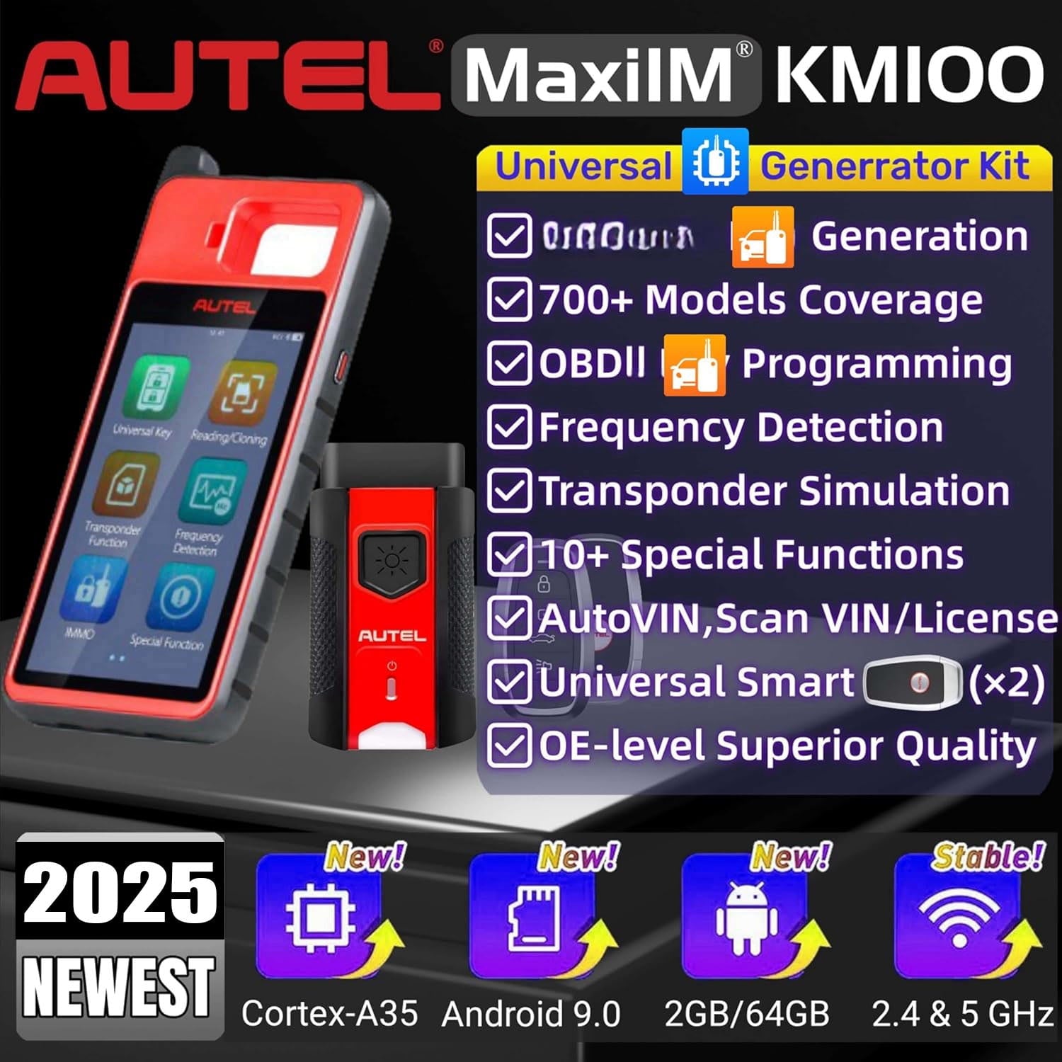 • ‌☆☆☆This 5.5-inch,KM100 Universal Key Generator Toolkit is Autel’s latest smart car key programming tool in 2022, professionally used for universal transponders and key generation, new keys, transponder write/read/clone, etc Advanced key function. Autel Ke-y Programmer KM100 can program Autel’s IKE-Y as smart ke-y replacement for more than 700 vehicles within 1 minute. Technicians can perform ke-y learning directly right after generation, ke-y programming efficiency has been increased at least 50%. ☆☆☆The Autel Maximim KM100 Universal Key Generator Kit comes with Bluetooth VCI, powerful Android tablet, 2GB RAM/64GB onboard memory and rechargeable battery, Rockchip PX30 processor,Equipped with the MaxiVCI V200 wireless interface, 2 universal smart blank keys in package, you can get the one-stop solution from key generation to key learning. It is undoubtedly the best choice for locksmiths and home mechanics. ☆☆☆Autel KM100 key programmer supports various transponder types for cloning and editing, You are able to use this function to detect the transponder and vehicle information in order to decrypt a code which shall be used to directly clone and generate a functional transponder for your vehicle. The whole process saves the trouble of using the old OBD approach.With the Auto VIN/ Auto Scan function, the Autel KM100 can retrieve vehicle IMMO information and complete IMMO-related functions in minutes ☆☆☆MaxiIM KM100 is an advanced key and immobilizer touchscreen tablet capable of smart key creation and IMMO learning via OBD. Additional innovative features include key renewal and Transponder Editing of 20 supported protocols.AutoVin vehicle identification to ensure accuracy Simple User Interface with Concise Instructions Supporting 8 Key Series And 37 Models 60-Second Key Generation (Autel Universal Only) Chip Read & Write, Cloning and Frequency Detection ☆☆☆Autel KM100 key fob programmer is able to do IMMO k~ey learning via OBD on 99% of vehicles, which is the most comprehensive coverage on the IM market. KM100 integrates all key IMMO-related functions such as Read PIN, Ke~y Learning,all-key-lost functions, IMMO ECU Reset/Refresh/ Coding, IMMO Data Backup/ Restore, etc.Note:KM100 is not 100% suitable for all cars.