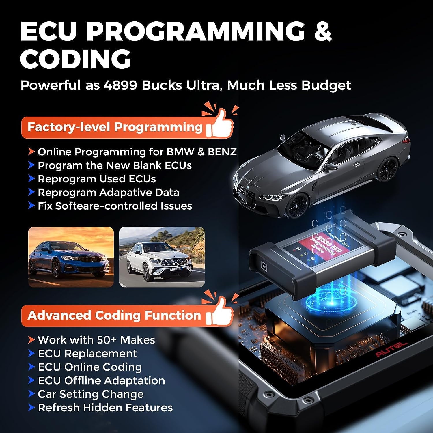 - ✅ OE-level Re Made Easy: Operate with a menu-guided procedure to new E~CUs, upgrade E~CU software, and fix software-controlled issues, etc. for Ben-z & BM-W through J2534 pass-thru device and Autel online servers. NO time-consuming process; NO cumbersome equipment involved.