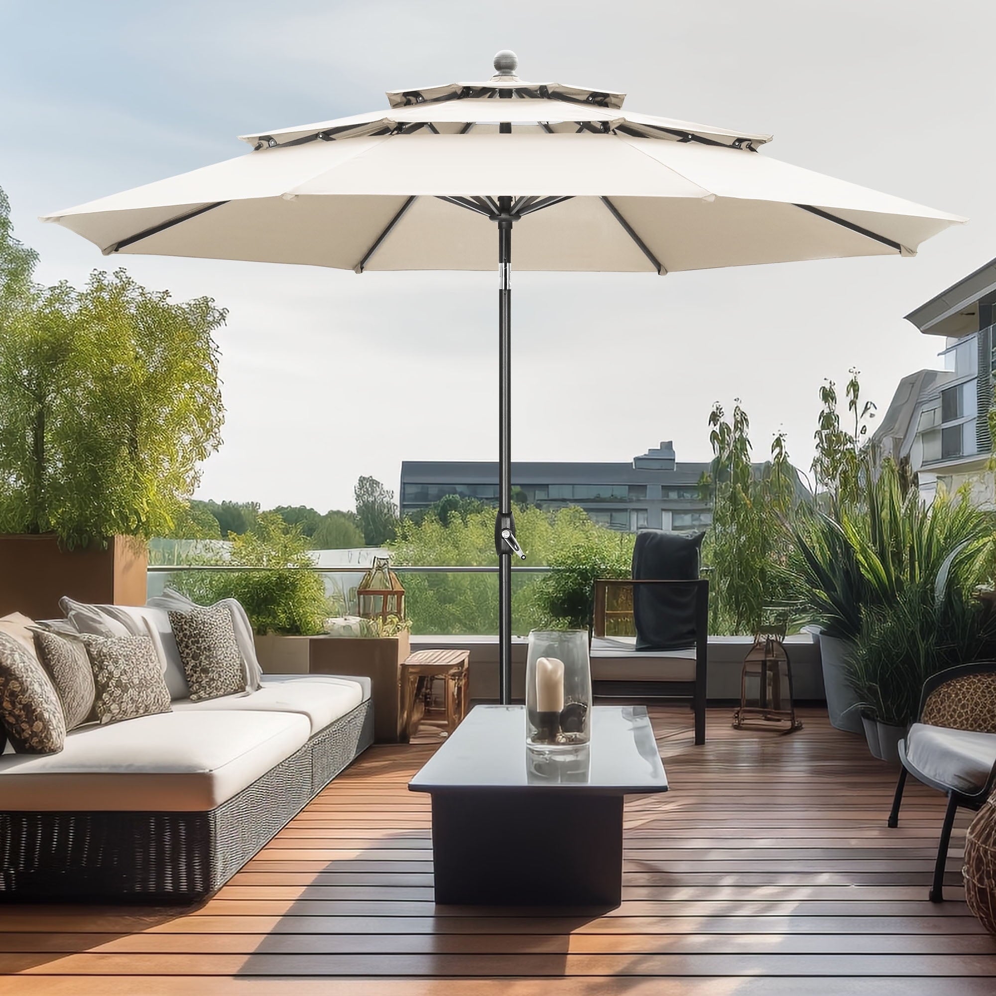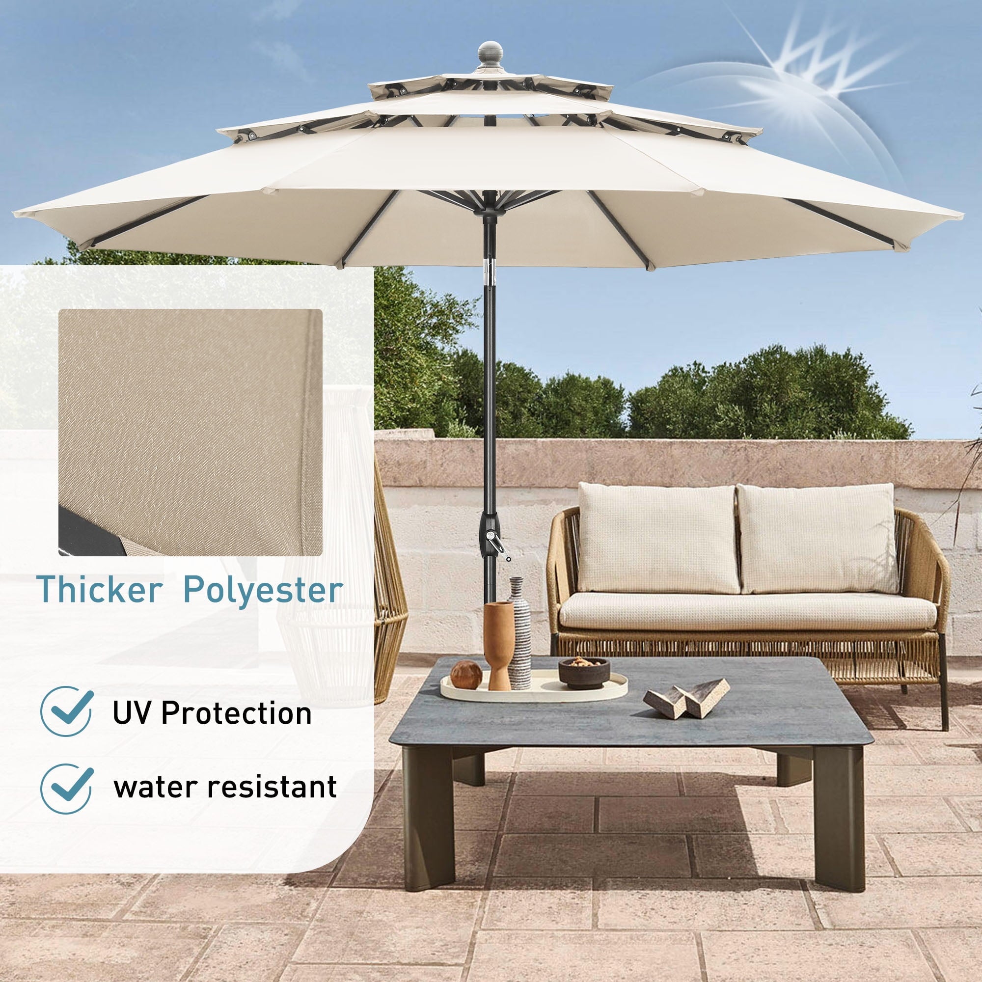 Stay Cool and Steady-Our Patio Umbrella features a unique three tiers design that allows hot air and wind to flow through multiple vents, keeping you cooler and ensuring stability on breezy days. Say goodbye to wobbly shade!