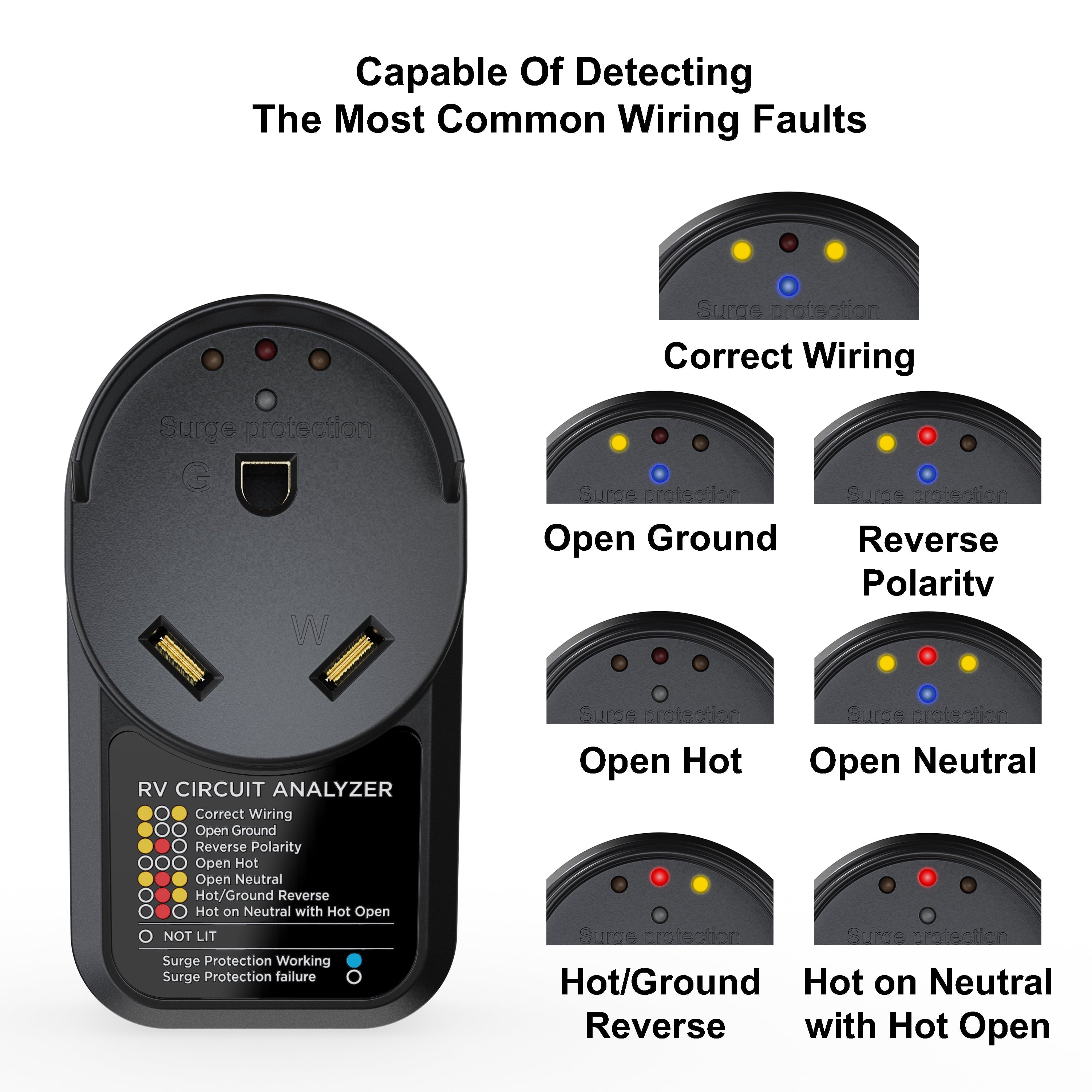 - Indicates Wiring Issues: Indicates faults for reverse polarity, open neutral and other wiring issues.