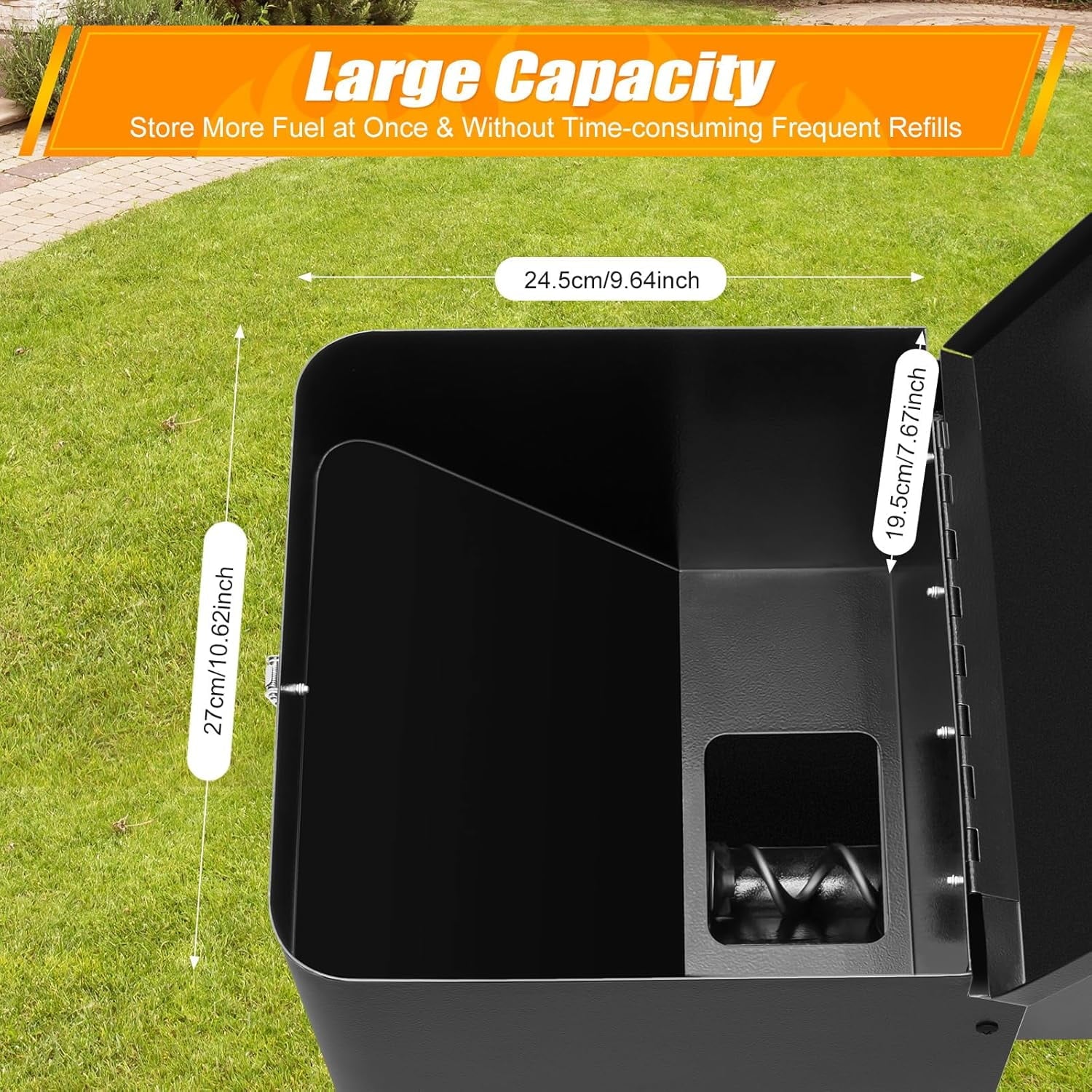 - 【Large Capacity】: The hopper measures 10.62*9.64*7.67 inches, which allows it to store more fuel at once without time-consuming frequent refills. A slope design inside hopper makes the fuel more conducive to falling into the delivery screw stem. See more product details