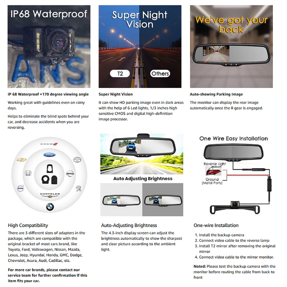 - Superior Night Vision Back Up Camera: 6 high brightness LED bulbs can automatically turn on/off according to the intensity of ambient light. Even in the dark night, rearview mirror camera can efficiently help you see more clearly during the evening or dark underground parking lot