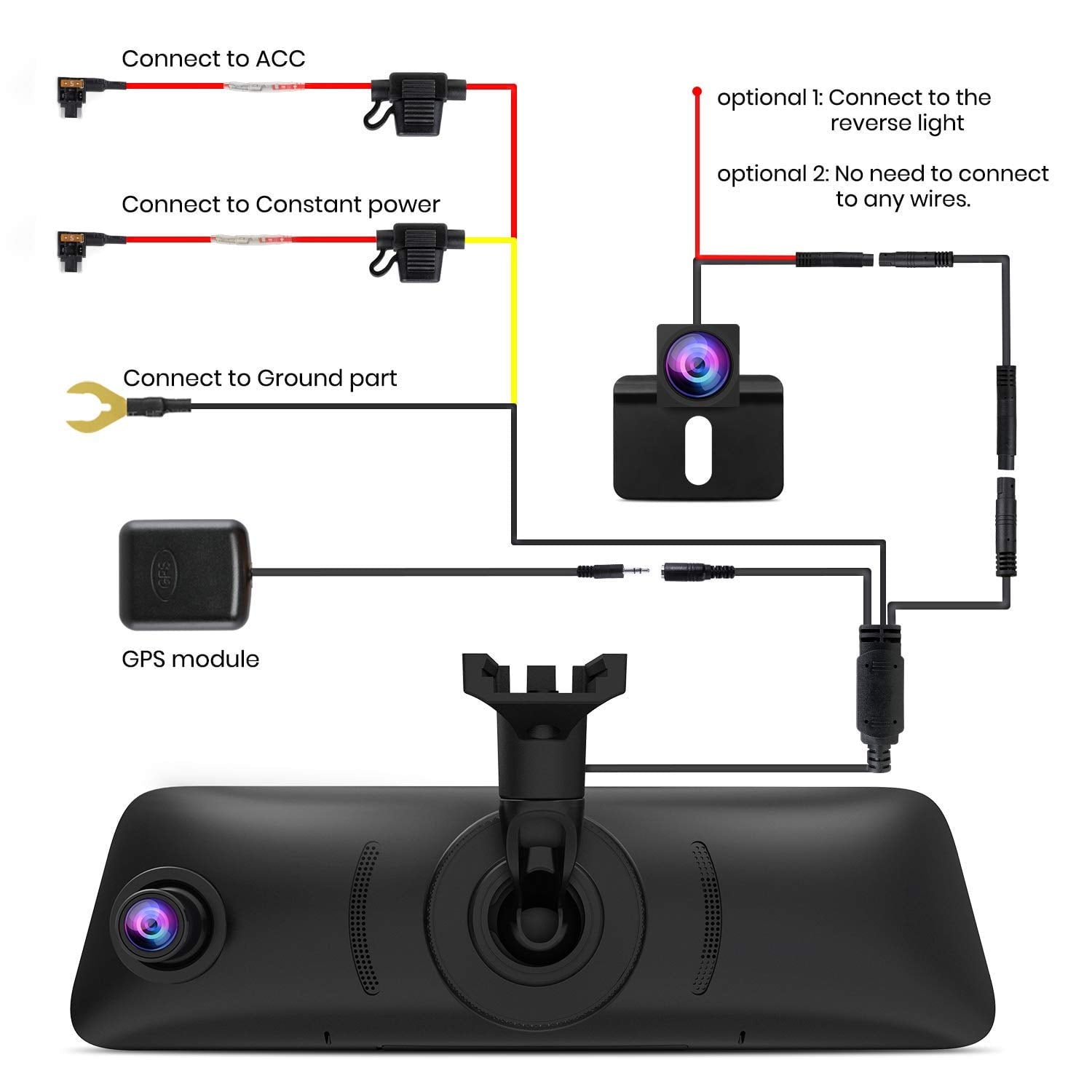 No car charger and hard wire kit required, V5PRO is directly connected to the car fuse box(ACC) for constant power. Both camera record video automatically once it detects the collision, and dash cam turns off after locking a 30-second footage to avoid draining car battery. Save evidence to protect your interest.