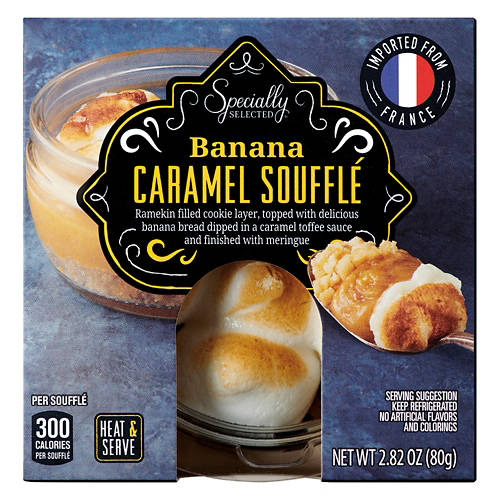 Treat yourself to something sweet with this Specially Selected Banana Caramel Soufflé! Imported straight from France, the rich soufflé features a crumbly cookie base topped by banana bread soaked in a caramel toffee sauce and a layer of light meringue. Enjoy yours on its own, or pair it with a scoop of vanilla ice cream for an extra-indulgent dessert!