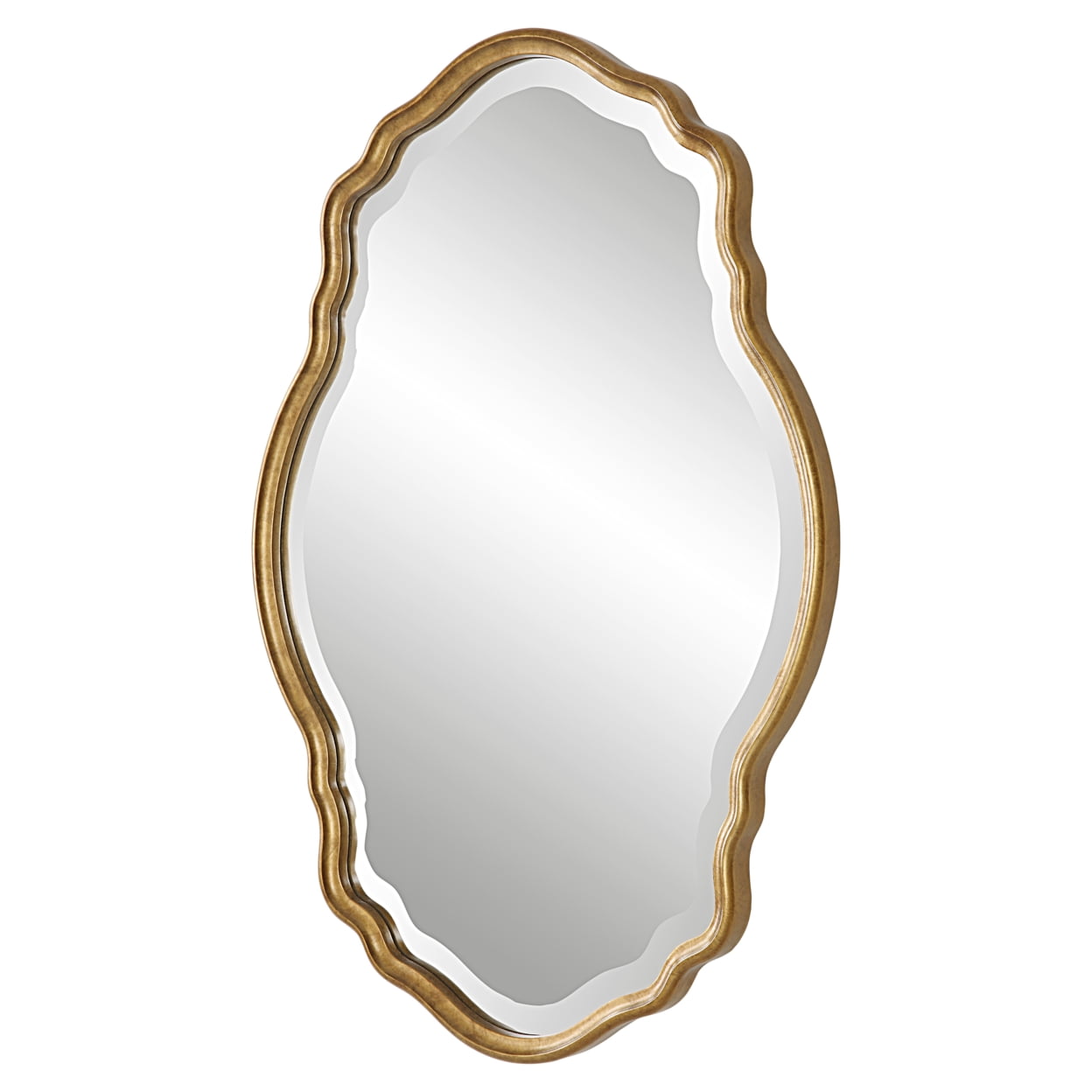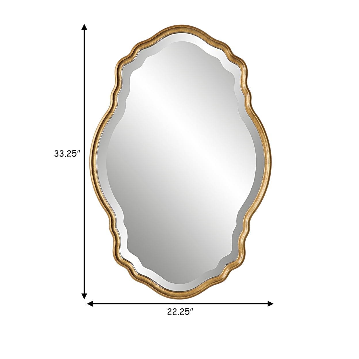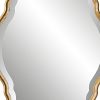 33 Inch Wood Wall Mirror, Elongated Quatrefoil, Gold, Saltoro Sherpi Exemplify classic style with this wall mirror that brings a charming personality and elegant class to your home with graceful curves that add beauty to this expertly designed mirror. It has an elongated quatrefoil frame in a rich gold finish with amber glaze and has a gorgeous 1.25 inch bevel. It can be hung either vertically or horizontally with easy to install mounting hardware on the back.