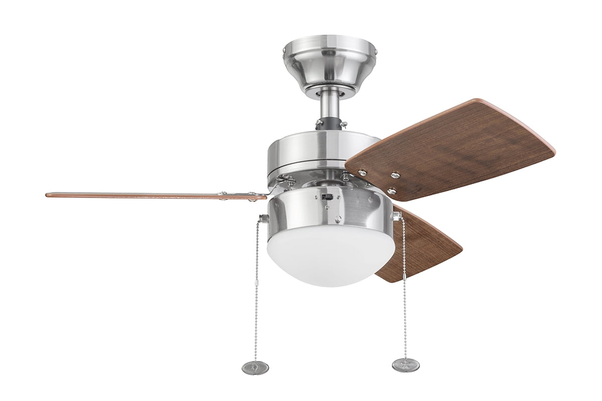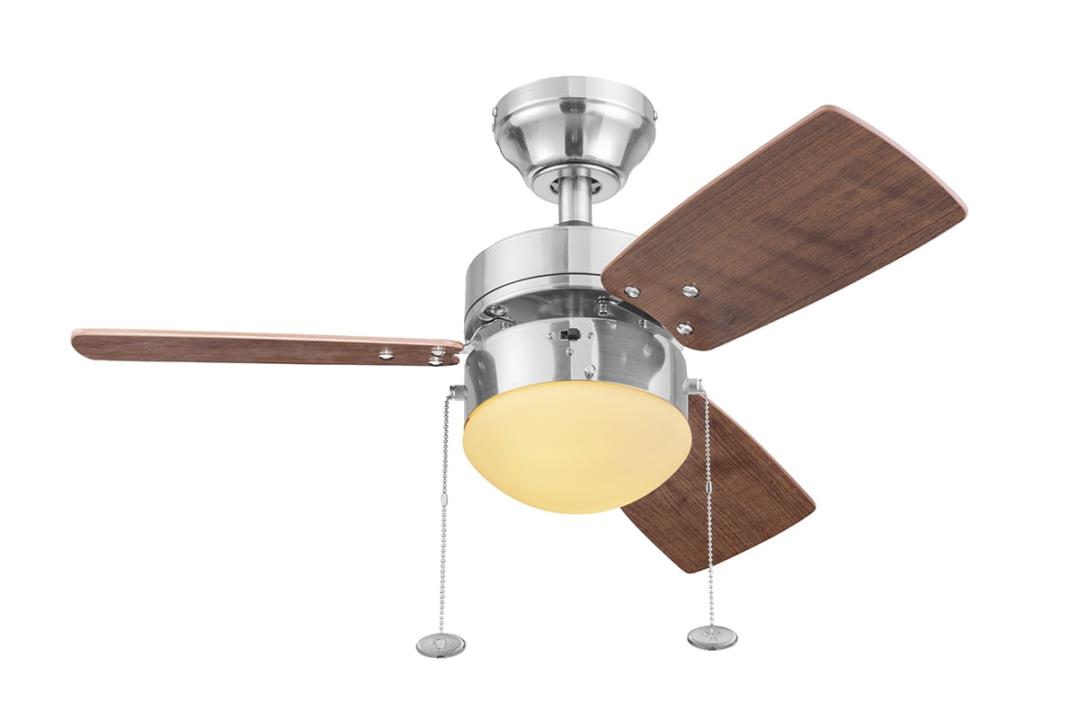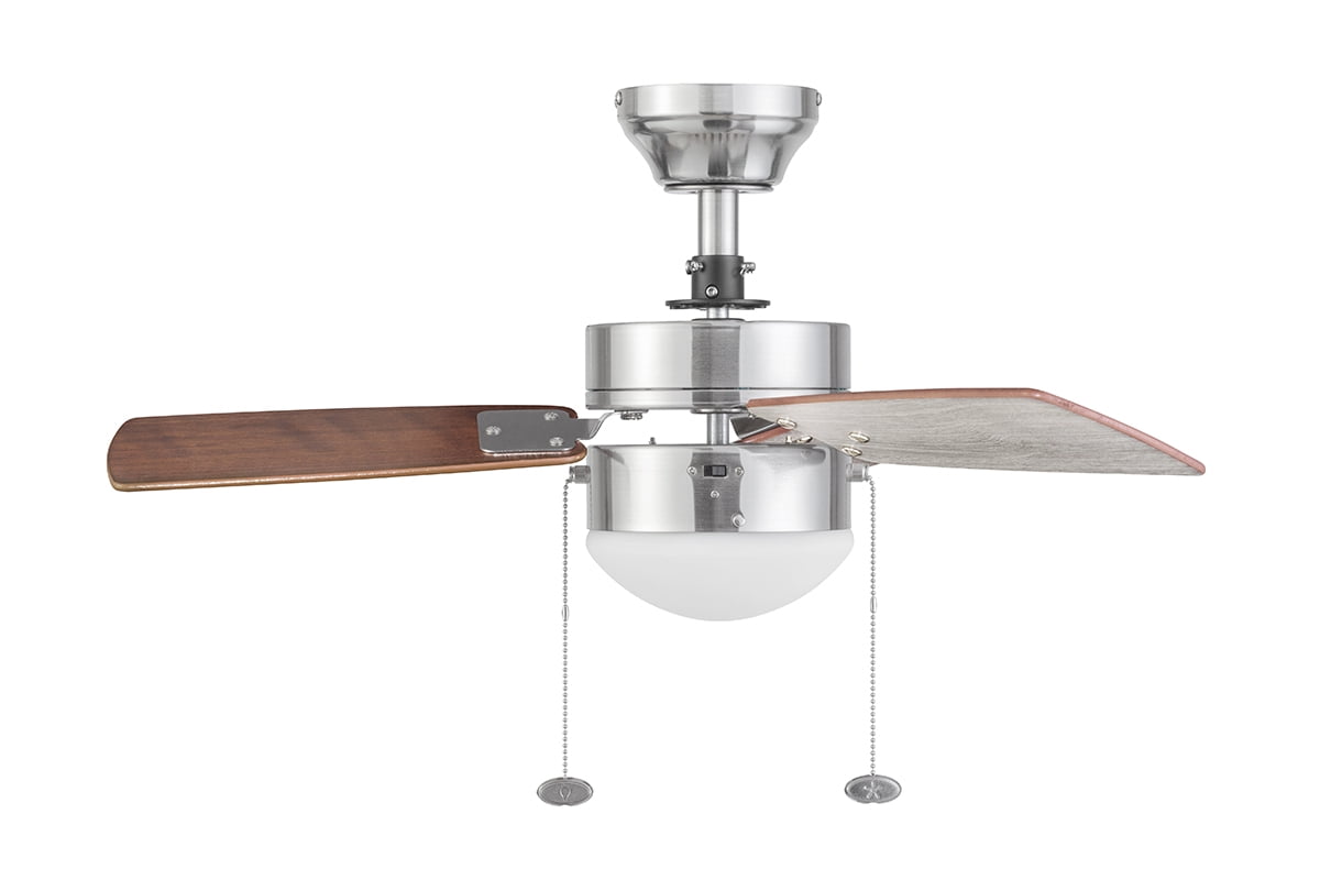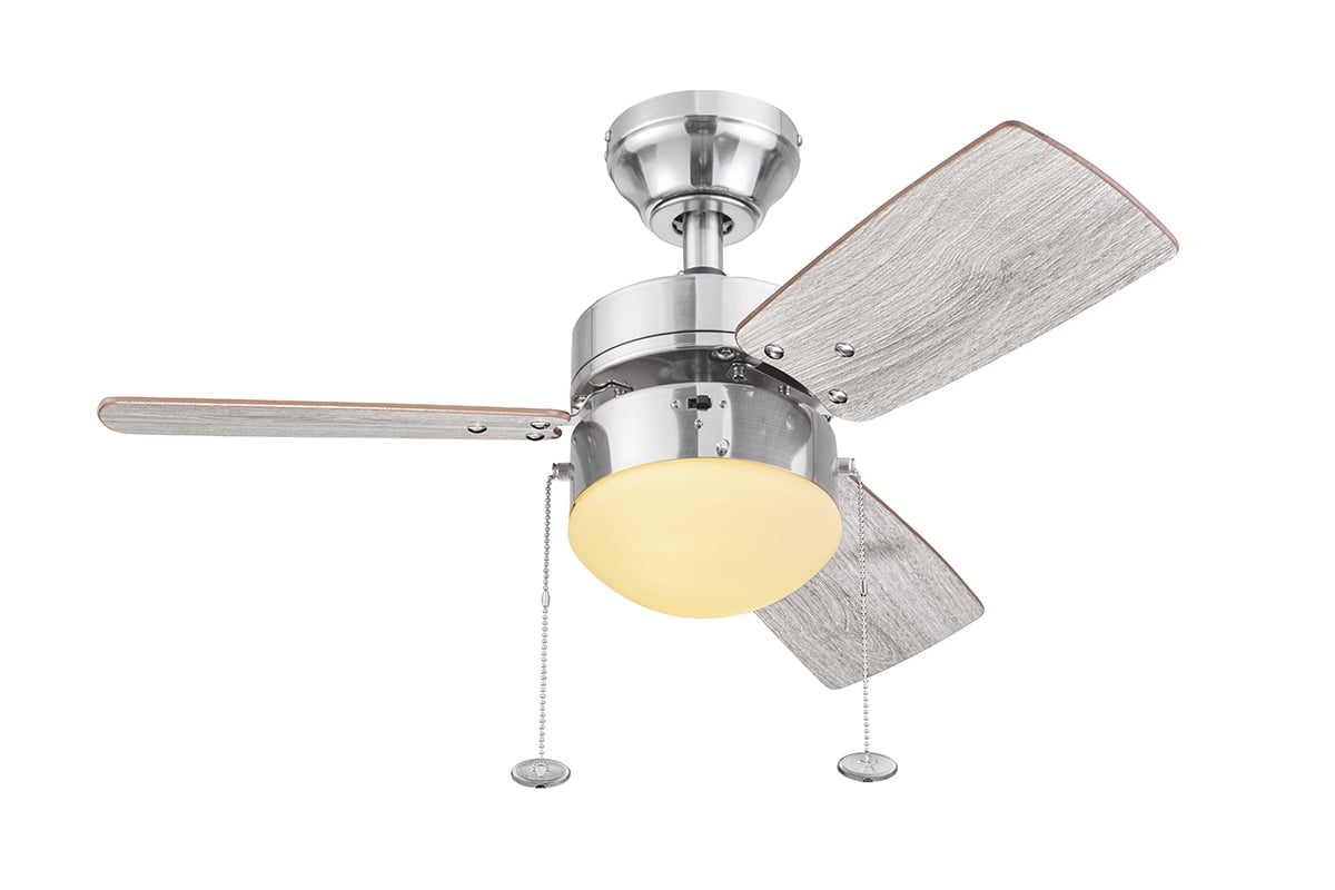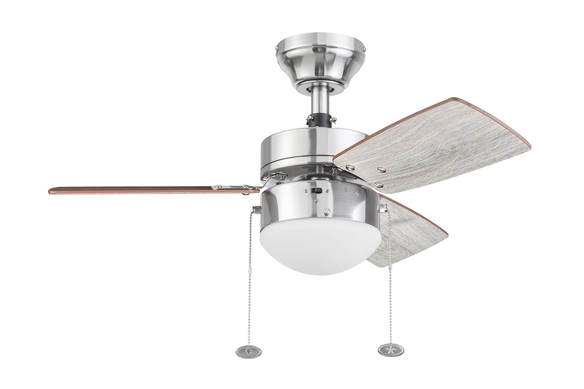 The Better Homes & Gardens 30″ 3 Blade Ceiling Fan in Oil-Rubbed Bronze is the perfect addition to your smaller trend-setting spaces, serving up both adequate air flow and a modern, contemporary aesthetic. With three pull-chain adjustable speed settings, this fan is sure to deliver a high quality, quiet performance while saving energy both in the summer and winter months. It is very easy to install and can be conveniently mounted from both standard and angled ceilings. It includes two E26, B11 LED bulbs, sure to illuminate your space through a timeless frosted globe. Each of the five blades is reversible, offering a choice between trendy Rough Pine or classic Chocolate Maple, both equally complementing the deep Bronze housing finish. This fan’s small size makes it a perfect match for any small room- home offices, laundry rooms, bedrooms, and kitchens. This fan is also backed by a limited lifetime warranty.