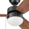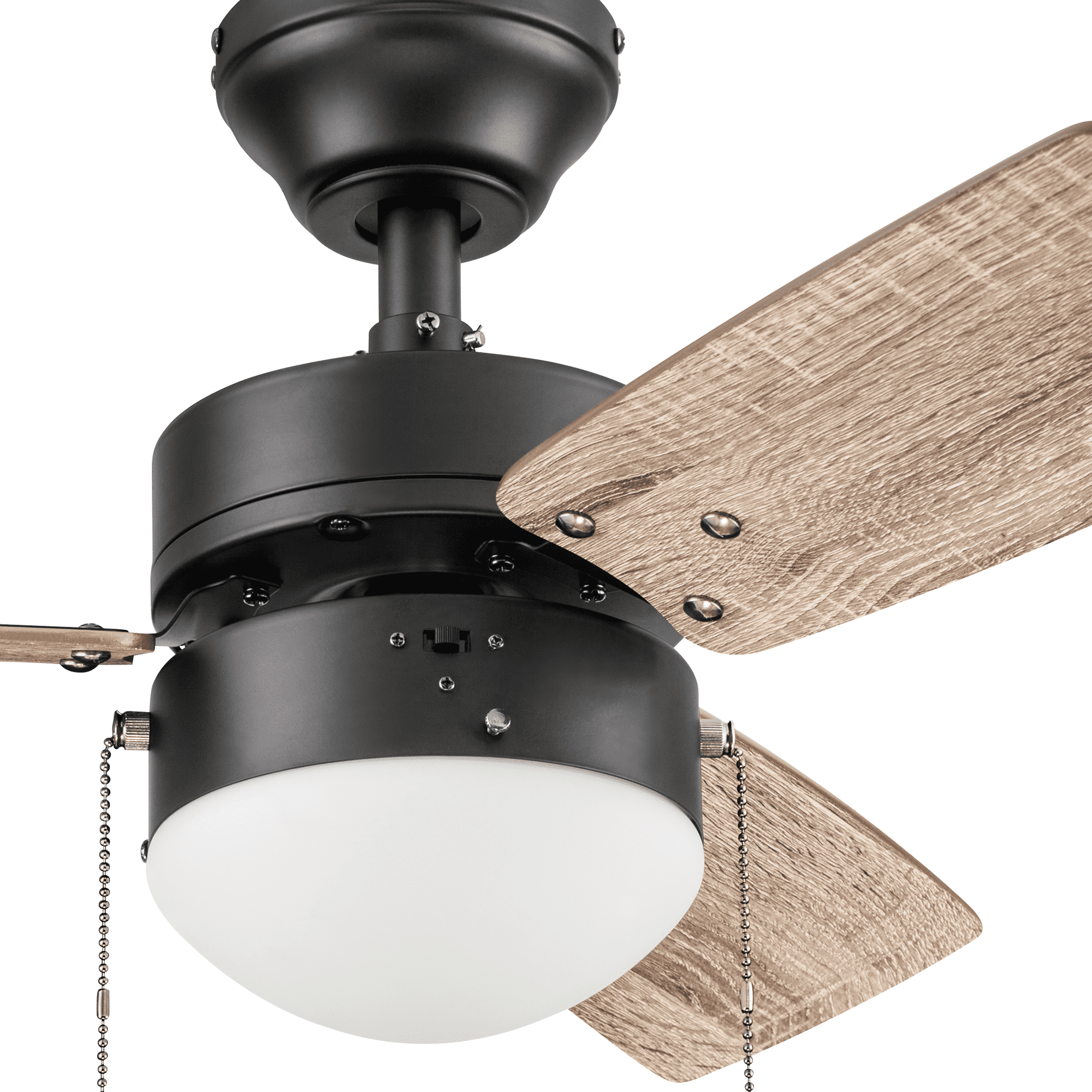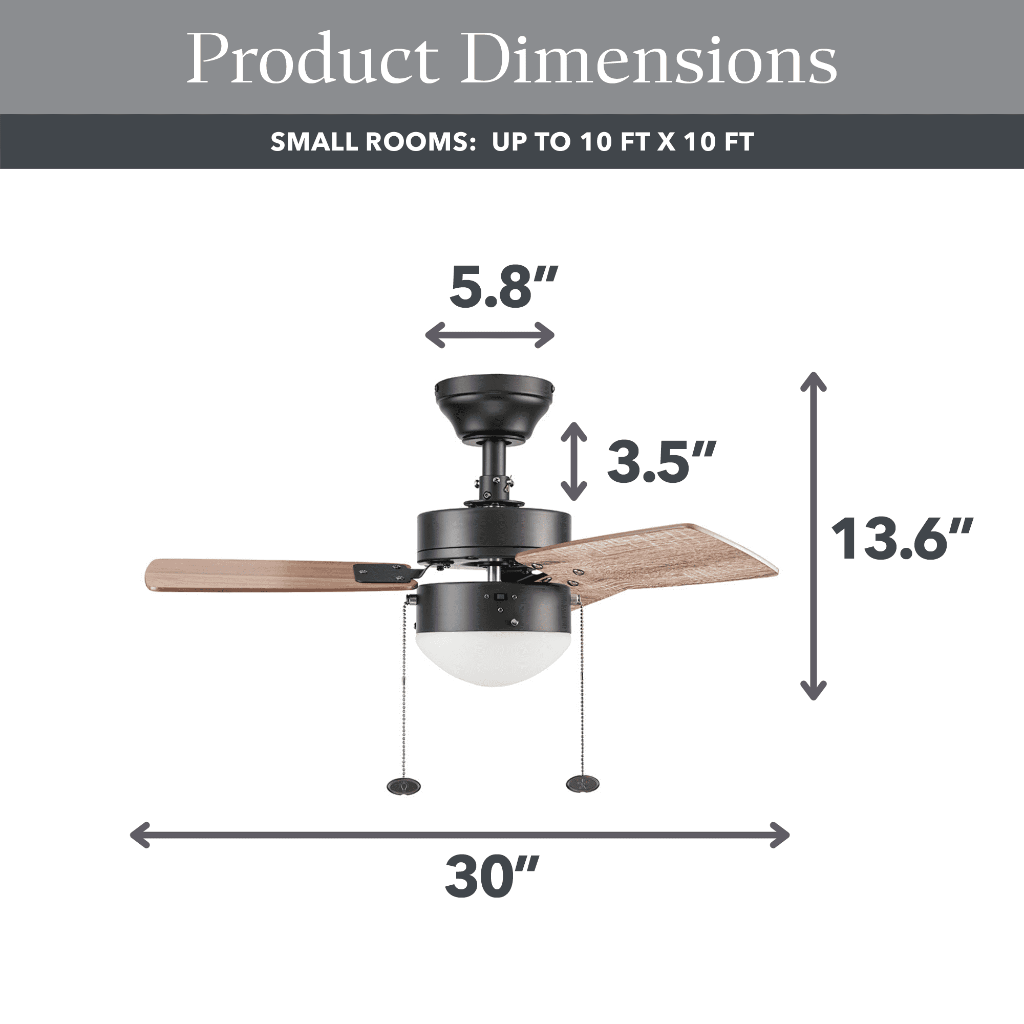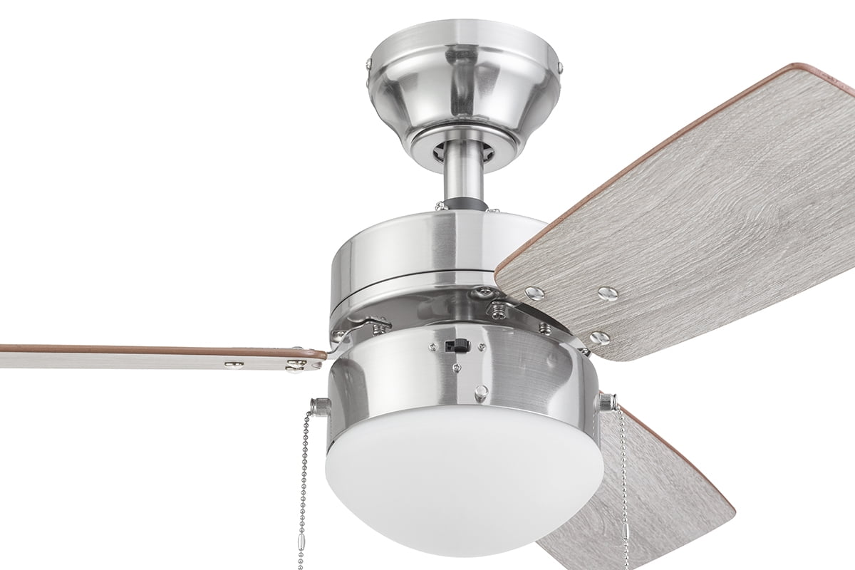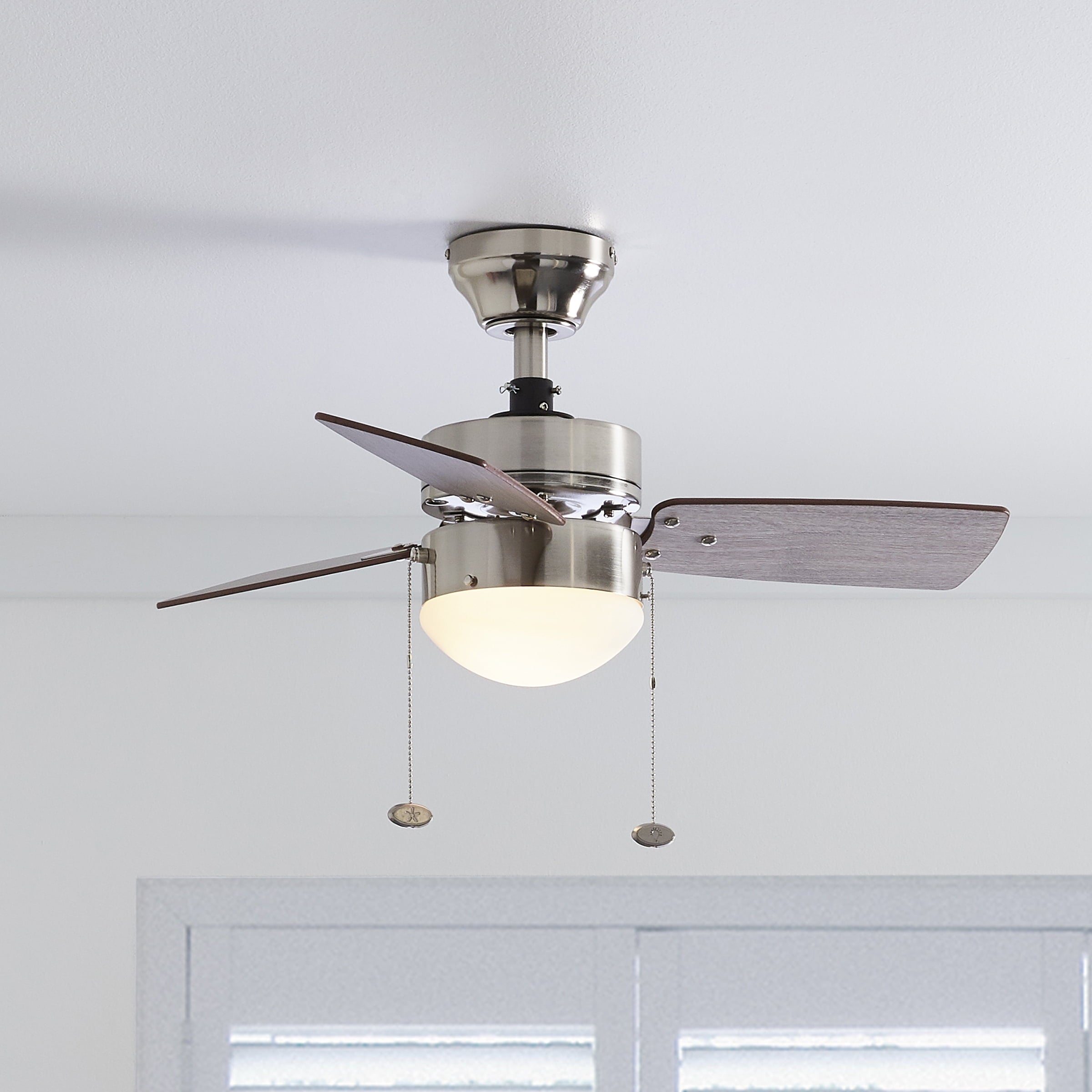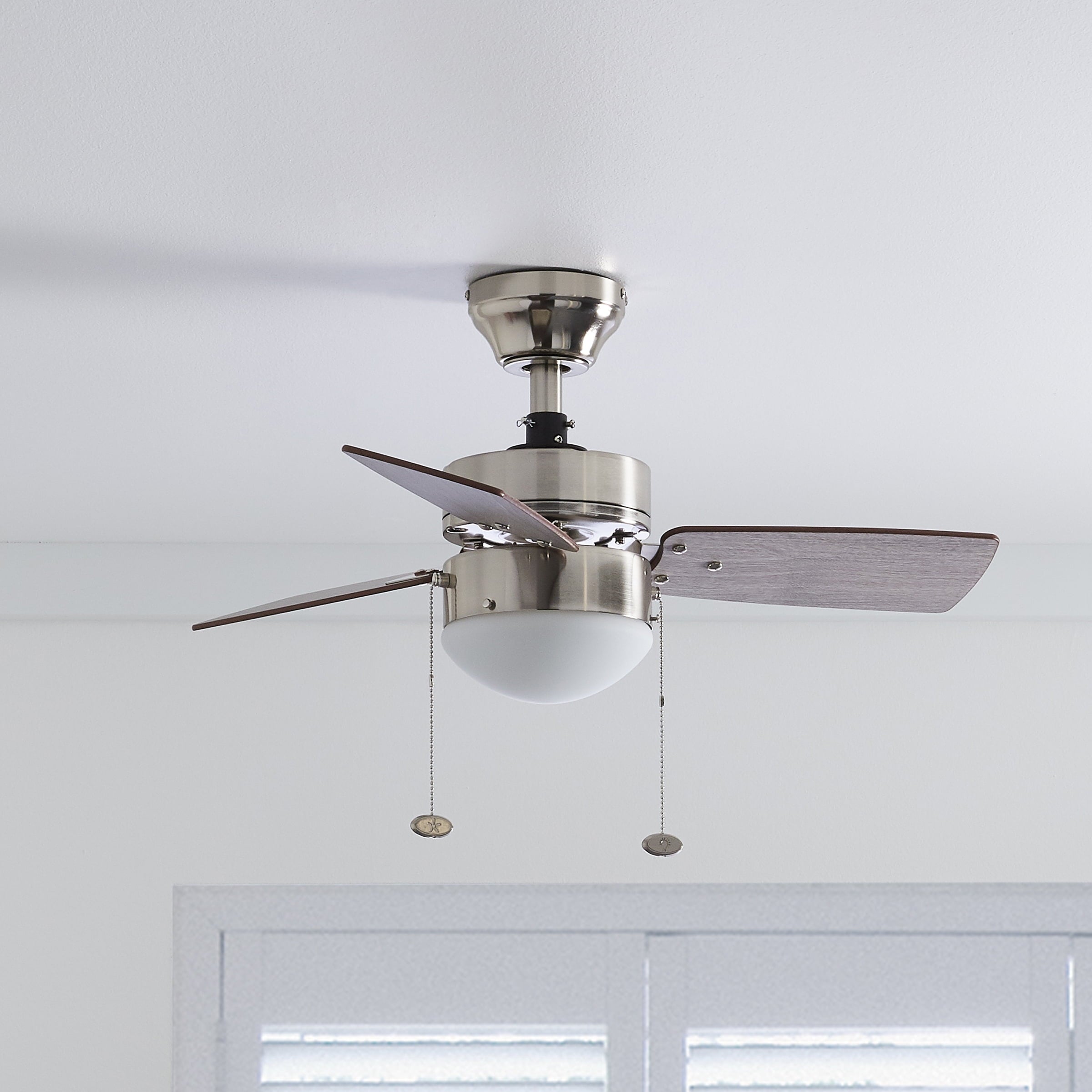 The Better Homes & Gardens 30″ 3 Blade Ceiling Fan in Oil-Rubbed Bronze is the perfect addition to your smaller trend-setting spaces, serving up both adequate air flow and a modern, contemporary aesthetic. With three pull-chain adjustable speed settings, this fan is sure to deliver a high quality, quiet performance while saving energy both in the summer and winter months. It is very easy to install and can be conveniently mounted from both standard and angled ceilings. It includes two E26, B11 LED bulbs, sure to illuminate your space through a timeless frosted globe. Each of the five blades is reversible, offering a choice between trendy Rough Pine or classic Chocolate Maple, both equally complementing the deep Bronze housing finish. This fan’s small size makes it a perfect match for any small room- home offices, laundry rooms, bedrooms, and kitchens. This fan is also backed by a limited lifetime warranty.