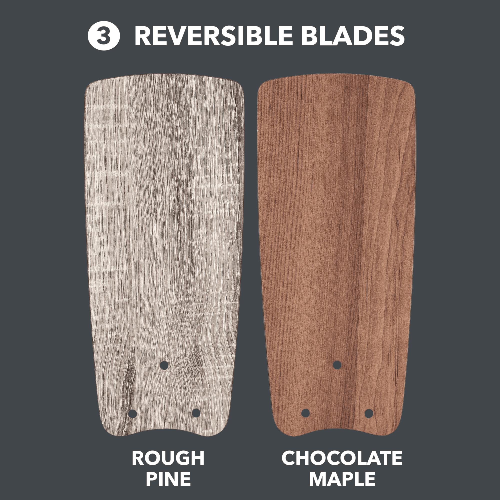 • 3 Reversible Blades- Choice of Trendy Rough Pine or Classic Chocolate Maple Finishes