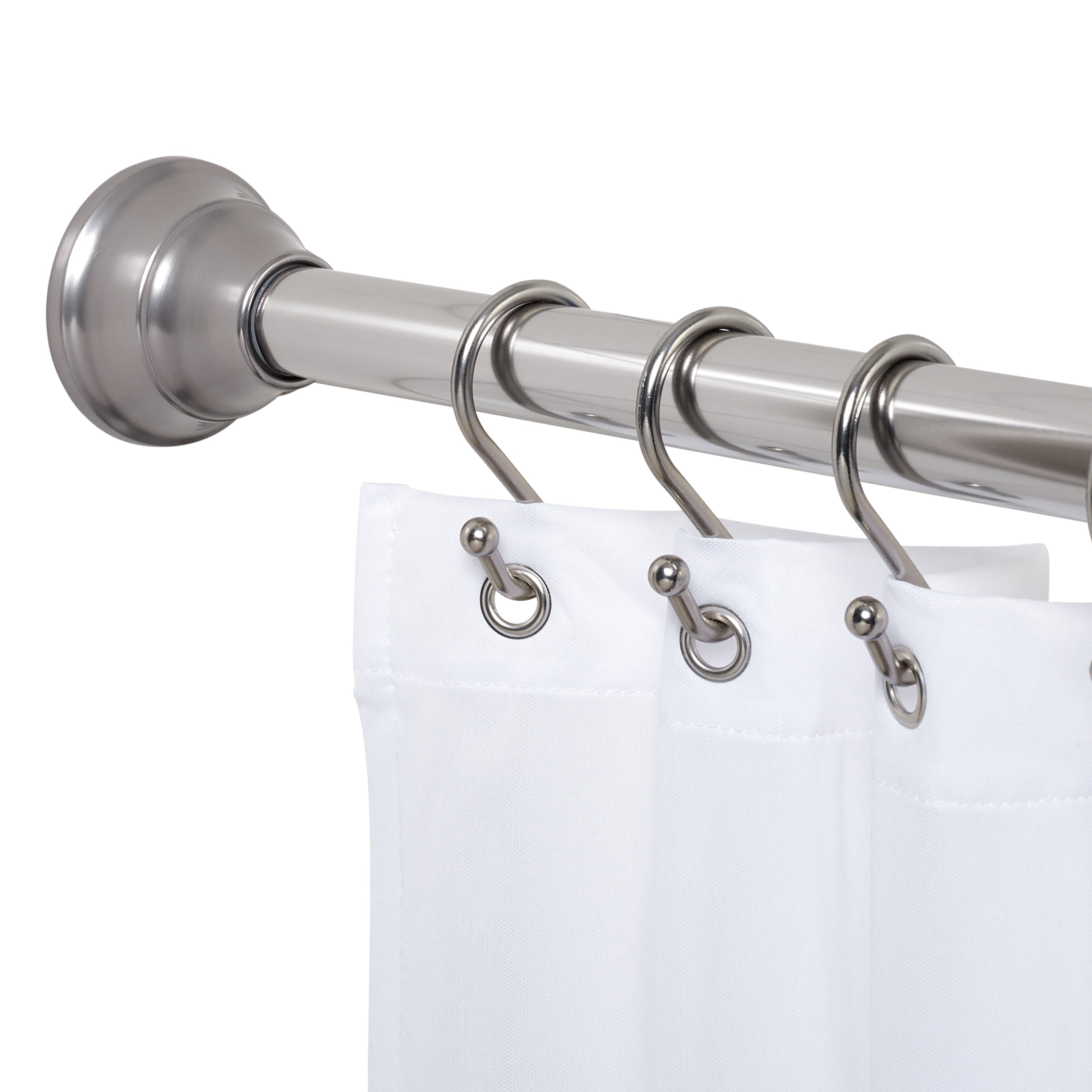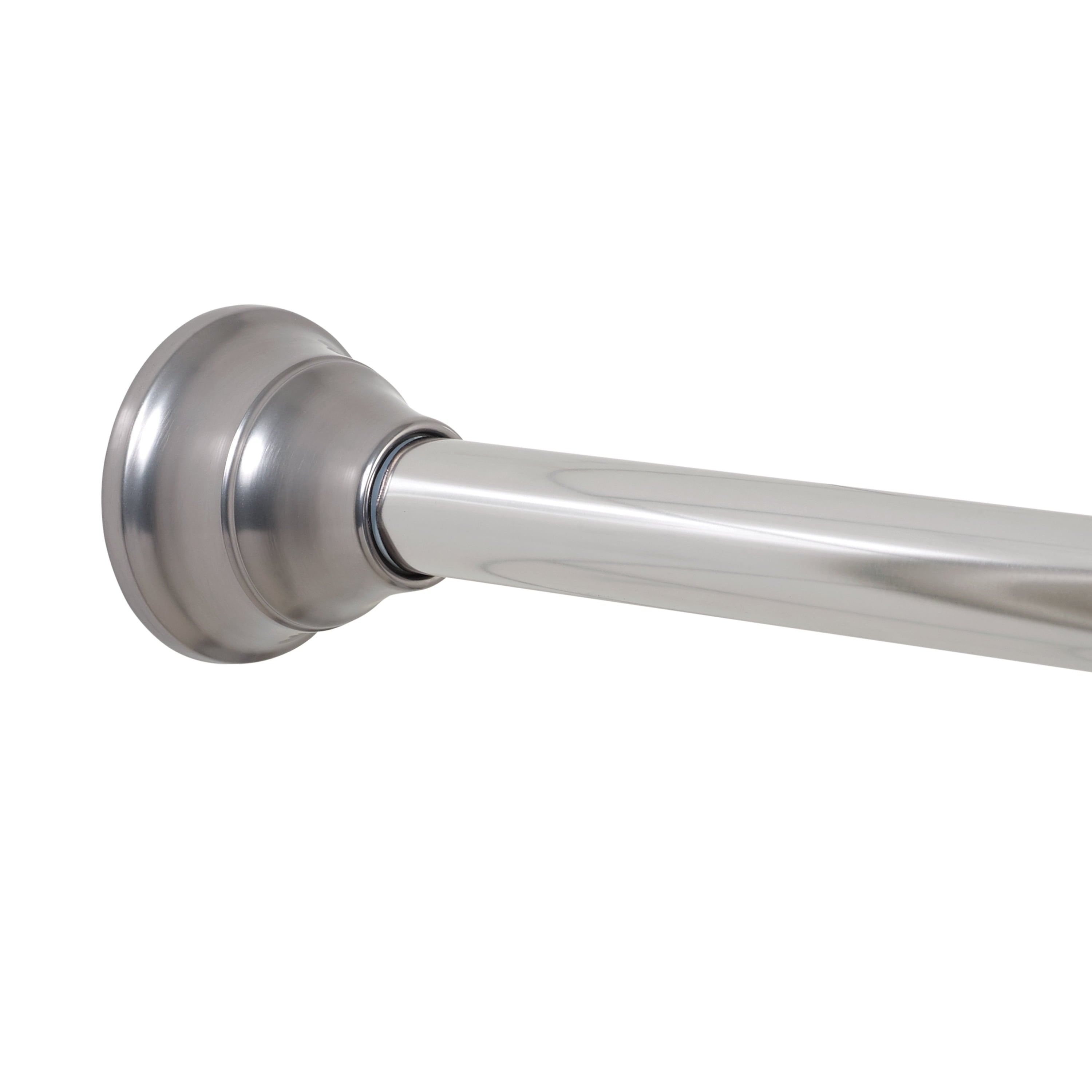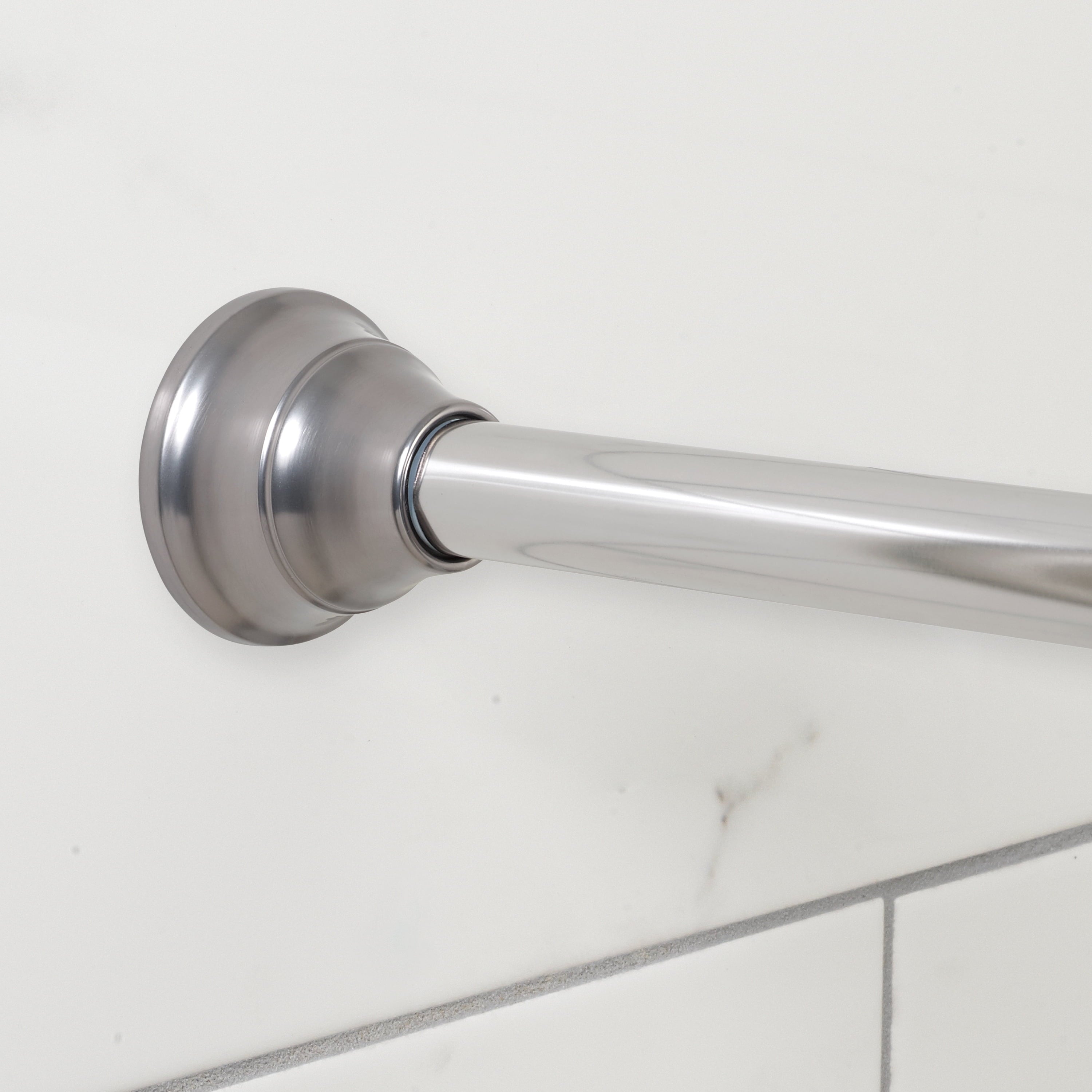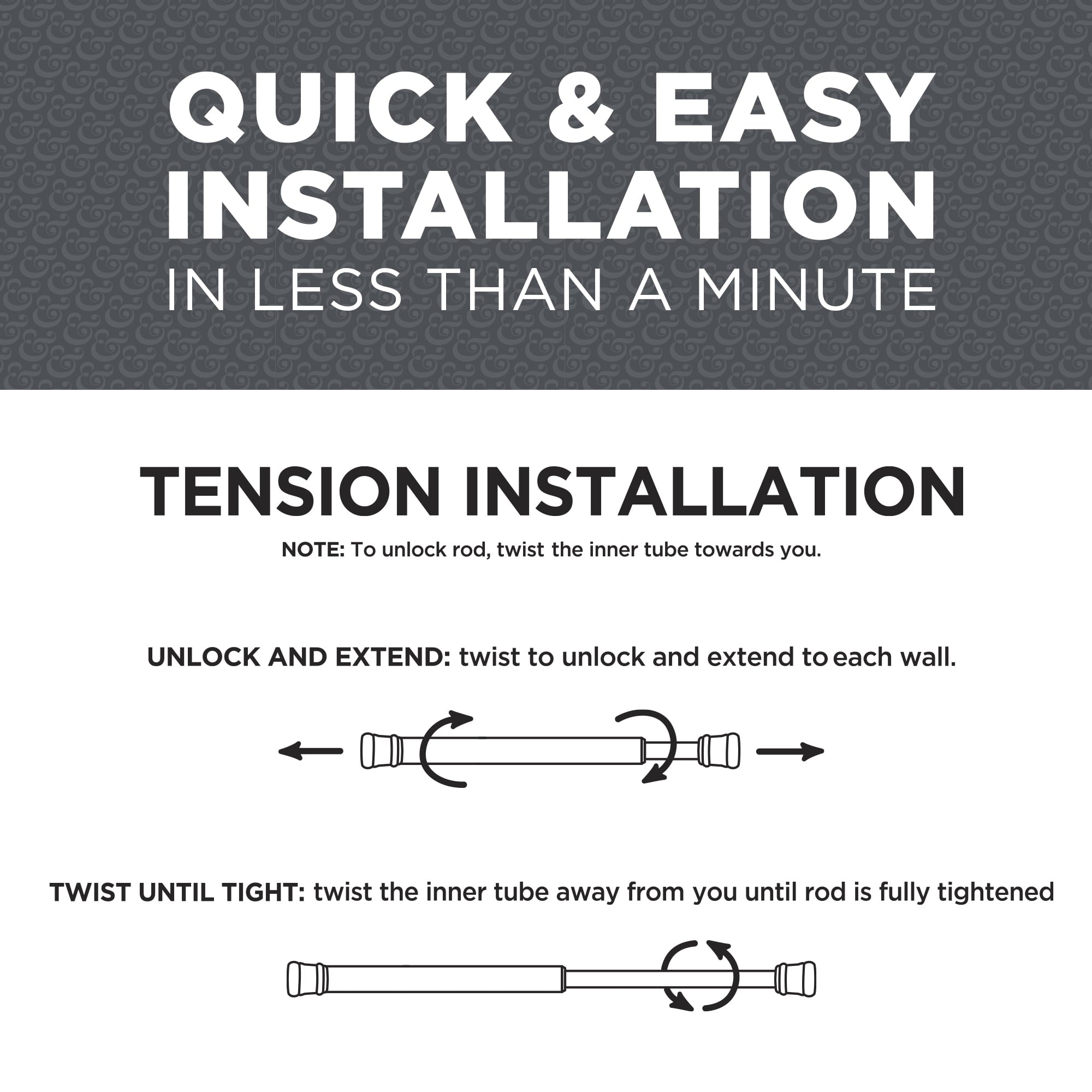 The Better Homes & Gardens Easy Hang Decorative Tension Shower Curtain Rod in brushed nickel is at once modern and timeless, with a minimalist contemporary design accented by sleek stepped “wave” finials. Made of rustproof aluminum, the shower rod has a no rust lifetime guarantee. With its sturdy 1-inch diameter, this rod is made to last. It easily adjusts to fit standard tub and shower spaces from 43 to 72 in. For easy installation, the rod has a tool-free tension mechanism that requires only 2 steps: Unlock the rod and extend to desired length; and then twist the rod until tight to lock securely in place.
