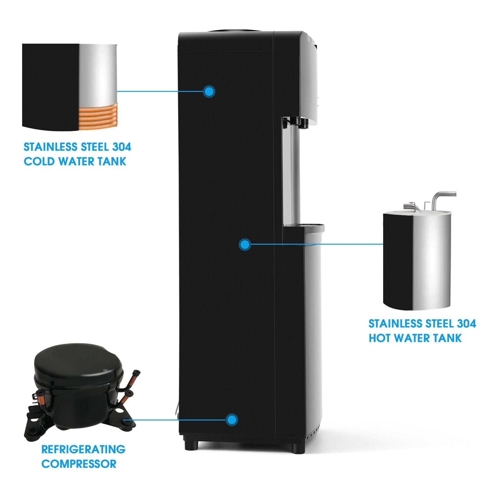 The convenient Top loading design of our water cooler machine makes it easy to use in any room. The water cooler comes with a 3.4L SUS304 stainless steel cold tank and a 1L SUS304 stainless steel hot tank to meet your needs. This water dispenser is operating with a built-in compressor for dispensing ice-cold water. COLDWATER TEMP: 43°F-50°F, HOT WATER TEMP: 190°F-203°F, Compressor Cooling System allows you to enjoy the ice-cold water at any time. This dispenser uses 3-5 Gallon bottles, which reduces waste from single-serve bottles. It offers a choice of HOT/COLD/ROOM 3-water temperatures. Comes with a child safety lock. The easy-to-use push button spouts make it so much more convenient to use. Equipped hot tank drain helps you to clean the tanks. The water cooler is ETL Certificate and complies with all safety standards. Save energy while enjoying a cold drink.