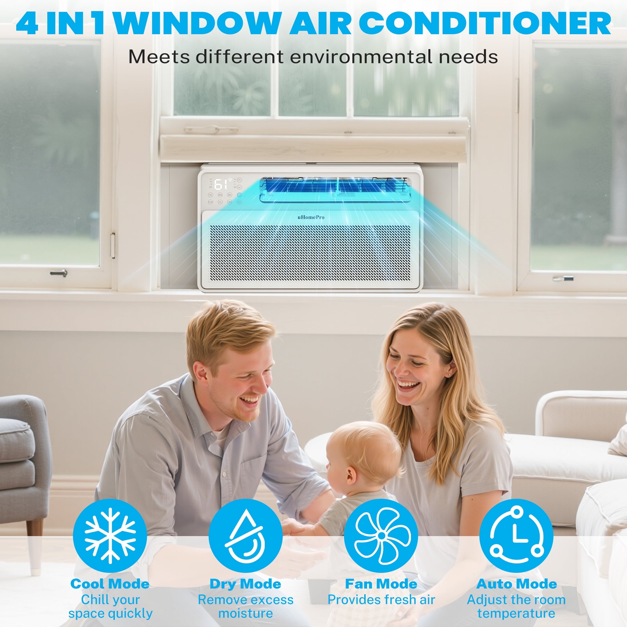4-𝐢𝐧-𝟏 𝐖𝐢𝐧𝐝𝐨𝐰 𝐀𝐢𝐫 𝐂𝐨𝐧𝐝𝐢𝐭𝐢𝐨𝐧𝐞𝐫: Combines air conditioner, fan, Auto, and dehumidifier functions in one unit. The Cool mode cools your space efficiently, perfect for hot summer days. The Fan mode provides a gentle breeze, ideal for mild spring and fall weather. The Dry mode reduces excess moisture on wet days.