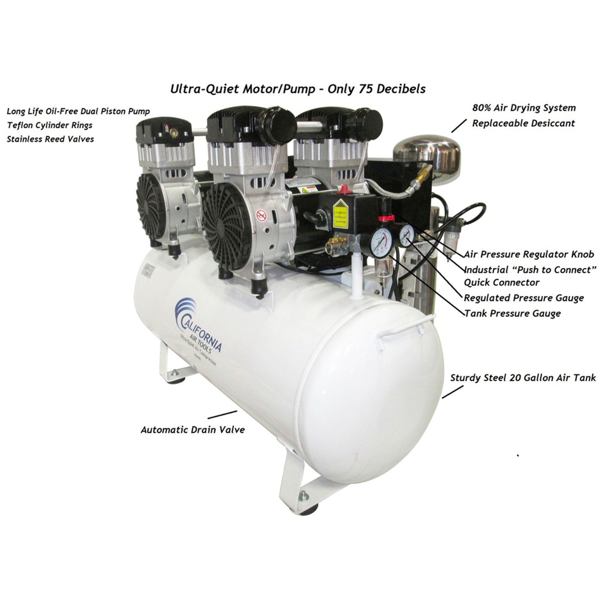 The California Air Tools 20040DCAD 4 HP 20 Gallon Ultra Quiet Steel Tank Air Compressor is designed to be one of the quietest 4.0 HP air compressors in the industry having only 75 dBs of sound. The powerful two 2.0 HP motors operates at only 1,680 RPM creating less noise, vibration and creating less wear. The oil-free dual piston pump system is engineered for longevity, high performance and durability. The large 20 Gallon Steel Air Tank is the right size for most all locations.
