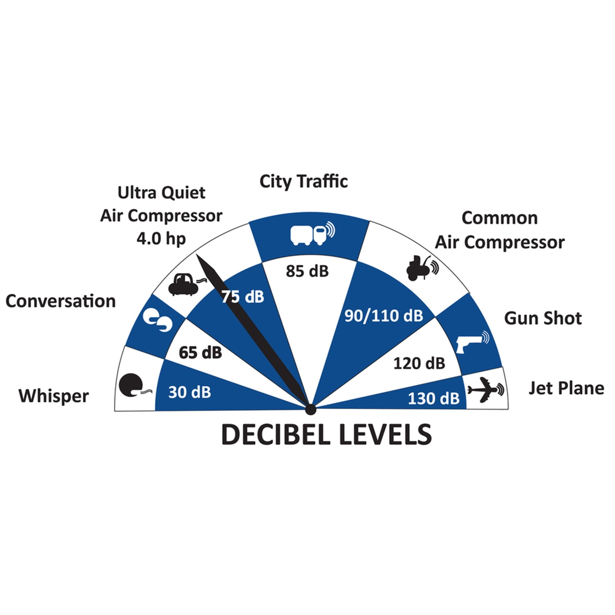 - Designed to be one of the quietest 4.0 HP air compressors in the industry having only 75 decibels of sound