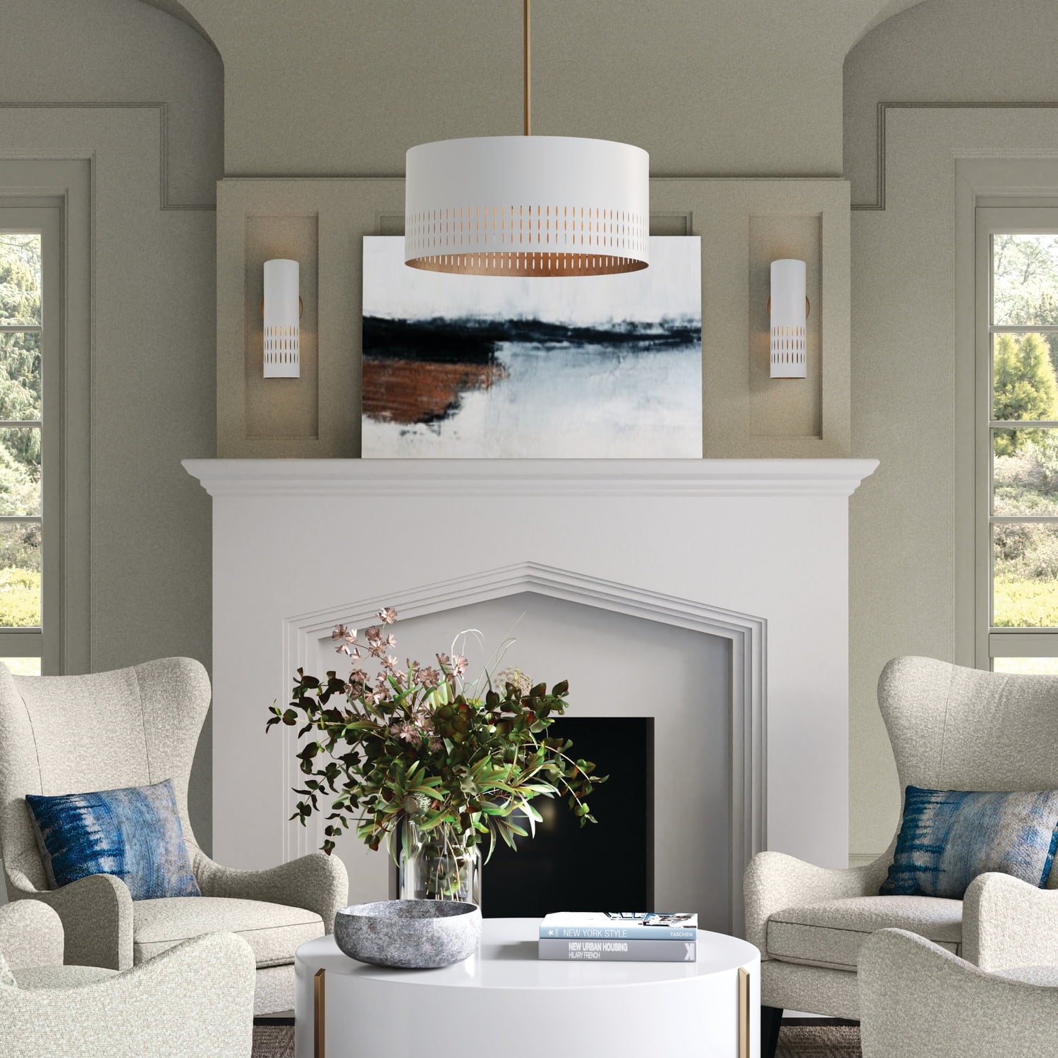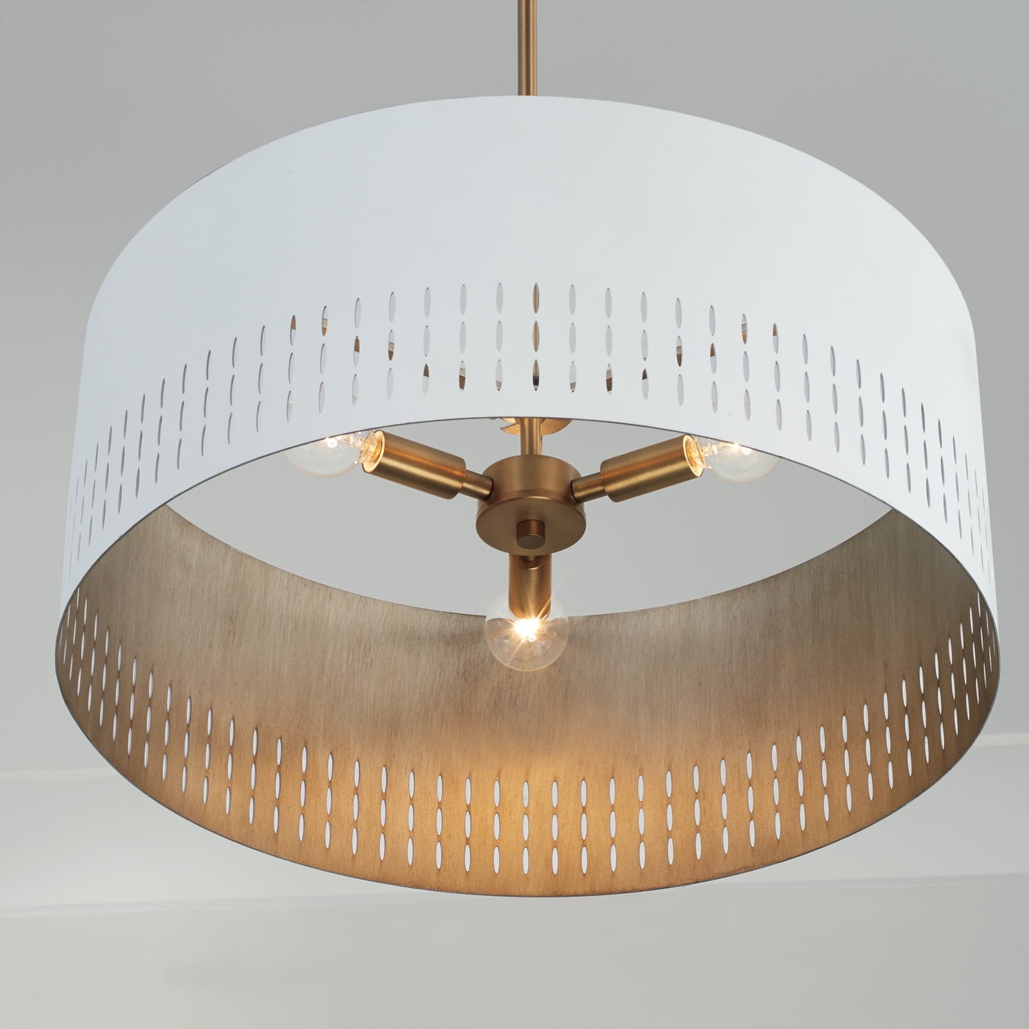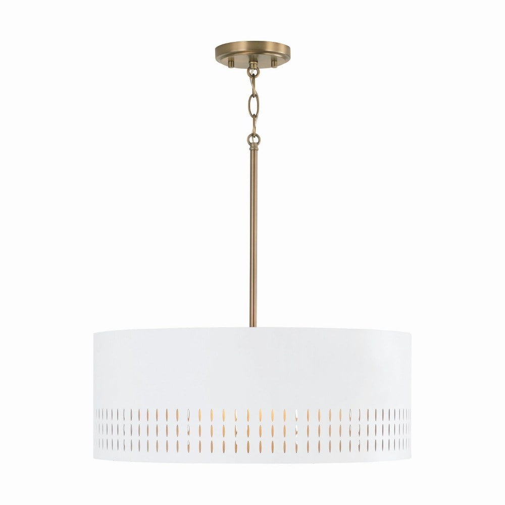Capital Lighting-350233AW-Collection: Dash, Material: Metal, Finish Color: Aged Brass/White, Width: 20.25″, Height: 8″, Depth: 20.25″, Hanging Method: Rod and Chain, Chain Length: 12″, Lamping Type: Incandescent, Number Of Bulbs: 3, Wattage: 180 Watts, Moisture Rating: Dry Rated, Desc: Mid-century style meets modern metal in the Dash Medium Pendant. The striking cut-outs create character against the smooth White finish, and Aged Brass paints a warm backdrop on the inside of the metal shade to add dimension for standout style. DIMENSIONS: Overall: 20.25″W x 8″H; Adjustable Hanging Height: 14.75″ – 58.75″; Includes 12″ Chain; 120″ Wire and Rods Included 6″(1),12″(1) & 18″(1)L. / DETAILS: Metal shade with painted aged brass interior emits a warm glow and the intricate cutouts create illuminating character. / FINISH: Smooth to touch, the combination finish of a warm, honey-gold Aged Brass and a neutral, soft White create a sophisticated look. The scouring technique used on the Aged Brass brings a brushed visual texture and compliments the crisp White tone. / BULBS: Designed to be dimmable and LED/CFL/Incandescent bulb compatible, this fixture uses 3 – 60 Watt (max) E12 Candelabra base bulbs (not included). It’s shown here with a G16 lamp. / FEATURES: Rated for dry locations; includes a 1-Year Manufacturer Warranty.. ,-Dash – 3 Light Pendant In Art Deco Style-8 Inches Tall and 20.25 Inches Wide -Traditional Installation