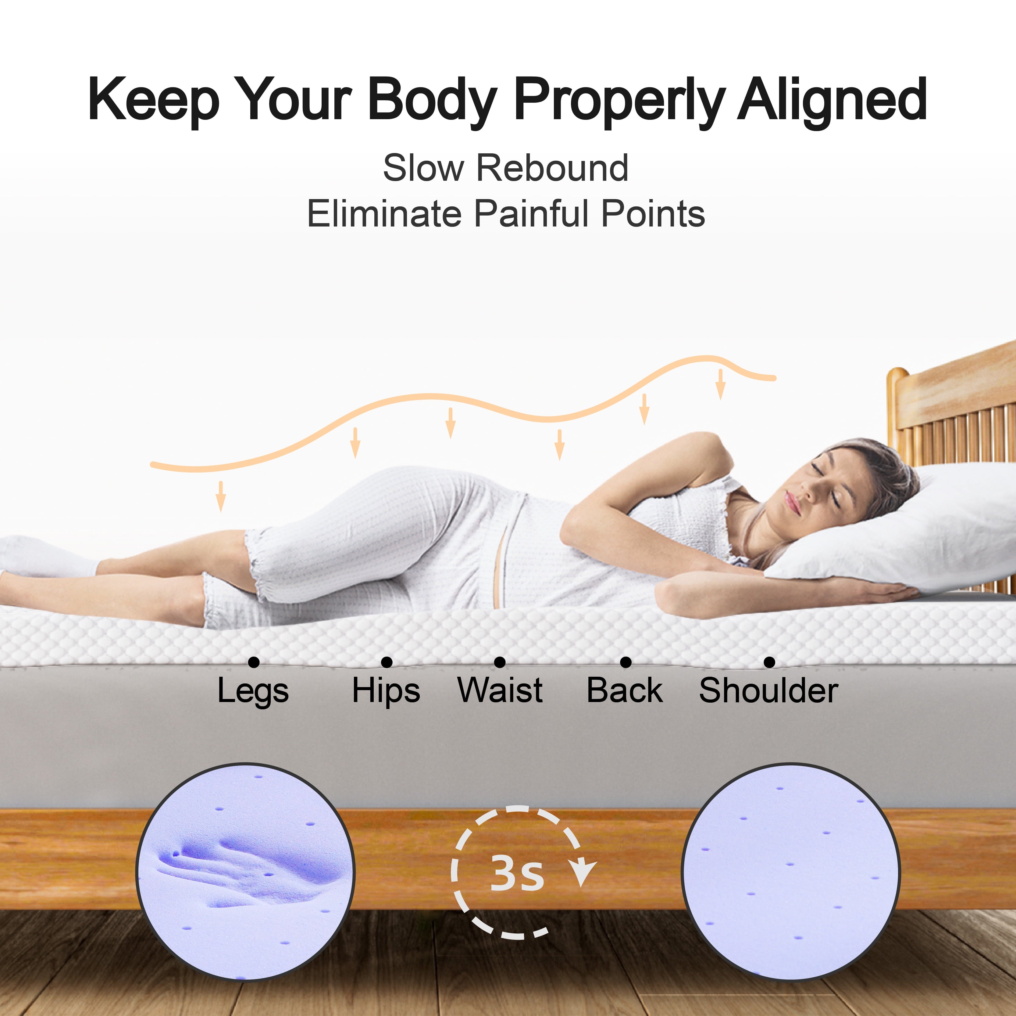 • 【Pressure Relief & Spinal Alignment】3-inch memory foam topper adapts to your body’s curves, evenly distributing weight to relieve pressure on hips, shoulders, and joints. Maintains neutral spine alignment for deeper sleep—no more morning aches!