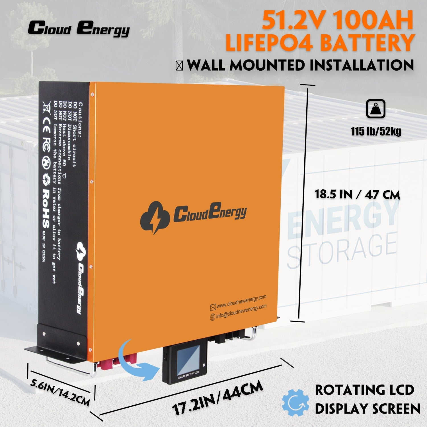 - 【Wall & Rack 2 in 1 Mounted and Dual Terminal configurations】 Cloud Power 48V 100Ah batteries are available in wall and rack mount configurations with a rotatable LCD screen for a variety of installations and applications. Our batteries also feature a one-touch switch for simplified operation and an automatic circuit breaker safety feature that shuts off power at high load currents to protect the 48V system. In addition, the battery’s dual positive and negative terminal design evenly distributes current to minimize heat and prevent overheating.