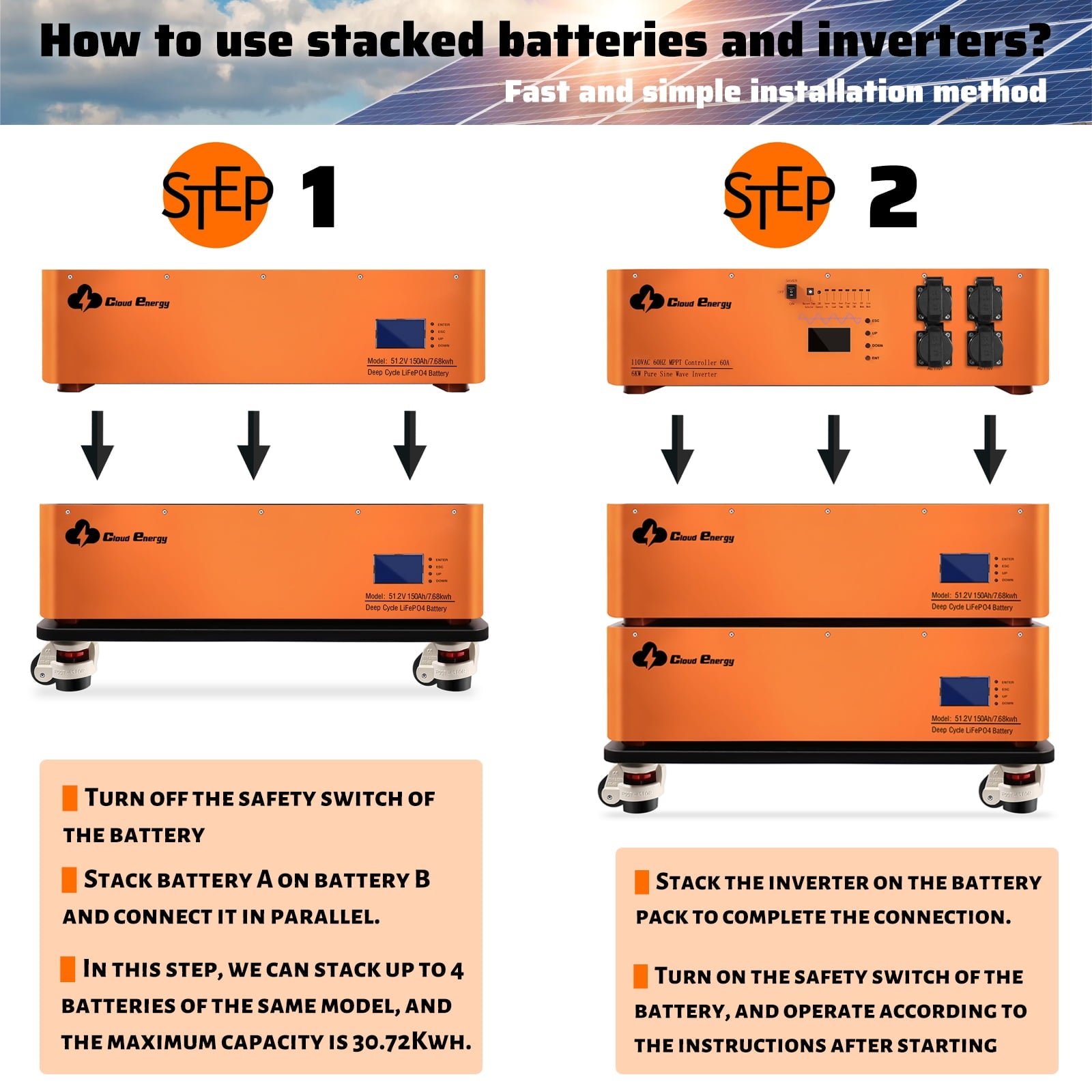 - 【More Advantages】: The 48V 150Ah batteries support recharging by solar power, wall outlet and generator. It can maximize the use of solar energy to save your electricity costs, get power immediately during a power outage and reduce carbon footprint.