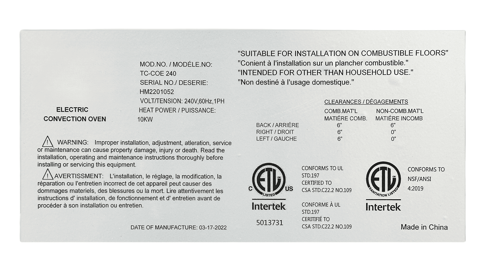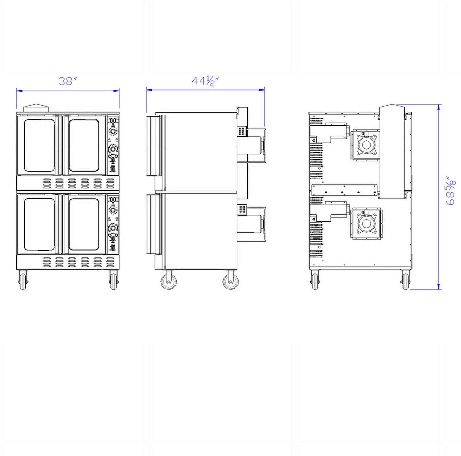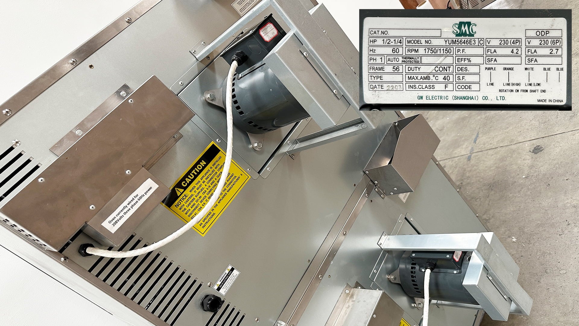 Total 10kW,208V or 240V, 60Hz,1 or 3 phaseIndependent doors with full-view windowsTwo speed,1/2 hp fan motor(1725/1140rpm)Temperature range: 150°F-500°F(66°C-260°C)Forced “cool down” fan mode
