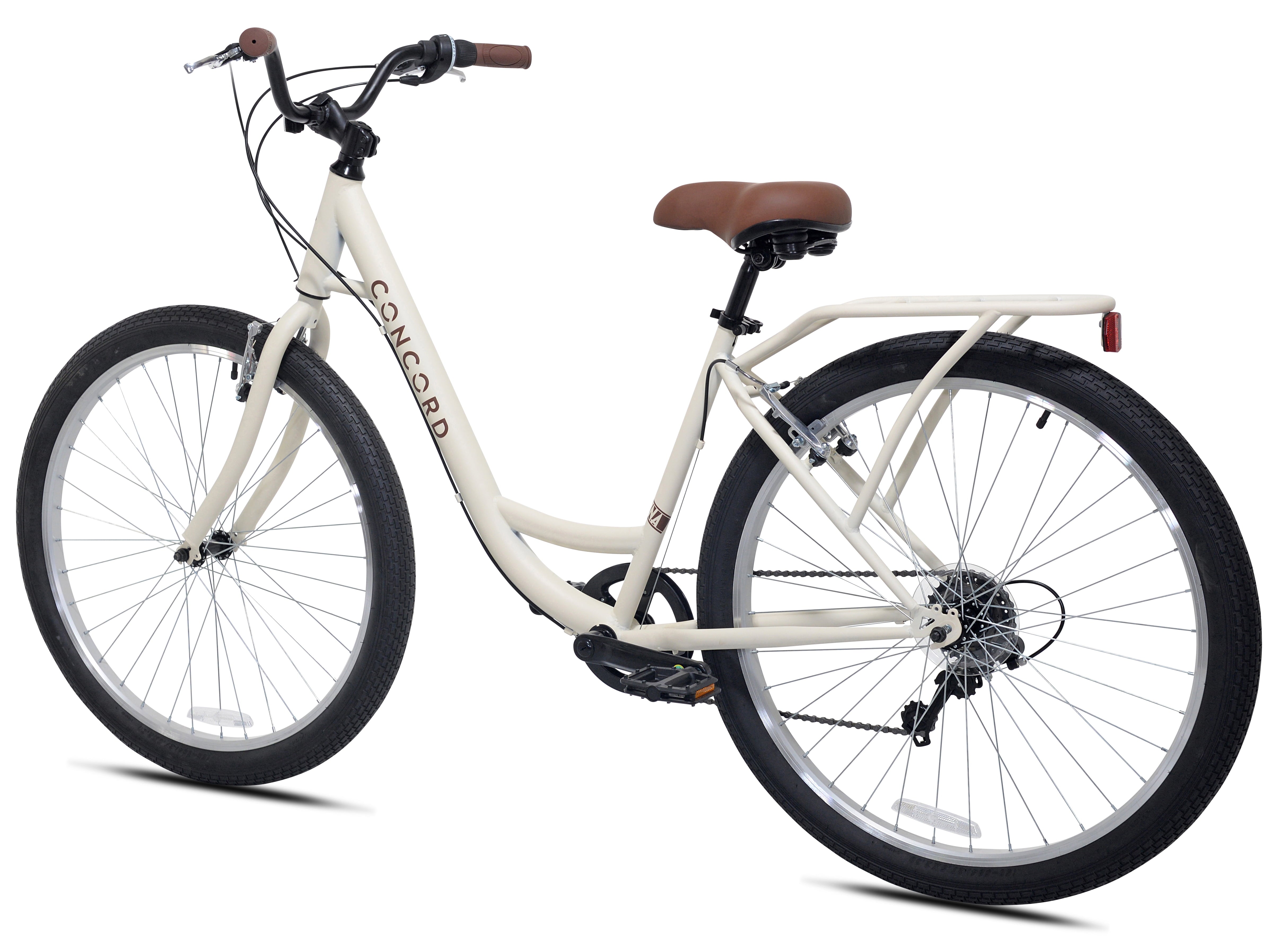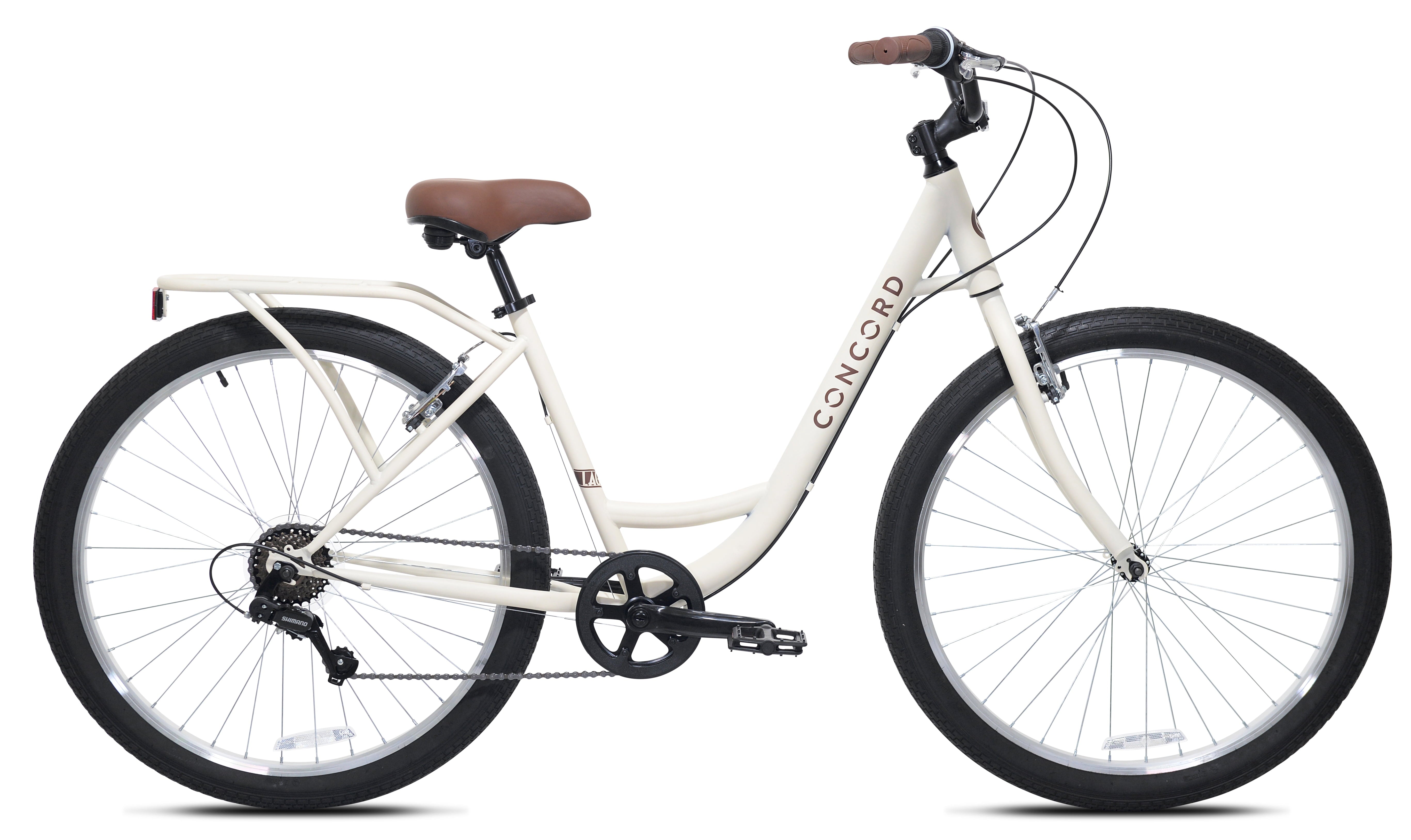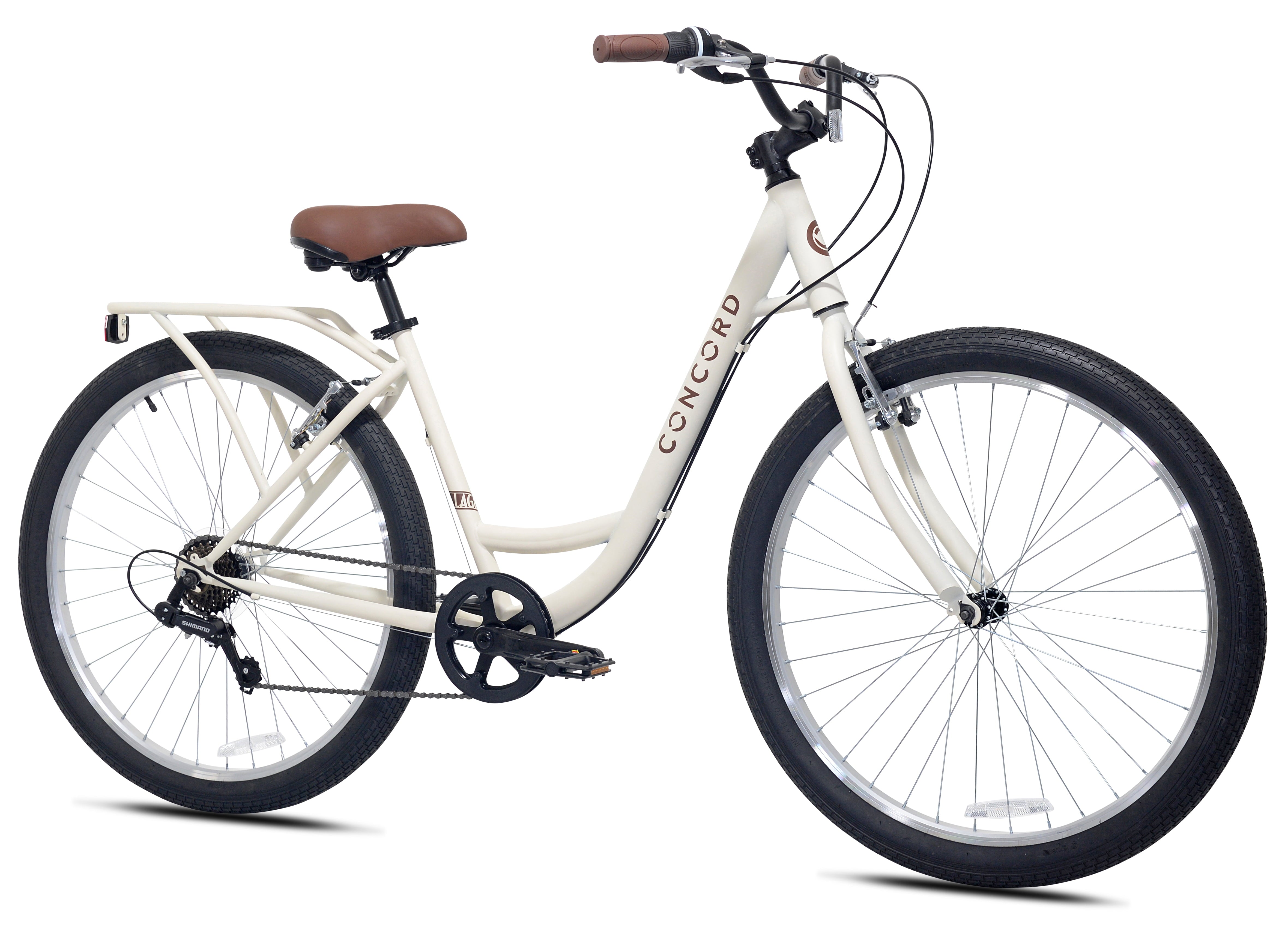 The 27.5″ Concord Laguna comfort bike hits the sweet spot with its capability, versatility, and affordability. This unisex bike is designed specifically for your comfort. The low step frame is easy to get on and off. The comfort seat has elastomer springs to absorb bumps in the road. Quickly and smoothly transition through the 7 speeds with the twist shifters as you cruise around town. The Concord Laguna is for teens and adults. Recommended for riders 5’4″-6’2″.