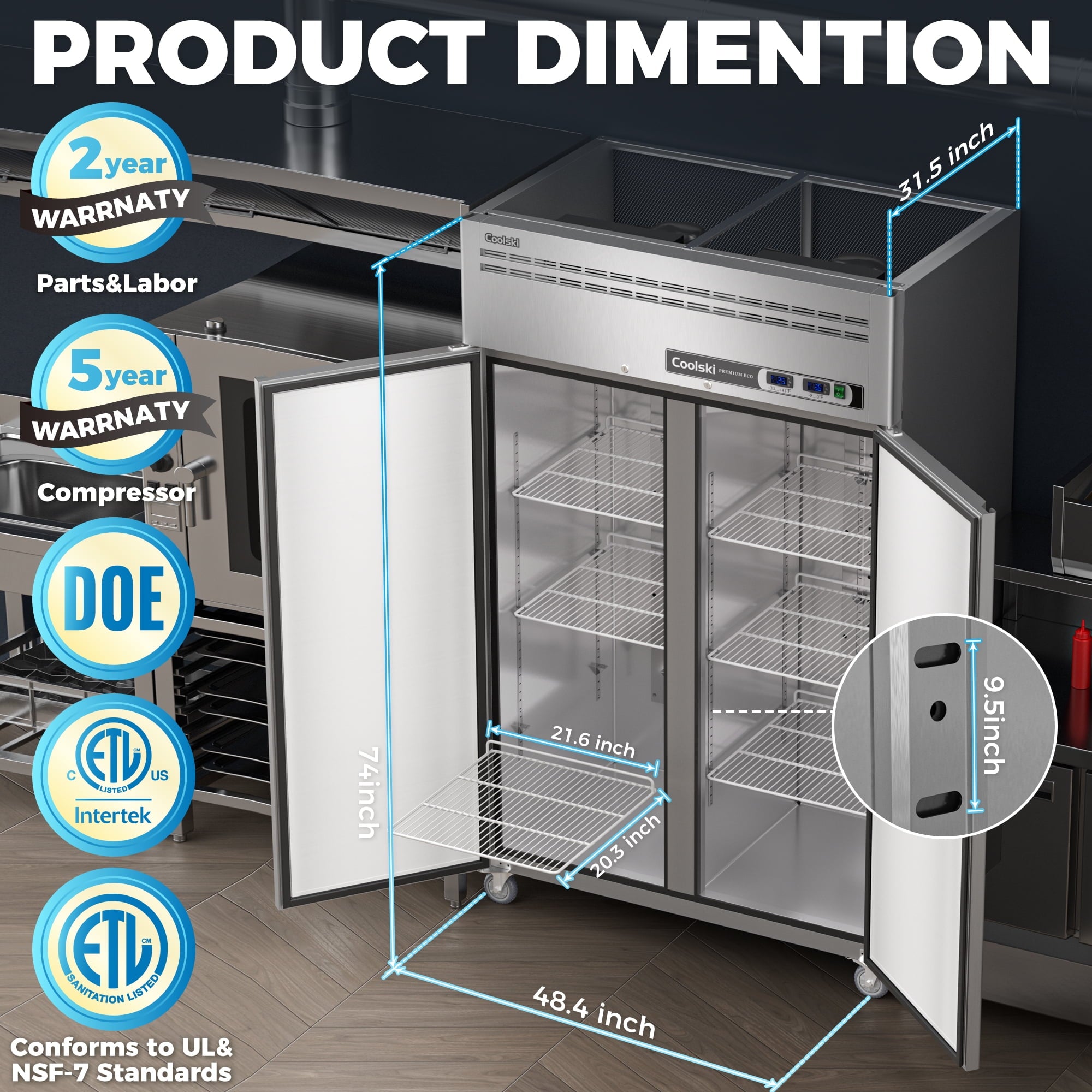 “The COOLSKI Coolski 48″” W Commercial Refrigerator and Freezer Combo, 36 Cu.ft 2 Door Reach in Freezer for Restaurant is a durable and energy-efficient solution for commercial kitchens. Crafted with heavy-duty stainless steel, this dual-temp unit offers superior temperature retention and long-term reliability. The refrigerator compartment maintains a range of 33-41°F, while the freezer compartment reaches as low as -8°F, ensuring optimal storage for fresh meat, fruits, and vegetables. Equipped with a top-mounted refrigeration system, automatic defrost, and R290 hydrocarbon refrigerant, it delivers consistent cooling while being environmentally friendly. Featuring 6 adjustable shelves, LED lighting, and magnetic door gaskets, this spacious 36 Cu.ft unit is designed for convenience and organization. Its solid doors with recessed handles provide excellent insulation, while the auto-closing mechanism and door locks enhance functionality and security. Heavy-duty casters make it easy to move and position in tight kitchen spaces, making the COOLSKI Coolski 48″” W Commercial Refrigerator and Freezer Combo a reliable choice for restaurants.”