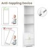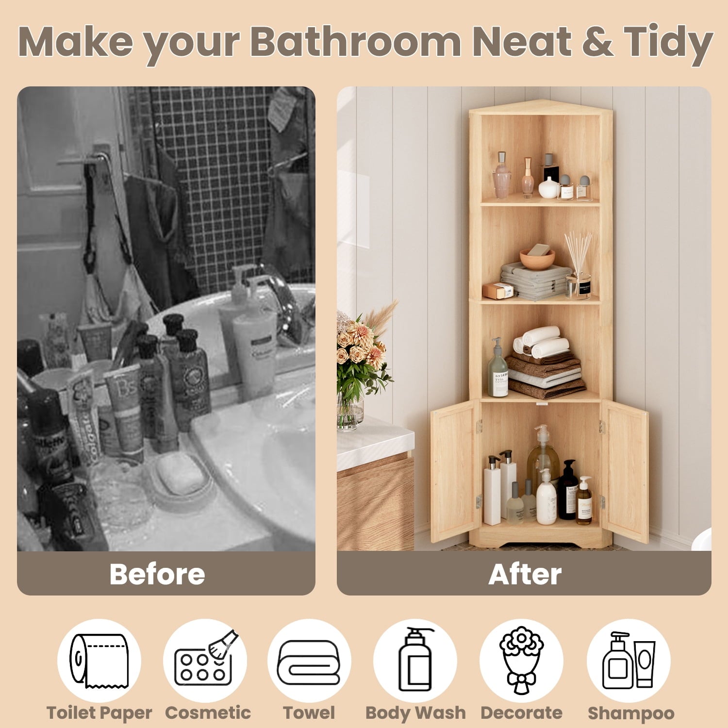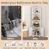 - Triangular Stable Structure: Natural open corner shelves are reinforced with an Triangular stable structure.The 90°right angle in the rear gives it the ability to stand freely or sit flush against a wall perfectly. Anti-tip accessories can firmly fix the cabinet organizer in place, ensuring stability and preventing shaking