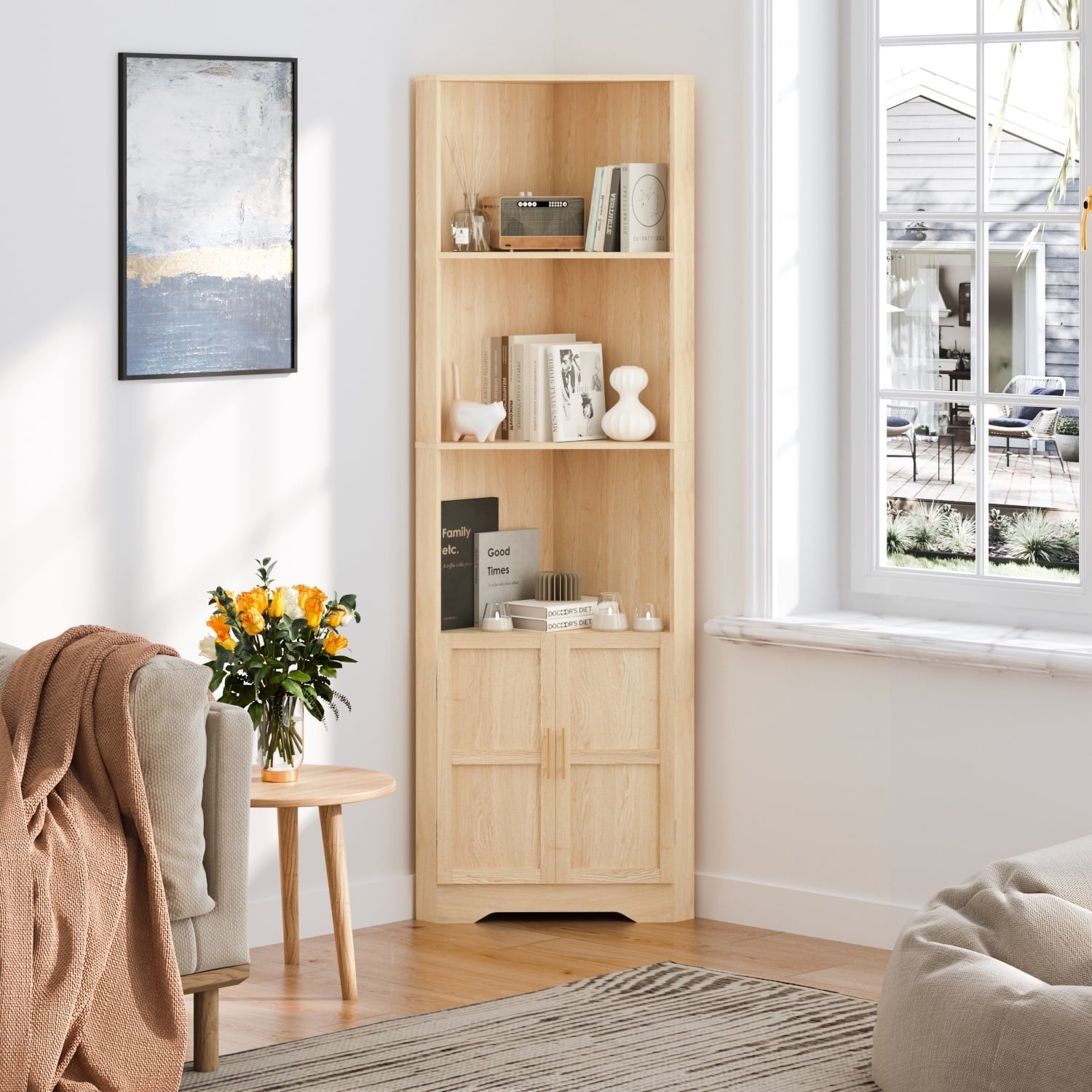 - Enlarging Storage Space:The tall corner cabinet maximizes the expanded storage space.Two open dividers and a cabinet with doors are perfect for organizing your household items.Most decorations, books, and kitchen items can be packed away in an orderly manner, and make space always kept tidy and clean