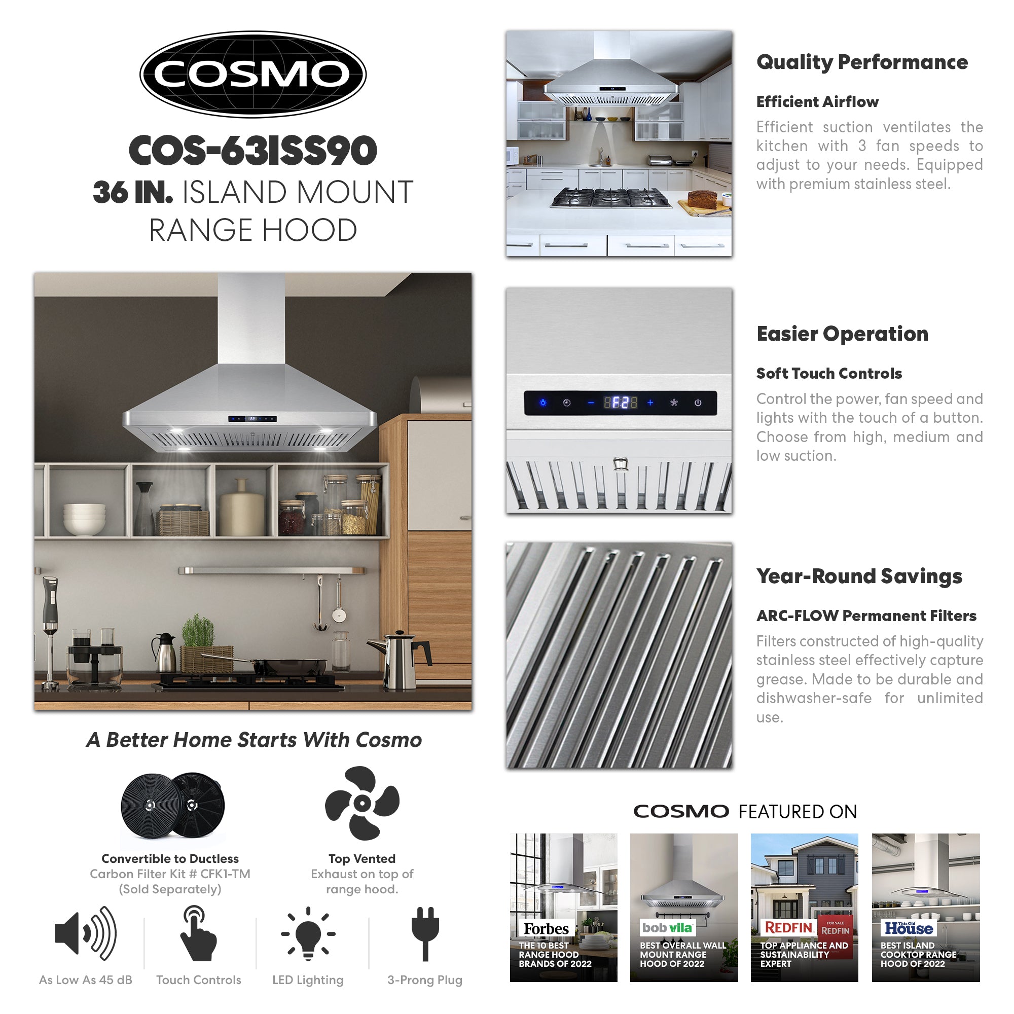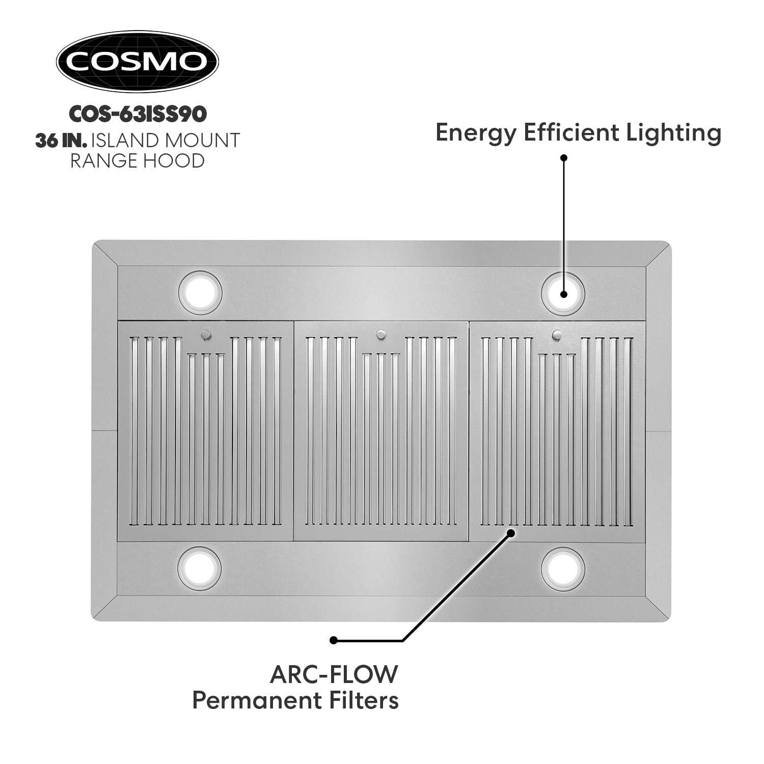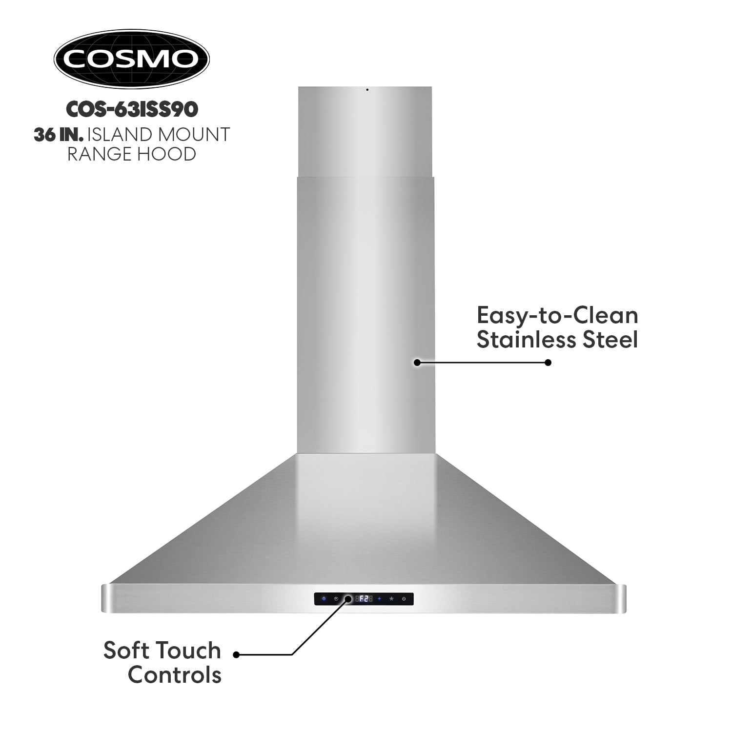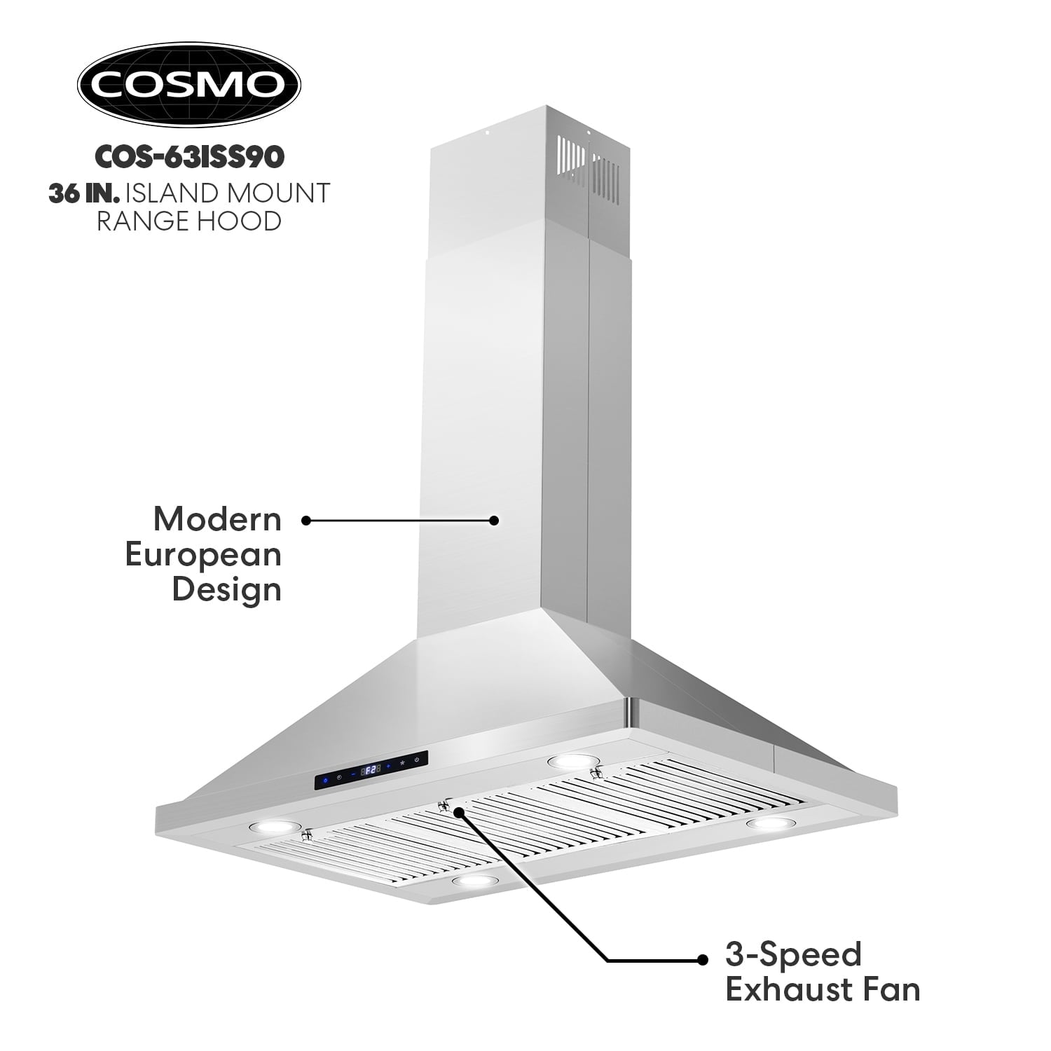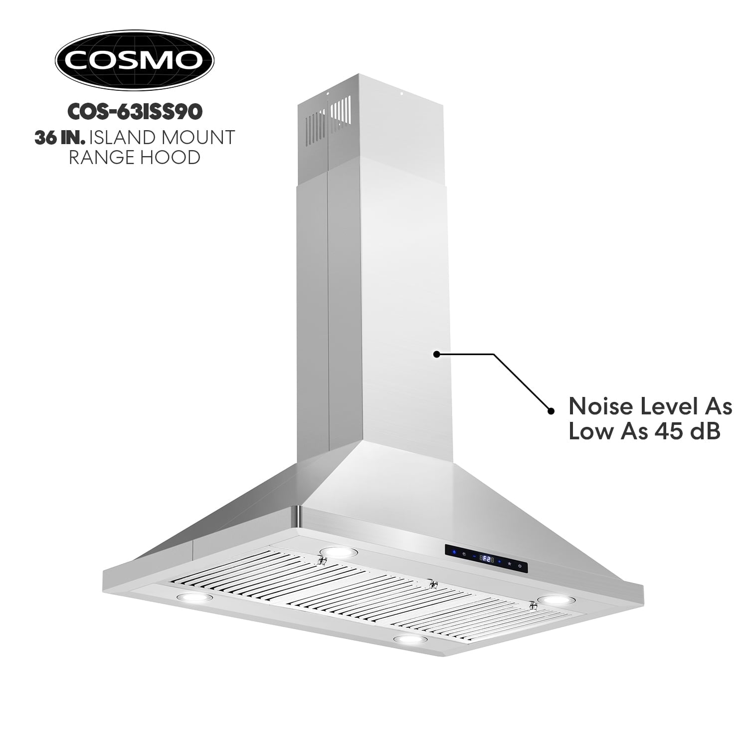 Cosmo’s 36 in. ductless Island Range Hood is in a class of its own. Coveted by kitchen design experts for its sophistication and ultra-modern aesthetic that seamlessly complements a variety of kitchen designs. The 63ISS90-DL Island Range Hood includes modern features like an efficient 380 CFM centrifugal motor, soft touch digital controls to operate the 3-speed fan, and Cosmo ARC-FLOW permanent filters that are dishwasher-safe and trap grease and oil better than any other filter. 4 x 2W LED lighting will illuminate your cooktop. Includes a 3-prong power plug for easy use. Part of the Lumin Collection bringing enhanced functionality and design, offering a well-rounded option for those looking for more convenience and style in an appliance.