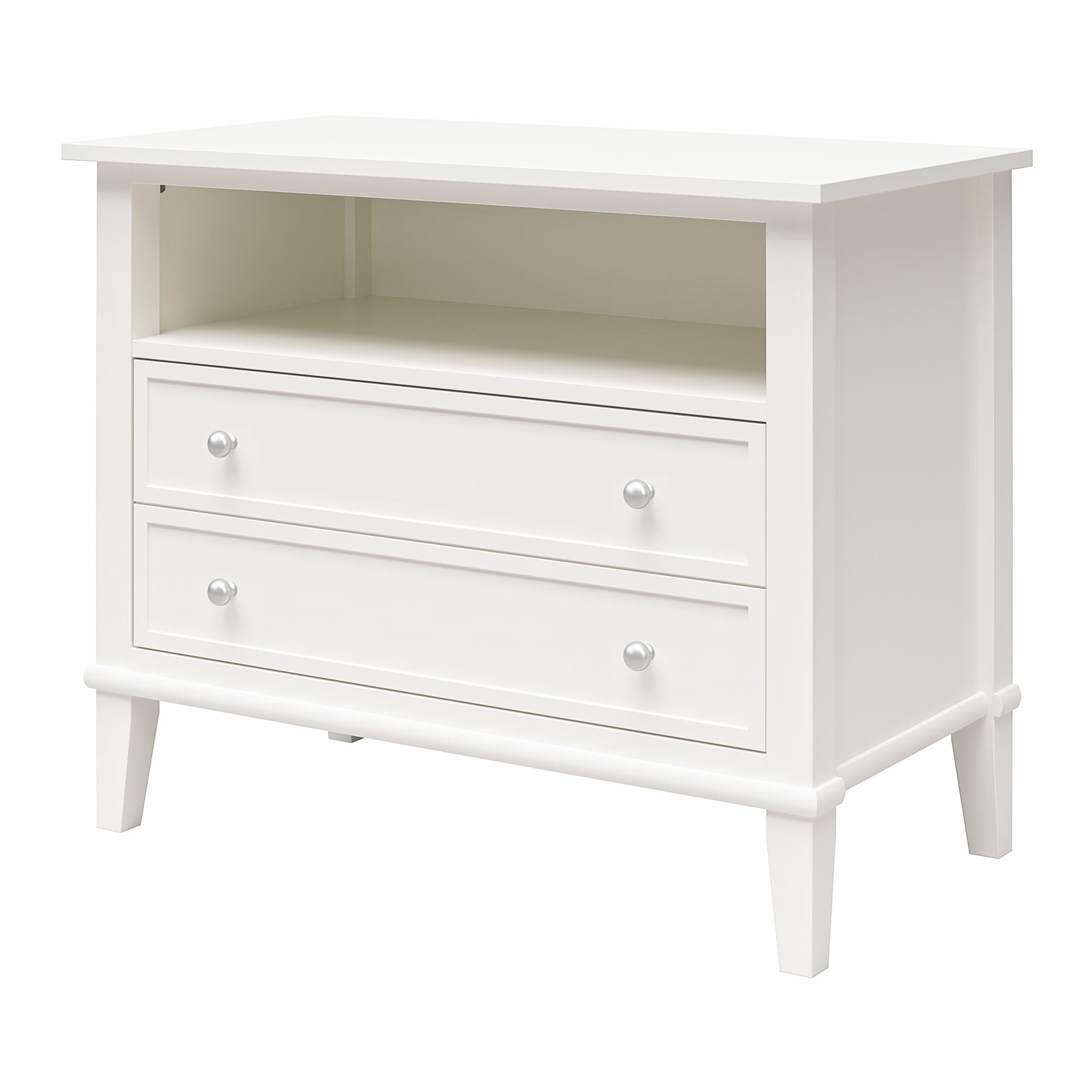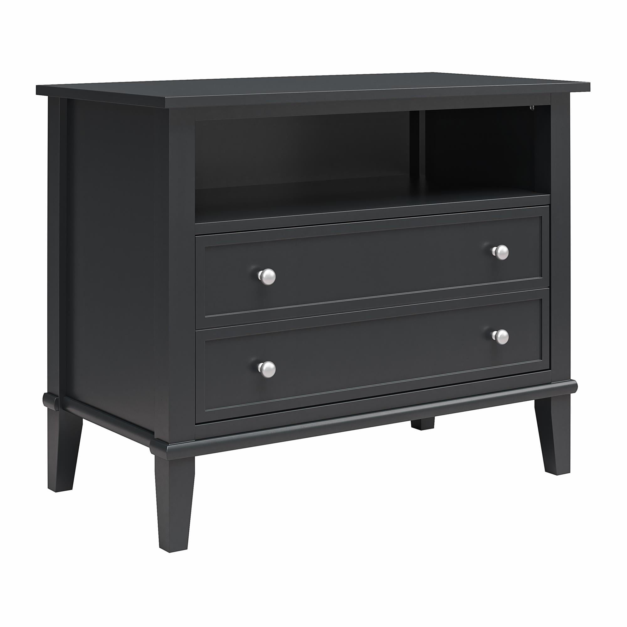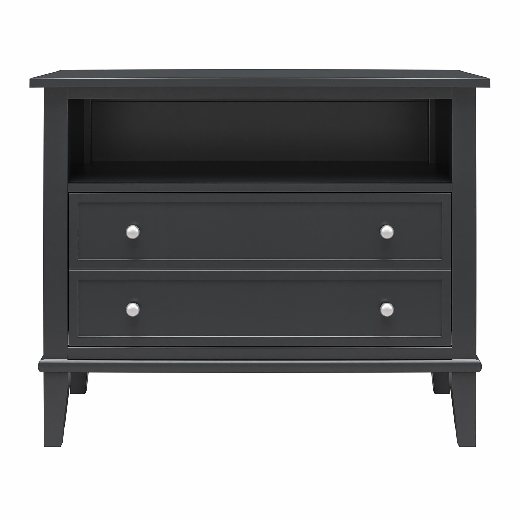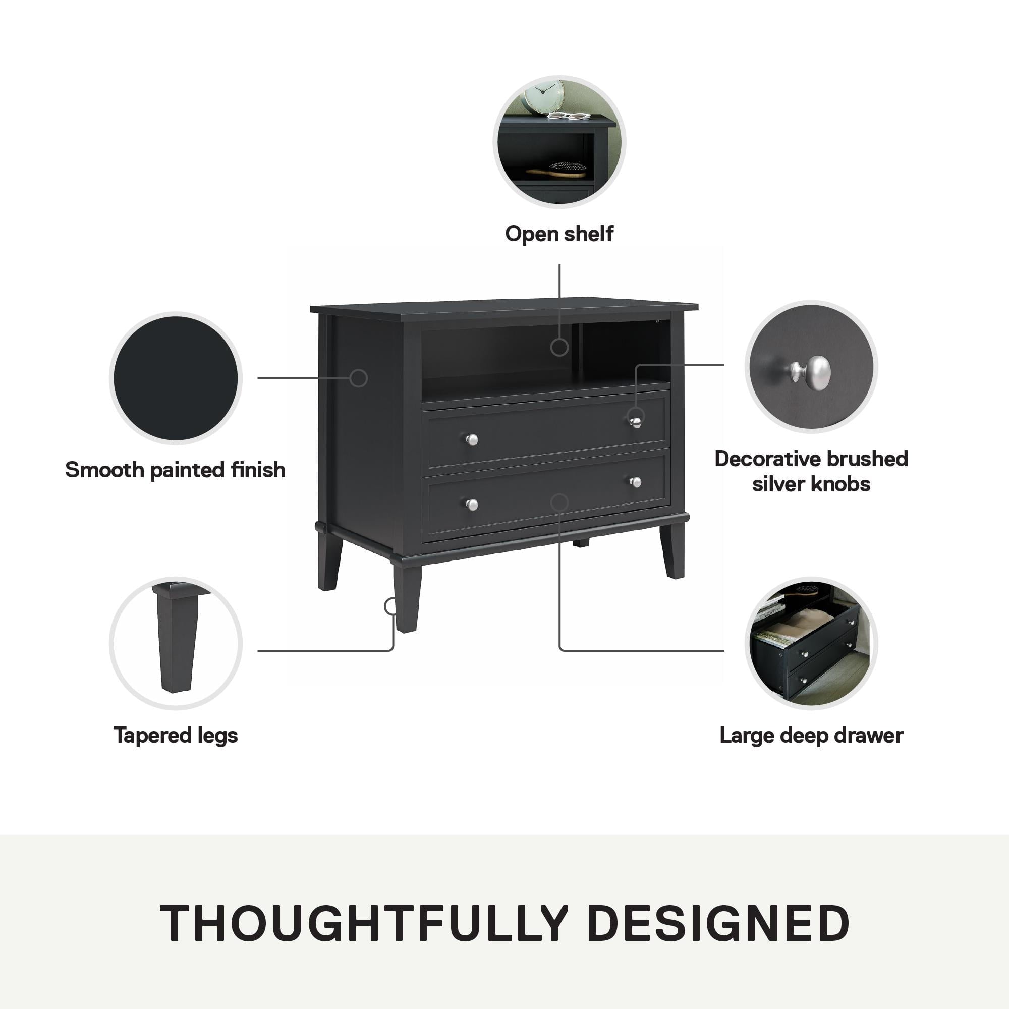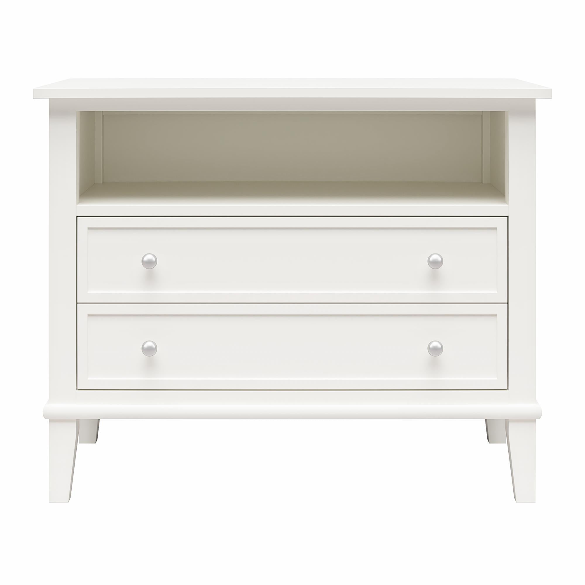 Transform your bedroom with the Ameriwood Home Franklin Wide Nightstand with Drawer. This exquisite side table combines form and function effortlessly, making it an ideal companion for your nightly routines. Crafted from high-quality painted MDF and engineered wood, this nightstand promises durability and enduring beauty. Choose from a variety of colors to perfectly match your bedroom decor. The traditional charm of this nightstand is amplified by a spacious single drawer, ingeniously crafted to give the illusion of two drawers, adding a unique element to its design. Adorned with round, brushed silver knobs, it exudes a timeless classic charm that fits seamlessly into any transitional, country, or classic style. The legs, tapered and slightly splayed, add a touch of elegance, ensuring it enhances the overall look of your space. The nightstand is finished on all sides, making it versatile enough to double as an accent table in your living room. The open shelf above the drawer provides ample space for displaying decorative items or storing your favorite books. The nightstand ships in one flat box and requires assembly by two adults. Dimensions and weight: 29.7″ W x 15.7″ D x 24″ H; 54.1 lbs.