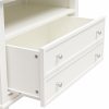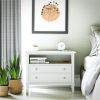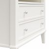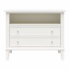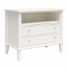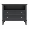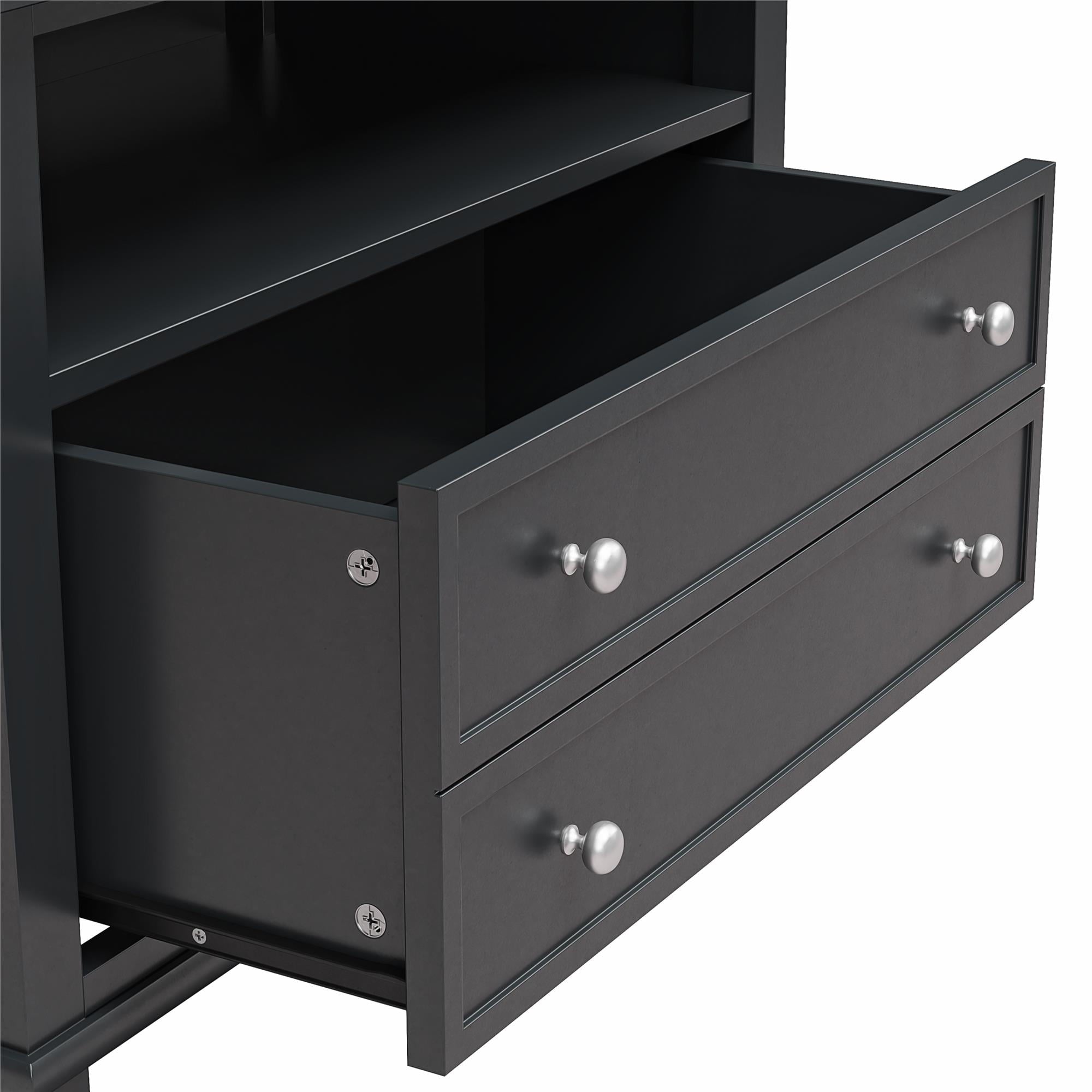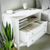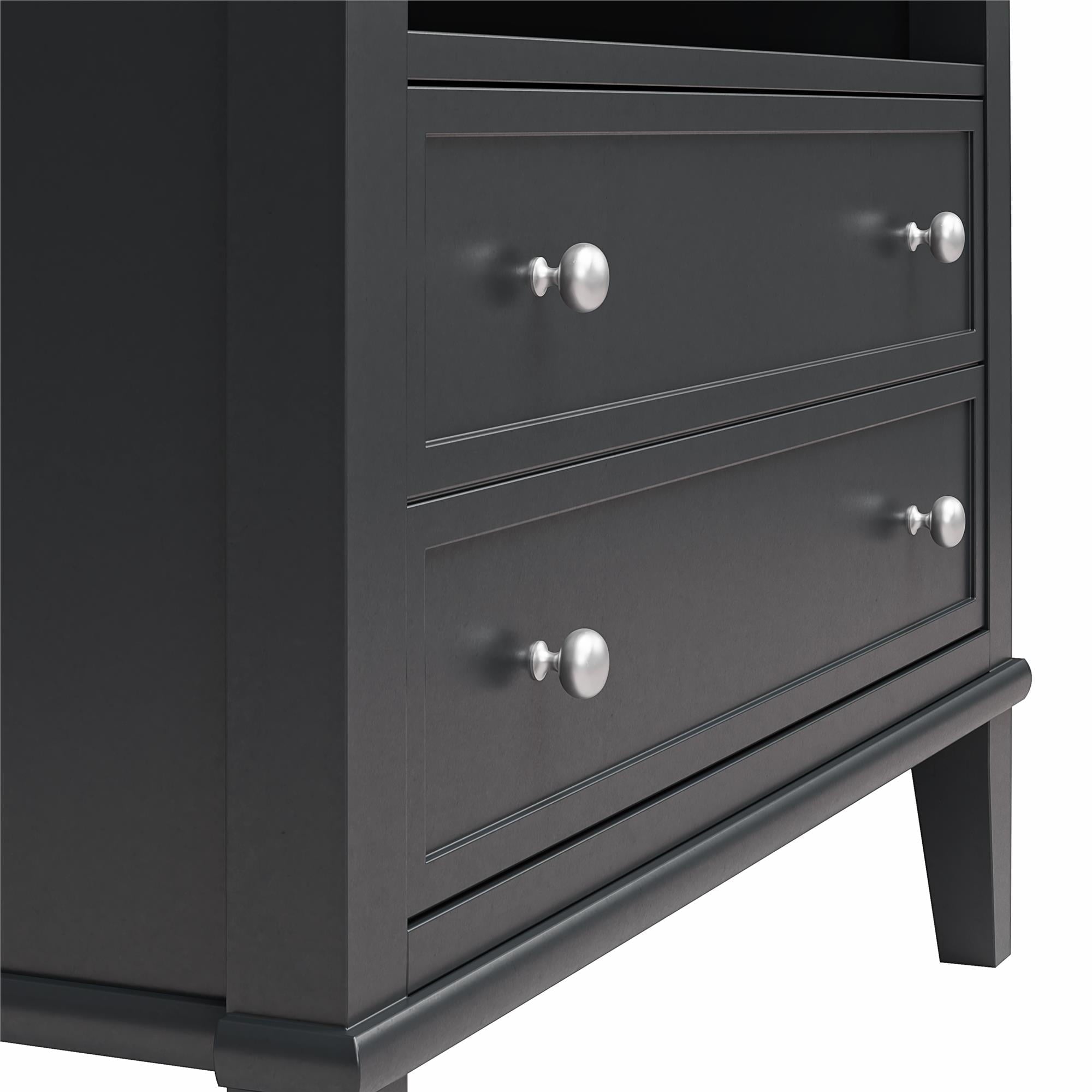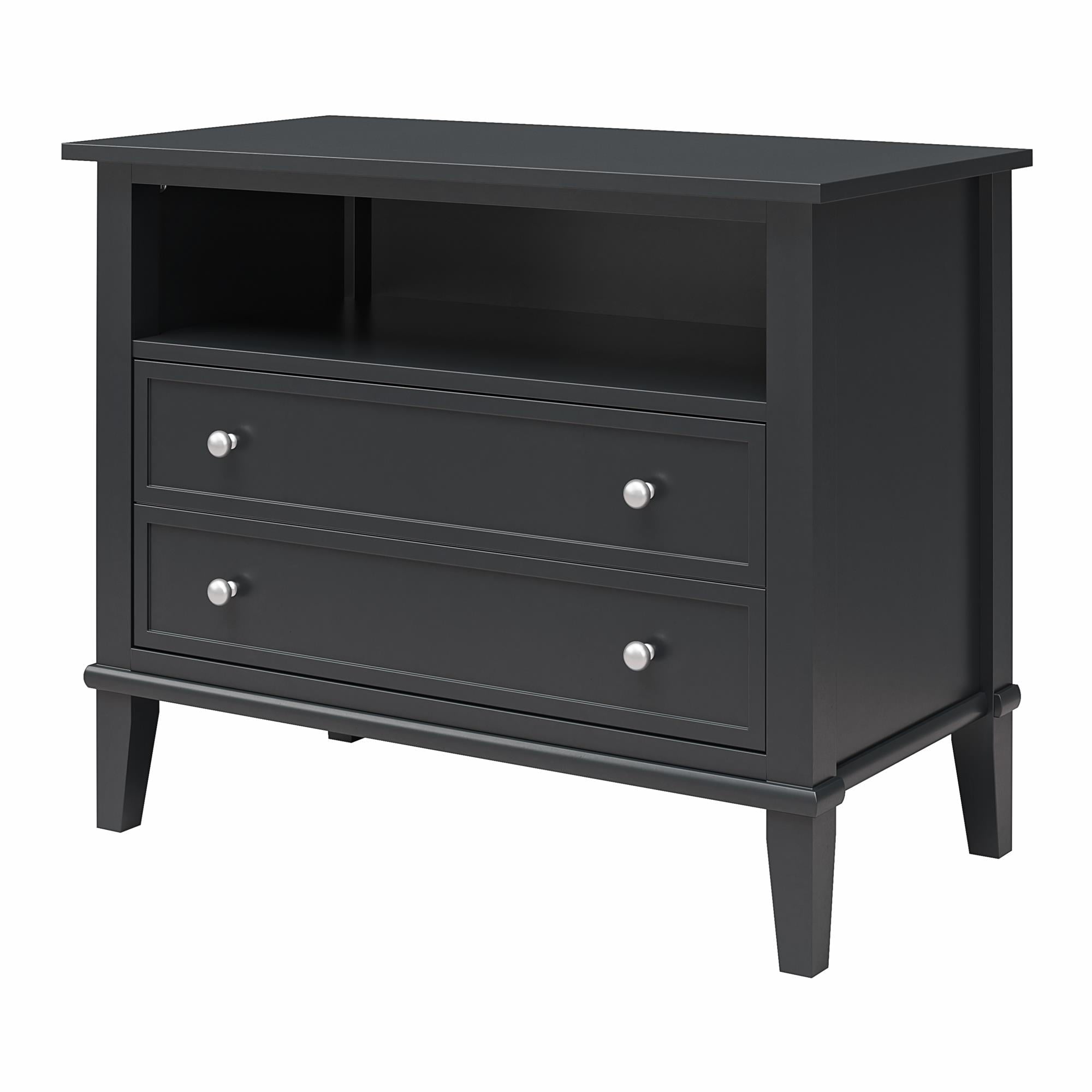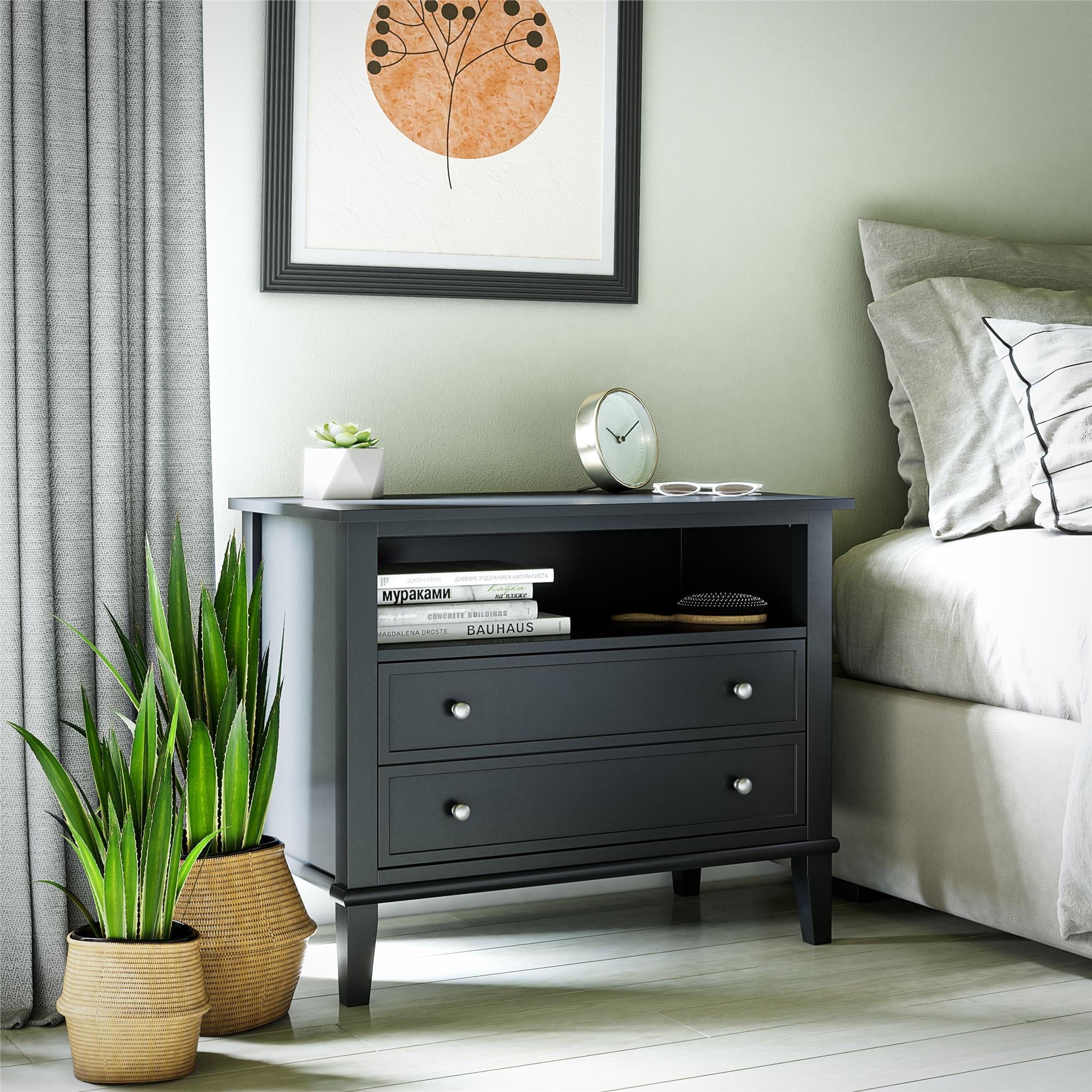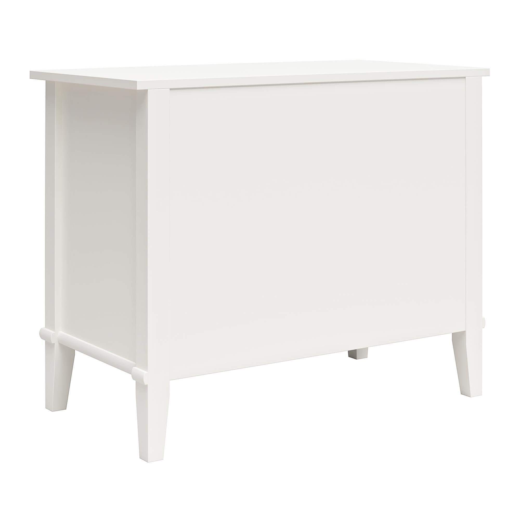 Transform your bedroom with the Ameriwood Home Franklin Wide Nightstand with Drawer. This exquisite side table combines form and function effortlessly, making it an ideal companion for your nightly routines. Crafted from high-quality painted MDF and engineered wood, this nightstand promises durability and enduring beauty. Choose from a variety of colors to perfectly match your bedroom decor. The traditional charm of this nightstand is amplified by a spacious single drawer, ingeniously crafted to give the illusion of two drawers, adding a unique element to its design. Adorned with round, brushed silver knobs, it exudes a timeless classic charm that fits seamlessly into any transitional, country, or classic style. The legs, tapered and slightly splayed, add a touch of elegance, ensuring it enhances the overall look of your space. The nightstand is finished on all sides, making it versatile enough to double as an accent table in your living room. The open shelf above the drawer provides ample space for displaying decorative items or storing your favorite books. The nightstand ships in one flat box and requires assembly by two adults. Dimensions and weight: 29.7″ W x 15.7″ D x 24″ H; 54.1 lbs.