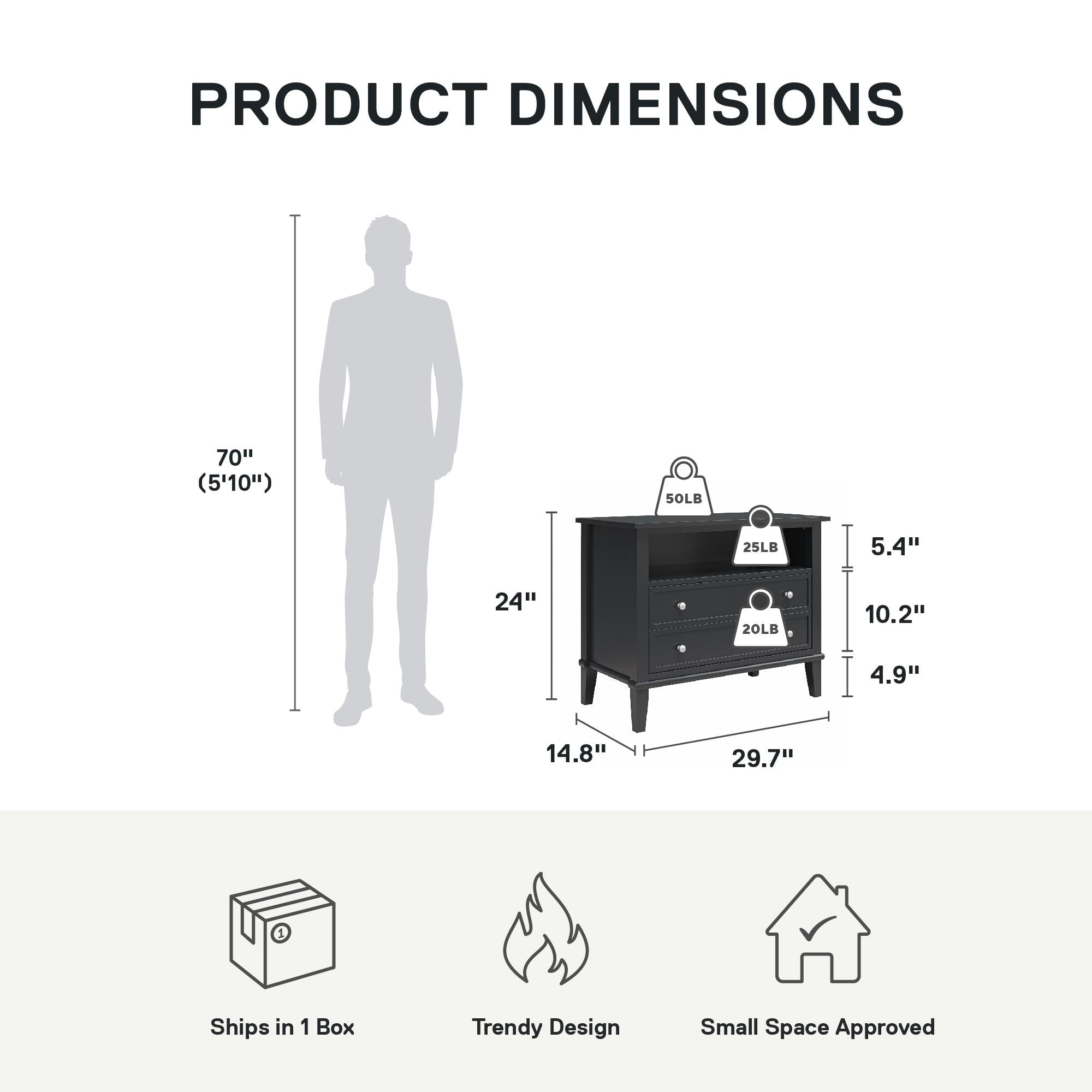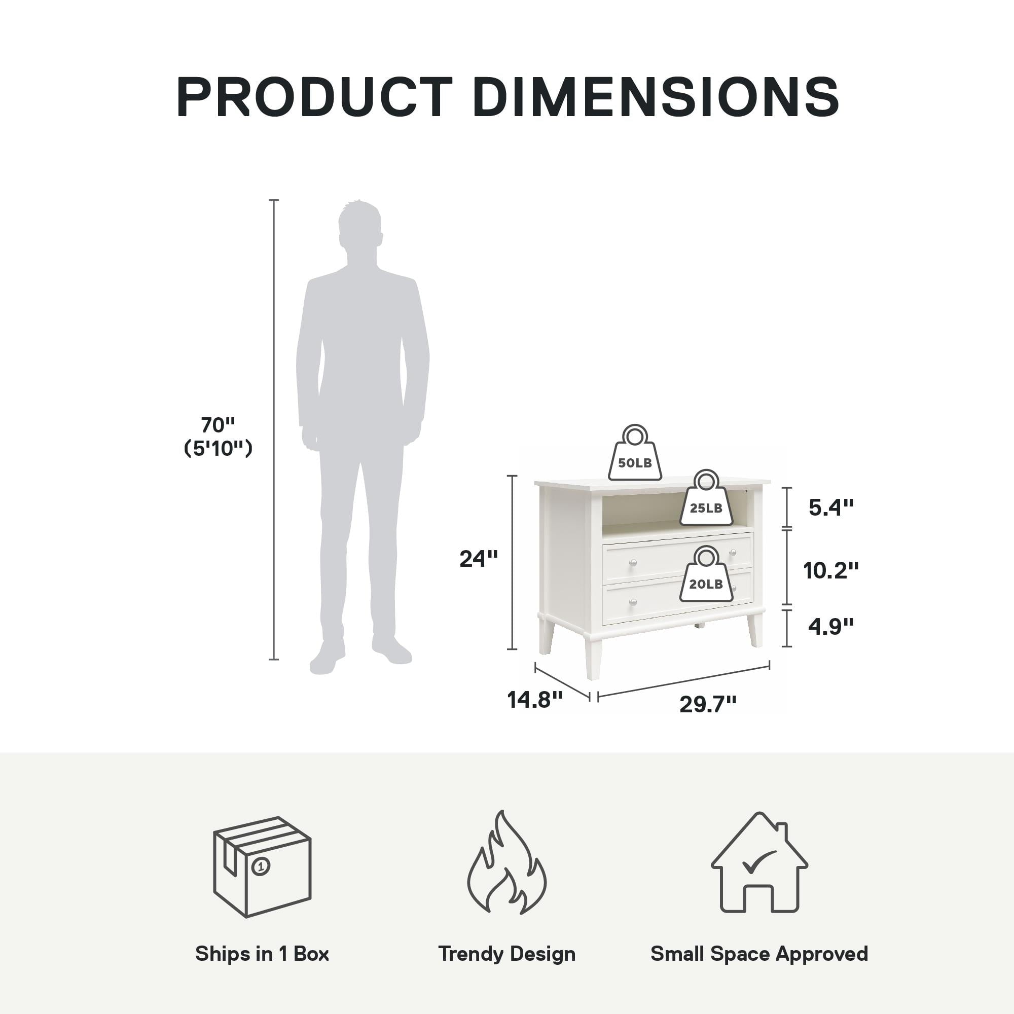 - PRODUCT DETAILS: The Nightstand ships in one flat box and requires assembly; Dimensions and weight: 29.7″ W x 15.7″ D x 24″ H; 54.1 lbs.; Max weights: Top: 50 lbs.; Shelf: 25 lbs.; Drawer: 20 lbs.