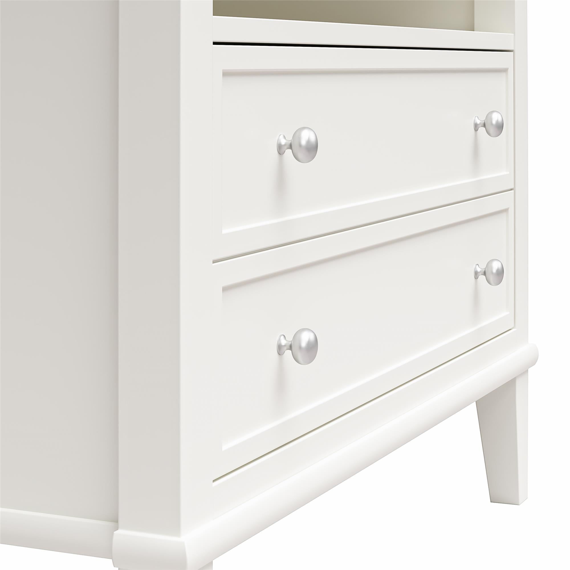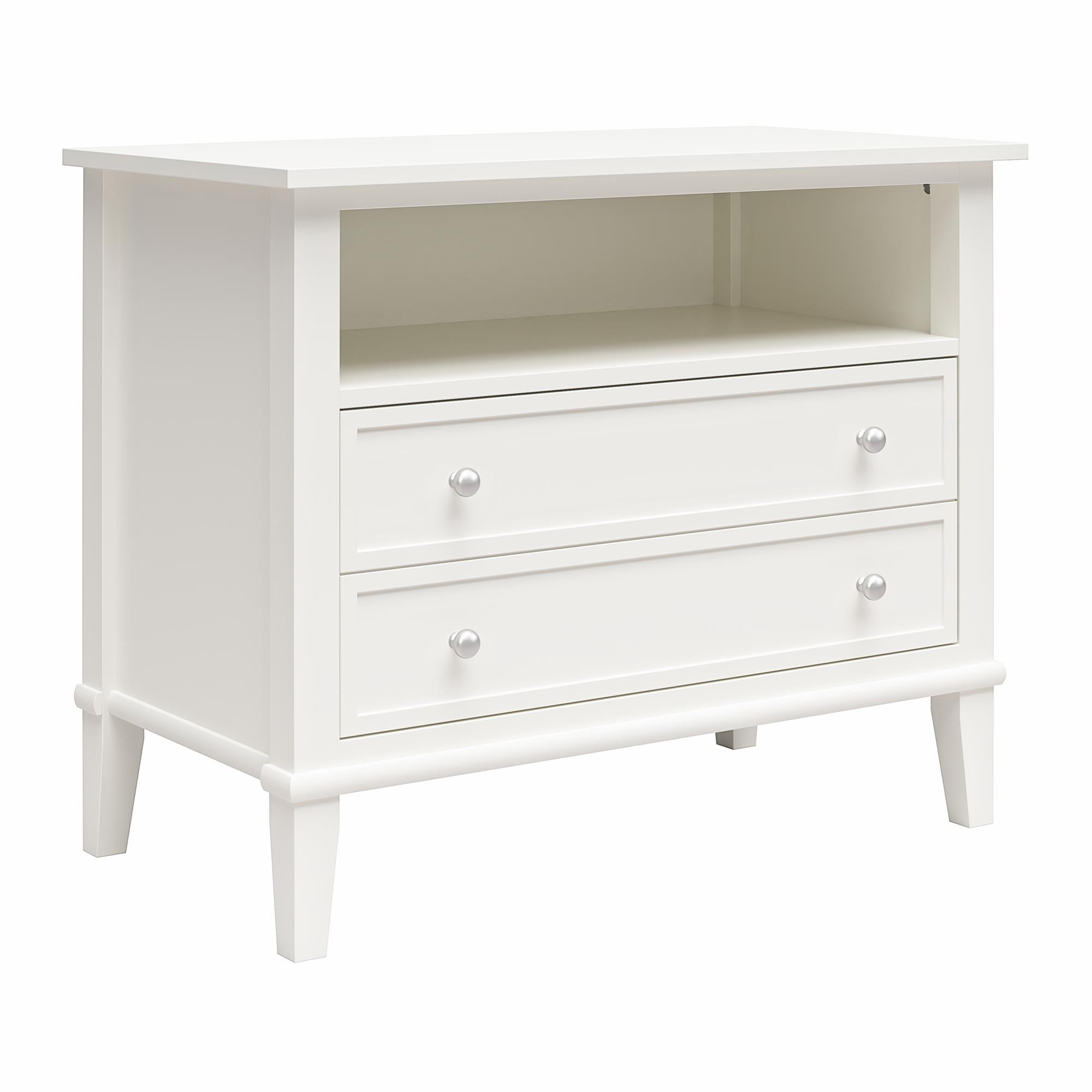 - CLASSIC CHARM: This nightstand blends traditional aesthetics with tapered legs, an open shelf, round brushed silver knobs, and one spacious drawer cleverly designed to mimic two