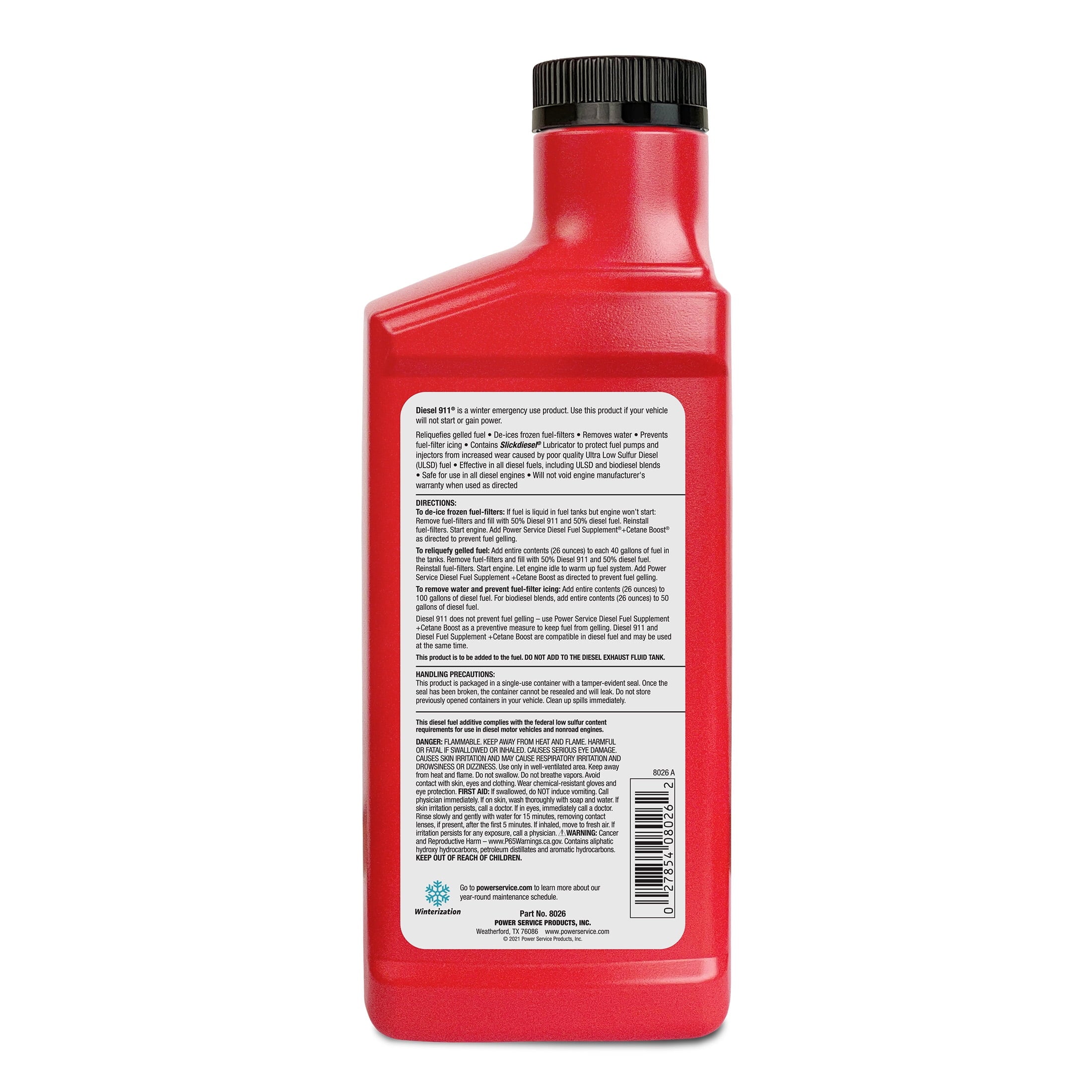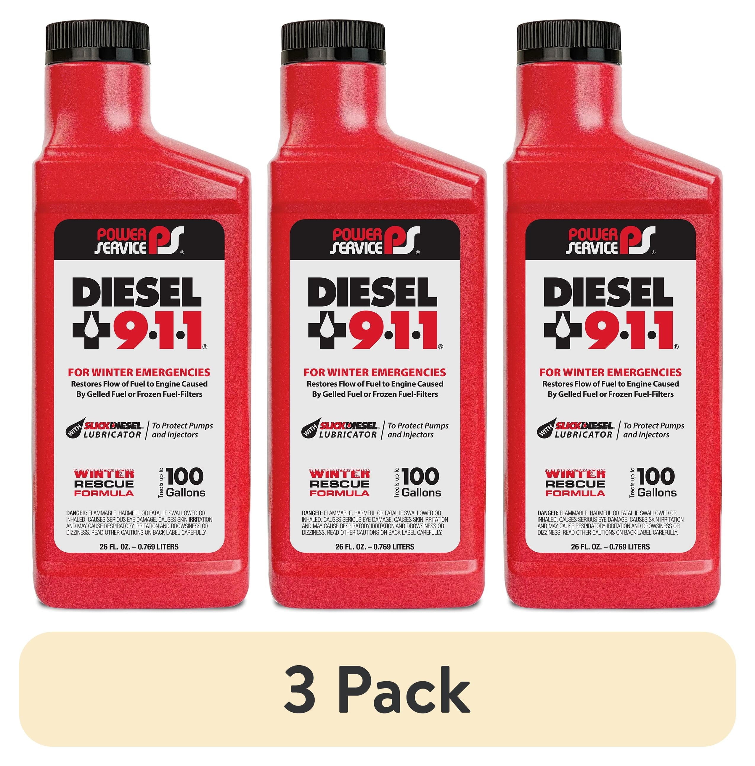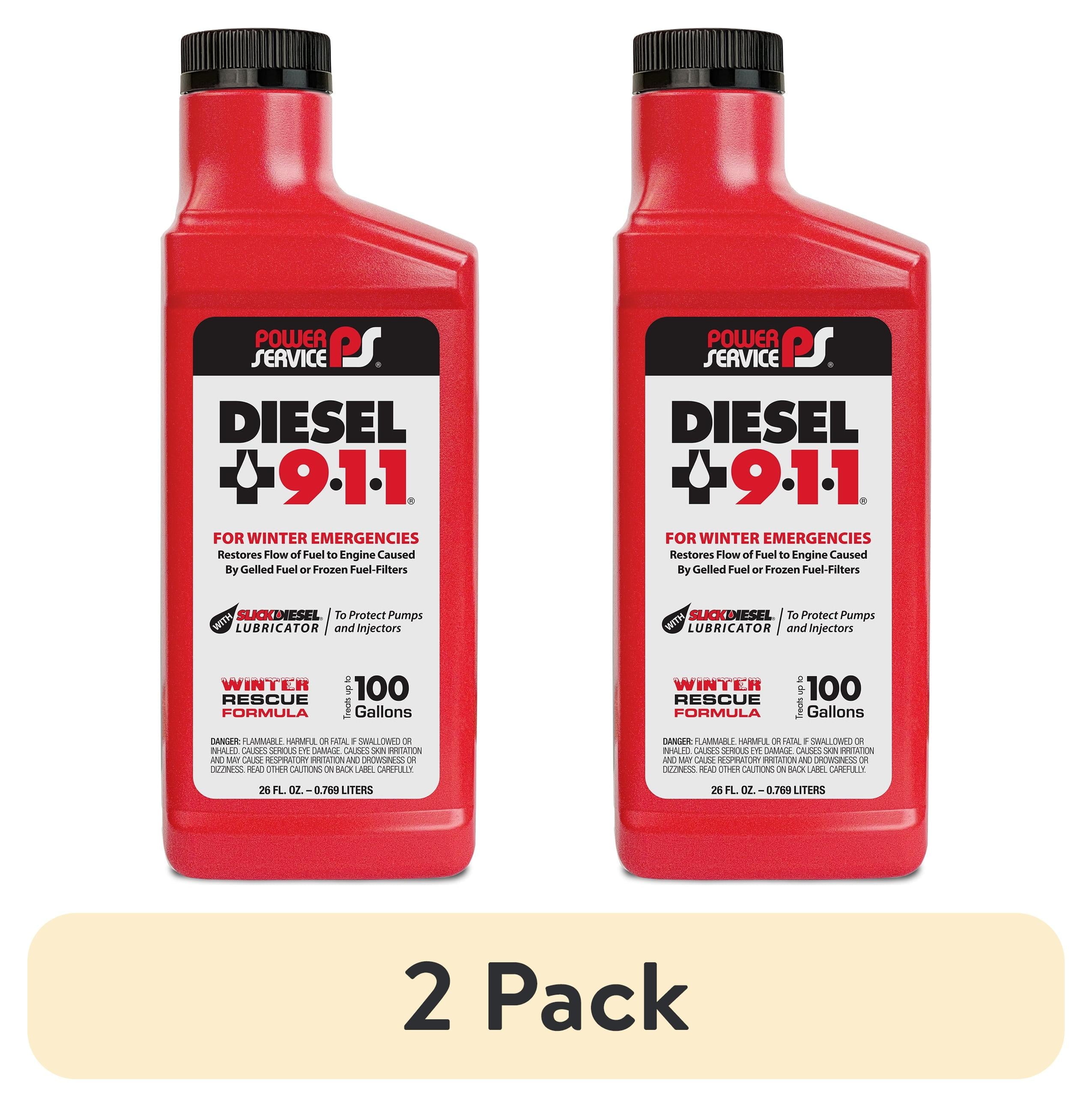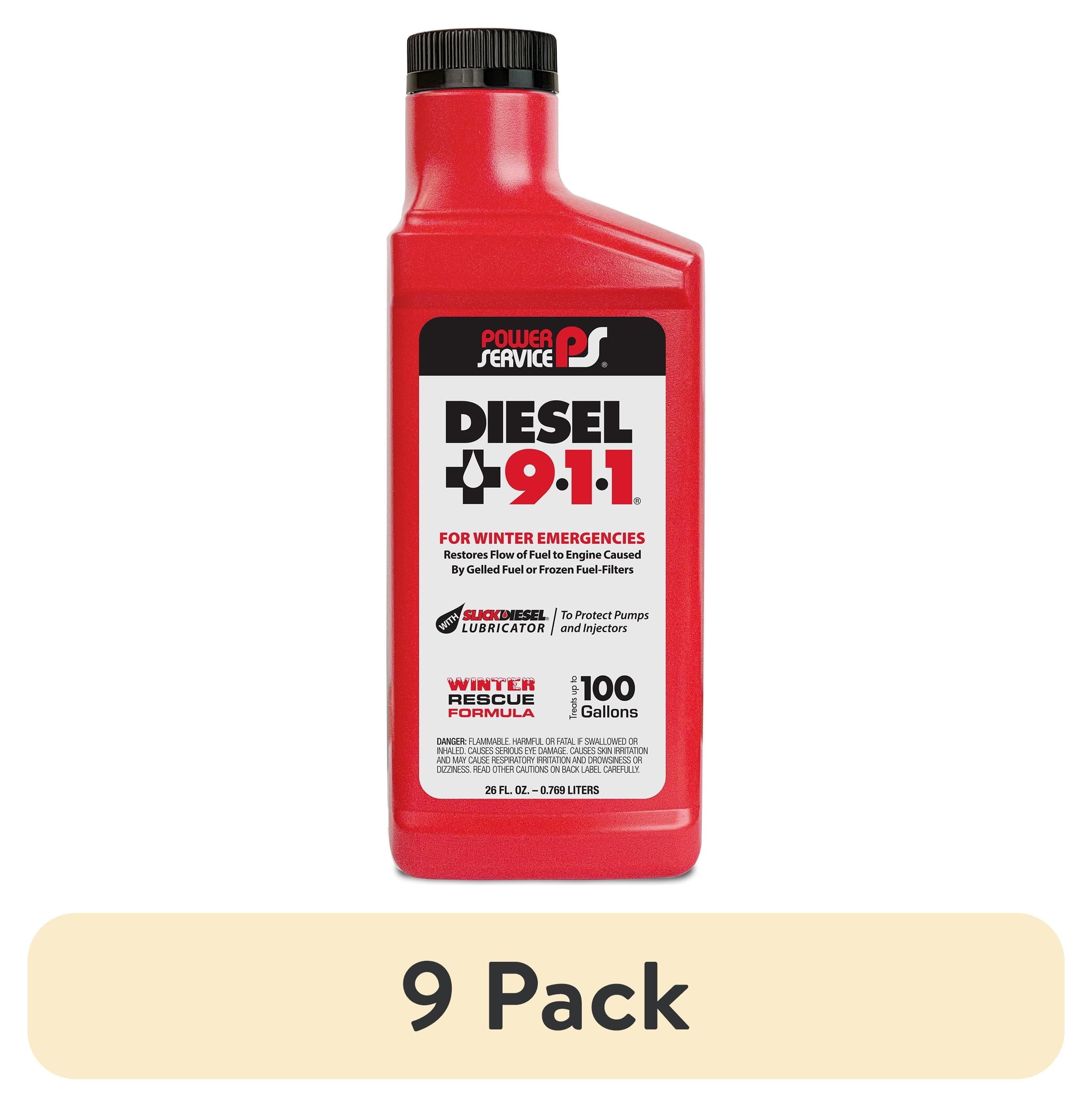 Diesel 911 is a winter emergency use product. This Winter Rescue Formula reliquefies gelled fuel and de-ices frozen fuel-filters to restore the flow of diesel fuel to an engine.