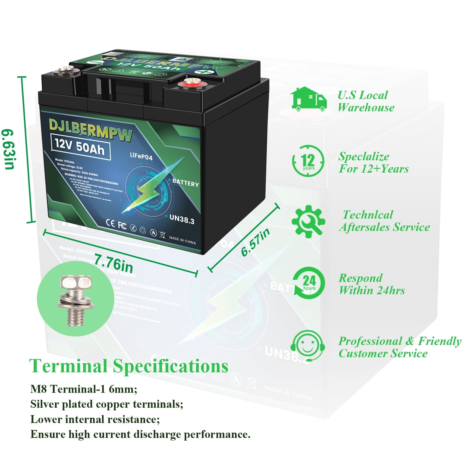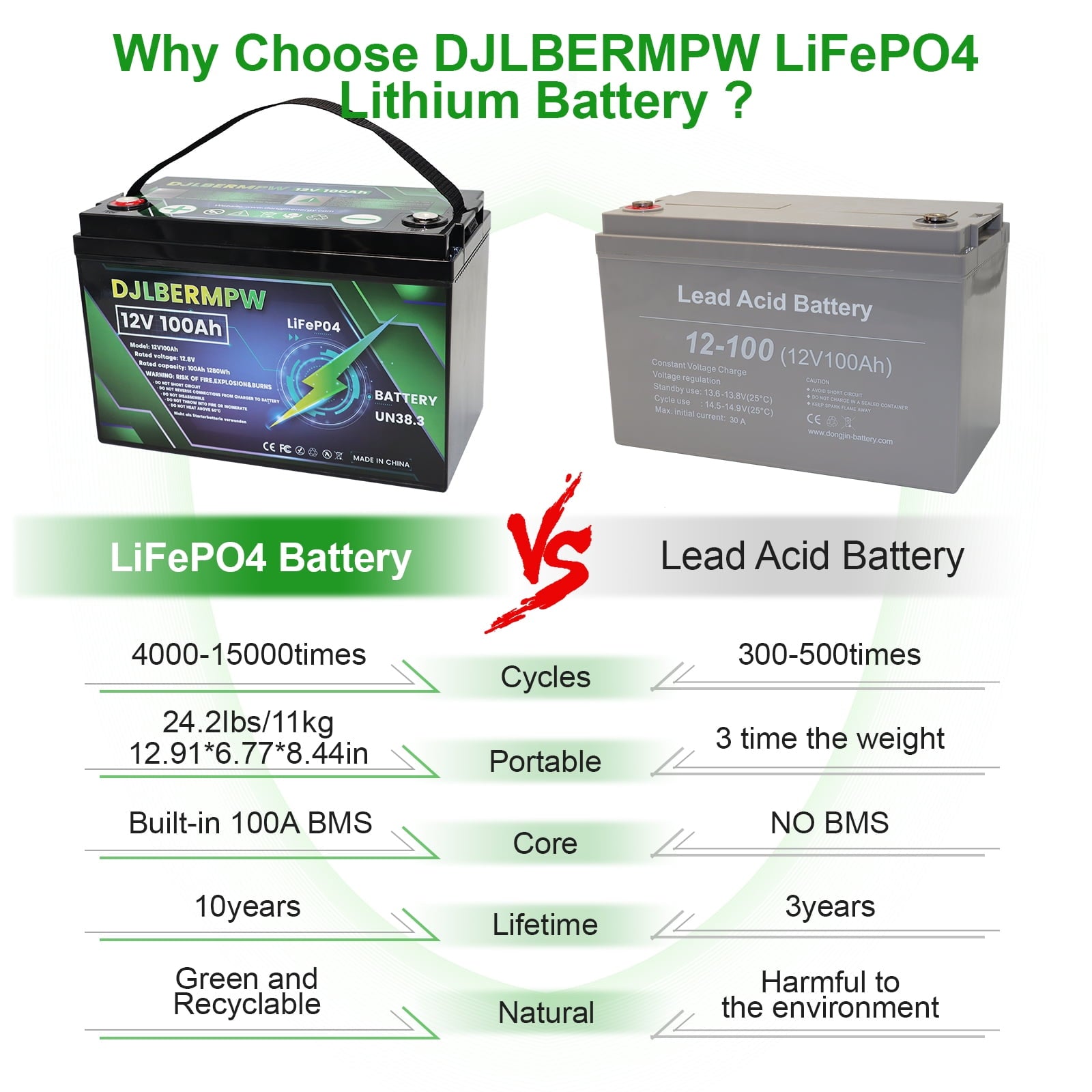 DJLBERMPW has been deeply involved in the battery industry for more than 30 years, and is committed to providing high-quality lead-acid batteries and lithium batteries, etc. 12V 100AH ​​LiFePO4 battery is light and portable, easy to install, with a service life of 4000-15000 deep cycles, built-in 100A BMS, with overcharge, over-discharge, over-current, short-circuit protection, etc. It is recommended to use a LiFePO4 charger with activation function. Please feel free to contact us for any questions.