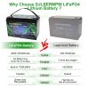 • 【Lightweight Compact Design】12V 100Ah LiFePO4 battery weighs 24.2 pounds, which is only 1/3 of the weight of the lead-acid battery of the same capacity, making it lighter and easier to move or carry. And LiFePO4 batteries are fully charged faster and more convenient to use.