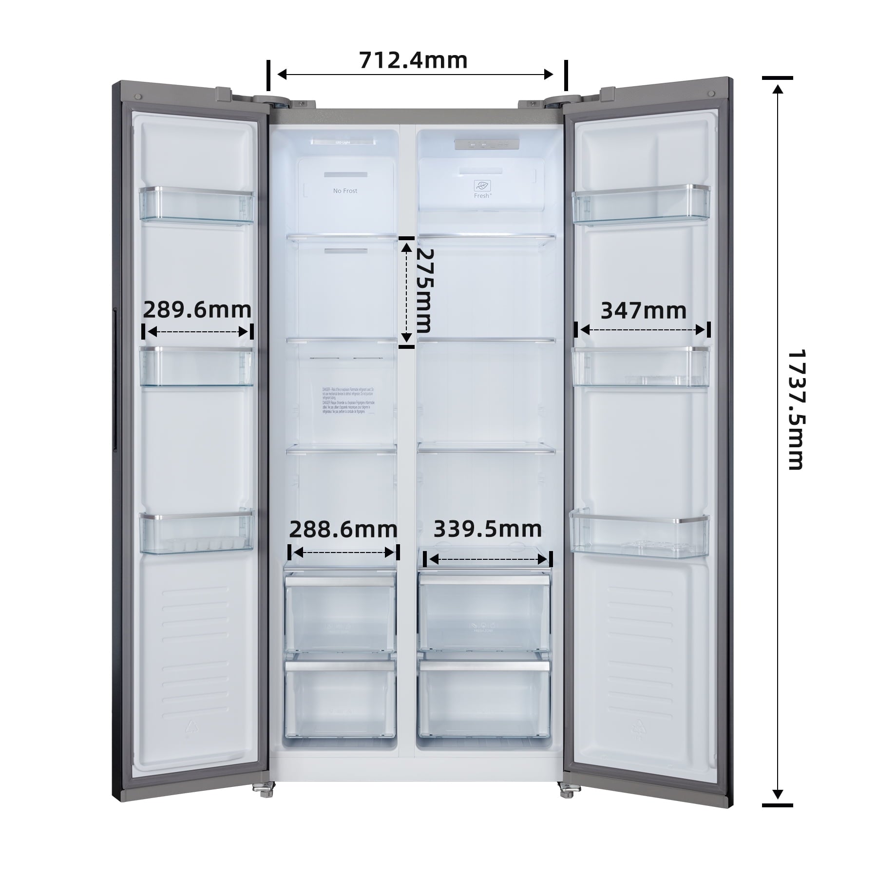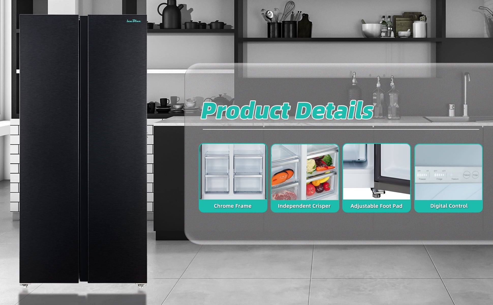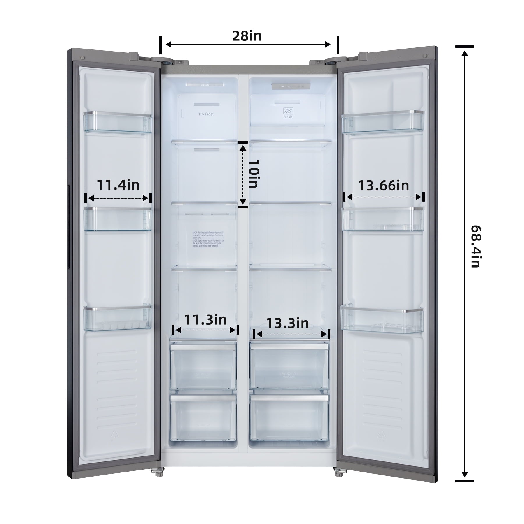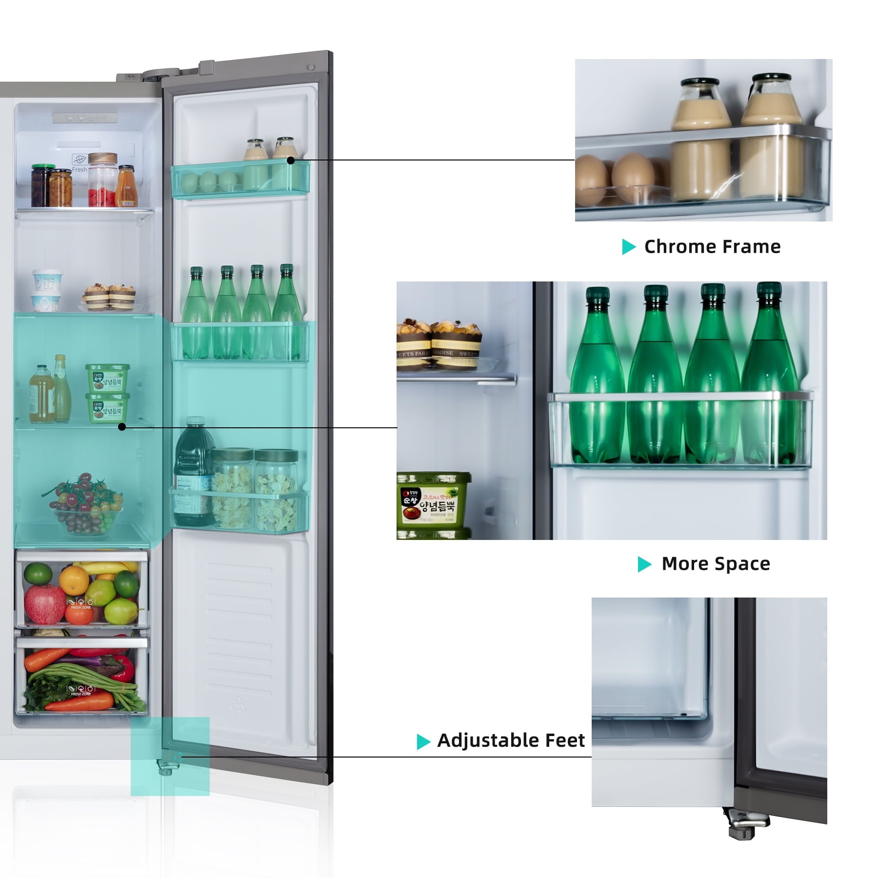 Features chrome-plated shelves, drawers, and door bins, enhancing durability and corrosion resistance. The reflective surfaces amplify interior brightness, while glide mechanisms enable smooth adjustment for oversized items.