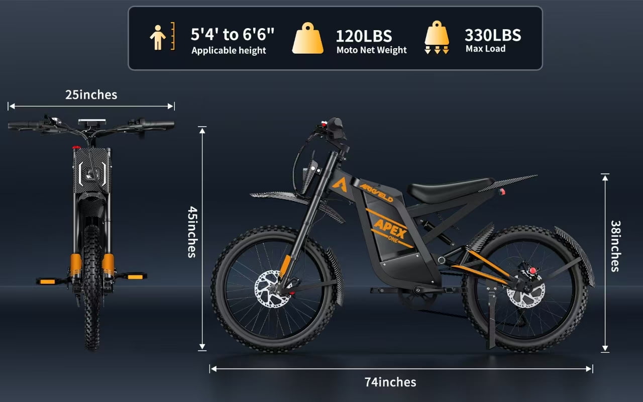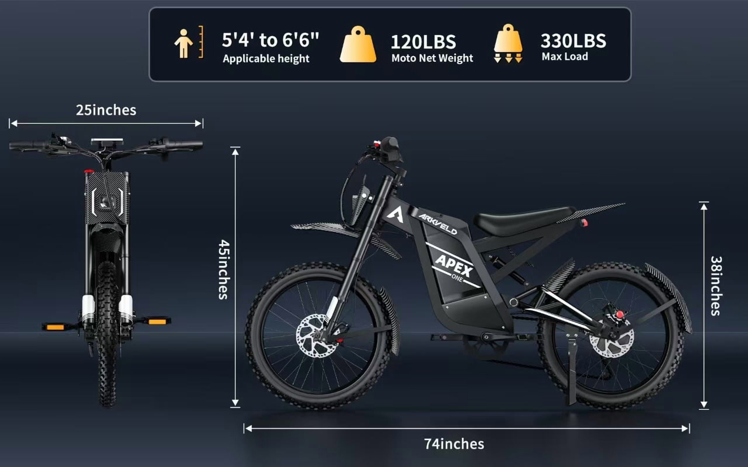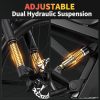 - 【Full Front suspension and hydraulic Dual Brakes】electric dirt bike Smooth ride with 5-level suspension & dual disc brakes. Strong front fork shock absorbers, seat shock absorber, and puncture-resistant 25Inches fat tires. Reliable braking on steep slopes & rugged terrain with front disc brakes, rear hydraulic shock absorber. Hydraulic dual brakes reduce braking distance by 50% even in wet conditions